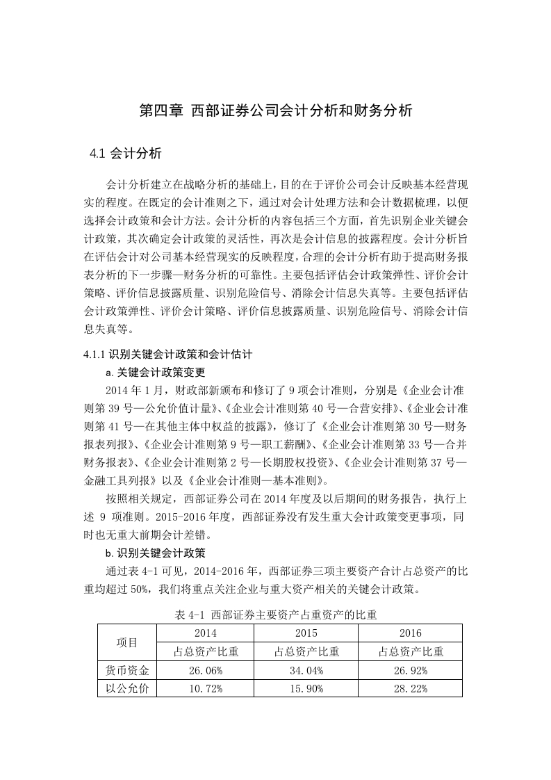 第四章西部证券公司会计分析和财务分析4.1会计分析会计分析建立在战略分析的基础上,目的在于评价公司会计反映基本经营现实的程度。在既定的会计准则之下,通过对会计处理方法和会计数据梳理,以便选择会计政策和会计方法。会计分析的内容包括三个方面,首先识别企业关键会计政策,其次确定会计政策的灵活性,再次是会计信息的披露程度。会计分析旨在评估会计对公司基本经营现实的反映程度,合理的会计分析有助于提高财务报表分析的下一步骤一财务分析的可靠性。主要包括评估会计政策弹性、评价会计策略、评价信息披露质量、识别危险信号、消除会计信息失真等。主要包括评估会计政策弹性、评价会计策略、评价信息披露质量、识别危险信号、消除会计信息失真等。4.1.1识别关键会计政策和会计估计a.关键会计政策变更2014年1月,财政部新颁布和修订了9项会计准则,分别是《企业会计准则第39号一公允价值计量》、《企业会计准则第40号一合营安排》、《企业会计准则第41号一在其他主体中权益的披露》,修订了《企业会计准则第30号一财务报表列报》、《企业会计准则第9号一职工薪酬》、《企业会计准则第33号一合并财务报表》、《企业会计准则第2号一长期股权投资》、《企业会计准则第37号一金融工具列报》以及《企业会计准则一基本准则》。按照相关规定,西部证券公司在2014年度及以后期间的财务报告,执行上述9项准则。2015-2016年度,西部证券没有发生重大会计政策变更事项,同时也无重大前期会计差错。b.识别关键会计政策通过表4-1可见,2014-2016年,西部证券三项主要资产合计占总资产的比重均超过50%,我们将重点关注企业与重大资产相关的关键会计政策。表4-1西部证券主要资产占重资产的比重201420152016项目占总资产比重占总资产比重占总资产比重货币资金26.06%34.04%26.92%以公允价10.72%15.90%28.22%值计量且其变动计入当期损益的金融资产融出资金15.24%12.70%9.94%合计52.02%62.64%65.08%1.资产分类西部证券基于风险管理和投资策略等原因,对金融资产进行分类,将金融资产划分为四类:以公允价值计量且其变动计入当期损益的金融资产、持有至到期投资、贷款和应收账款以及可供出售金融资产。2.公允价值的确定对于由活跃市场的金融资产,比如股票、基金等,西部证券以活跃市场中的公开报价确认资产的公允价值:对于不存在活跃市场的金融资产,比如非公开发行的带有锁定期的股票,西部证券根据审慎的原则,采用合理的技术进行估值。3.减值测试在资产负债表日,西部证券对金融资产的账面价值进行检查,有客观证据表明资产发生减值的,按照资产的所属类别,计提减值准备,以公允价值计量且其变动计入当期损益的金融资产除外。但,对于单项可供出售金融资产公允价值损失超过成本的50%的,或者是该资产持续下跌时间超过1年的,同样计提减值准备,确认减值损失。通过分析,西部证券关键会计政策、会计估计遵循《企业会计准则》要求,2014一2016年未发现重大前期会计差错。b.报表合并范围西部证券公司财务报表合并范围包括西部期货有限公司、西部利得基金管理有限公司及西部优势资本投资有限公司共3家二级子公司,以及本集团管理的、以自有资金参与并满足企业会计准则有关控制的结构化主体。根据公司年度审计报告,西部证券控制的结构化主题2014年2个,到2015年新增结构化主体5个,2016年增加到12个结构化主题,截至2017年6月30日,西部证券结构化主体9个。4.1.2资产分析我们对西部证券的资产从资产结构以及资产的现金含量两方面分析。a.资产结构分析表4-2:2014年四家证券公司资产结构(万元)西部证券西南证券东北证券中信证券项目金额占比金额占比占比金额货币资金753.469.651,149,013.2620.26%802.273.5023.15%10.976.082.6022.88%结算备付金569,249.08238.220.174.20%402.880.1311.83%2.504,705.125.22%融出资金440,762.9315.24%837,491.3014.77%757,352.0921.85%7.413.525.6215.48%以公允价值加量且310,030.3510.72%1,485,455.6826.19%709,771.9920.48%12,618,528.7826.31%1.52%买入返售金融资产520,285.0217.99%846,739.0014.93%204,144.805.89%4,286,289.548.94%应收账款6.498.180.22%11.480.950.20%0.15%3.27%应收利息13,219.920.46%33,210.500.59%9,434.700.27%315,256.260.66%存出保证金28,049.250.97%80,735.051.42%93,565.092.70%335,309.560.70%可供出售金融资产199,719.666.91%724,926.0912.78%319,077.739.21%4,883,600.9410.18%持有至到期投资5.000.000.17%14,258.460.03%长期股权投资0.04%0.29%34,543.021.00%396.199.590.83%投资性房地产:4.933.290.09%1,468.110.04%7,369.440.02%固定资产0.58%29,471.150.52%69,868.502.02%98,249.840.20%在建工程4,154.370.14%9,953.410.18%23.982.550.05%无形资产:12,050.050.42%17,147.490.30%9,424.230.27%188,727.490.39%商誉624.370.02%0.07%7,592.080.22%1,007,515.202.10%递廷所得税资产2.099.950.07%23,250.420.41%3,988.570.11%259,628.540.54%其他资产:8,385.530.29%158.626.762.80%34,995.321.01%336,871.250.70%资产总计2,891.525.29100.00%5.671.355.52100.00%100.00%100.00%92由表4-2我们可知,四家证券公司的流动资产占总资产的比重大,其中,货币资金在四家证券公司中占比均超过20%。在总资产规模上,中信证券高达47,962,645.02万元,比西部证券、西南证券、东北证券三家资产的总和还要大。西部证券资产总额达2,891,525.29万元,货币资金占比26.06%,高于其余三家。其中,金融资产账面价值516,248.17万元,占总资产的17.85%。西部证券固定资产和在建工程在总资产中占