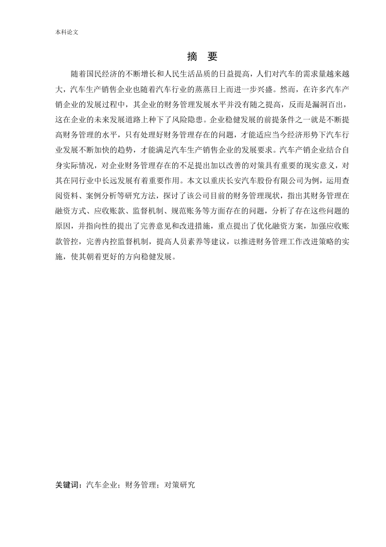 本科论文摘要随着国民经济的不断增长和人民生活品质的日益提高,人们对汽车的需求量越来越大,汽车生产销售企业也随着汽车行业的蒸蒸日上而进一步兴盛。然而,在许多汽车产销企业的发展过程中,其企业的财务管理发展水平并没有随之提高,反而是漏洞百出,这在企业的未来发展道路上种下了风险隐患。企业稳健发展的前提条件之一就是不断提高财务管理的水平,只有处理好财务管理存在的问题,才能适应当今经济形势下汽车行业发展不断加快的趋势,才能满足汽车生产销售企业的发展要求。汽车产销企业结合自身实际情况,对企业财务管理存在的不足提出加以改善的对策具有重要的现实意义,对其在同行业中长远发展有着重要作用。本文以重庆长安汽车股份有限公司为例,运用查阅资料、案例分析等研究方法,探讨了该公司目前的财务管理现状,指出其财务管理在融资方式、应收账款、监督机制、规范账务等方面存在的问题,分析了存在这些问题的原因,并指向性的提出了完善意见和改进措施,重点提出了优化融资方案,加强应收账款管控,完善内控监督机制,提高人员素养等建议,以推进财务管理工作改进策略的实施,使其朝着更好的方向稳健发展。关键词:汽车企业:财务管理:对策研究本科论文AbstractWith the continuous growth of economy and the increasing improvement of people'squality of life,people's demand for automobiles is growing.Automobile production and salesenterprises are also thriving with the vigorous development of the automobileindustry.However,in the development process of many automobile production and marketingenterprises the development level of their financial management has not been improved,but isfull of loopholes.Which has laid a major hidden danger in the future development of theenterprise.The improvement of enterprise financial management level is the prerequisite forthe long-term and stable development of the company.As an important component ofenterprise management,financial management directly affects the business results of theenterprise and plays an important role in the development of the enterprise.Only by solvingthe problems of financial management,can we cope with the trend of the continuousacceleration of the development of the automobile industry,and meet the developmentrequirements of automobile production and sales enterprises.Combining with the actualsituation of automobile production and sales enterprises,it is of great practical significance toput forward countermeasures to improve the financial management of enterprises,which playsan important role in the long-term development of the same industry.This paper takesChongqing Chang an Automobile company,it discusses the situation of the company'sfinancial management,analyzes the causes,and puts forward the improvementcountermeasures.focuses on the suggestions of widening financing channel,reducingcosts,improving personnel quality,etc,And puts forward the optimization scheme of financialmanagement.Make it develop steadily in a better direction.Key words:Automotive Enterprises;Financial management;Countermeasures study本科论文目录第1章绪论1.2国内外研究现状1.3研究目的及意义.221.3.2研究意义1.4研究内容和方法31.4.1研究内容1.4.2研究方法3第2章财务管理相关理论基础.52.1财务管理的含义52.2财务管理基本原则52.2.1现金收平衡原则2.2.2成本收益权衡原则52.2.3风险收益均衡原则…52.2.4管理和利益关系协调原则2.3财务管理主要内容.…第3章重庆长安汽车股份有限公司财务管理现状及存在的问题73.1重庆长安汽车股份有限公司简介3.2重庆长安汽车股份有限公司财务管理现状73.3重庆长安汽车股份有限公司财务管理存在的问题3.3.1融资能力薄弱…93.3.2应收账款周转期逐渐增长93.3.3财务管理内控监督体制失效.103.3.4账务处理不规范第4章重庆长安汽车股份有限公司财务管理问题存在的成因..114.】融资欠缺规划…114.2应收账款管控工作不足