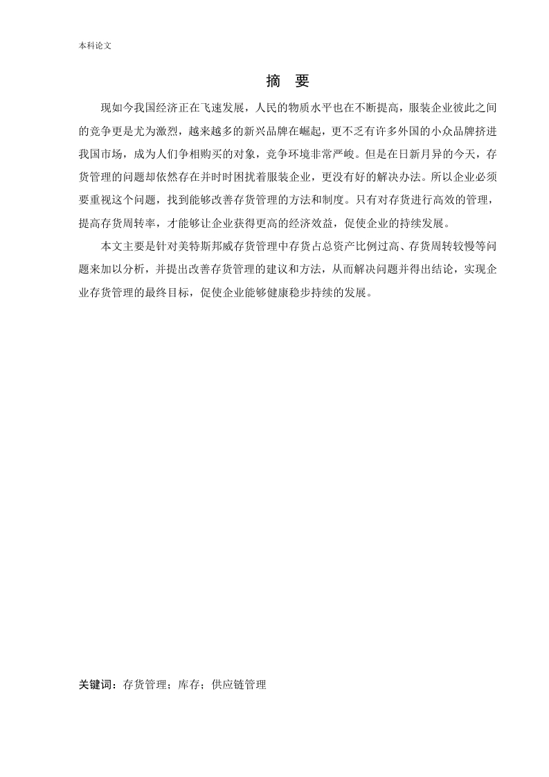 本科论文摘要现如今我国经济正在飞速发展,人民的物质水平也在不断提高,服装企业彼此之间的竞争更是尤为激烈,越来越多的新兴品牌在崛起,更不乏有许多外国的小众品牌挤进我国市场,成为人们争相购买的对象,竞争环境非常严峻。但是在日新月异的今天,存货管理的问题却依然存在并时时困扰着服装企业,更没有好的解决办法。所以企业必须要重视这个问题,找到能够改善存货管理的方法和制度。只有对存货进行高效的管理,提高存货周转率,才能够让企业获得更高的经济效益,促使企业的持续发展。本文主要是针对美特斯邦威存货管理中存货占总资产比例过高、存货周转较慢等问题来加以分析,并提出改善存货管理的建议和方法,从而解决问题并得出结论,实现企业存货管理的最终目标,促使企业能够健康稳步持续的发展。关键词:存货管理;库存:供应链管理本科论文AbstractBecause of the rapid development of our country's economy and the continuousimprovement of living standard,the competition between the clothing industry has becomemore and more fierce,more and more new brands are rising,and there are many foreignminority brands crowded into the market of our country,and the competition environment isvery severe.However,in the rapid development of today's inventory management problemsare still unchanged,and there is no good way to solve,so enterprises must recognize thisproblem,find a good inventory management methods and systems.Efficient inventorymanagement,improve inventory turnover,so that enterprises can achieve higher economicbenefits,is able to the basic guarantee of sustainable development.This paper mainly analyzes the problems of inventory backlog and long inventoryturnover days in the inventory management of Metes Bon way,Some Suggestions andmethods to improve inventory management are put forward,so as to solve the problems anddraw a conclusion,so as to achieve the ultimate goal of inventory management and promotethe healthy and stable development of enterprises.Key words:Inventory management;inventory;supply chain management本科论文目录第1章绪论…11.1研究背景与意义…1.1.1研究背景.…1.1.2研究意义…1.2国内外研究现状11.2.1国外研究现状1.2.2国内研究现状21.3研究目的…1.4研究内容和方法.…1.4.1研究内容…31.4.2研究方法第2章相关理论概述…2.1存货管理定义2.2存货管理方法.2.2.1ABC分类控制法…2.2.2MRP管理系统…2.3存货管理作用第3章美特斯邦威集团概况与存货管理存在的问题.63.1美特斯邦威集团概况…63.1.1美特斯邦威集团简介….63.1.2美特斯邦威的存货库存状况…3.2美特斯邦威存货管理存在的问题.3.2.1存货占总资产比例过高3.2.2将库存压力转移至加盟商73.2.3存货周转较慢…3.2.4存货管理不够规范.…8