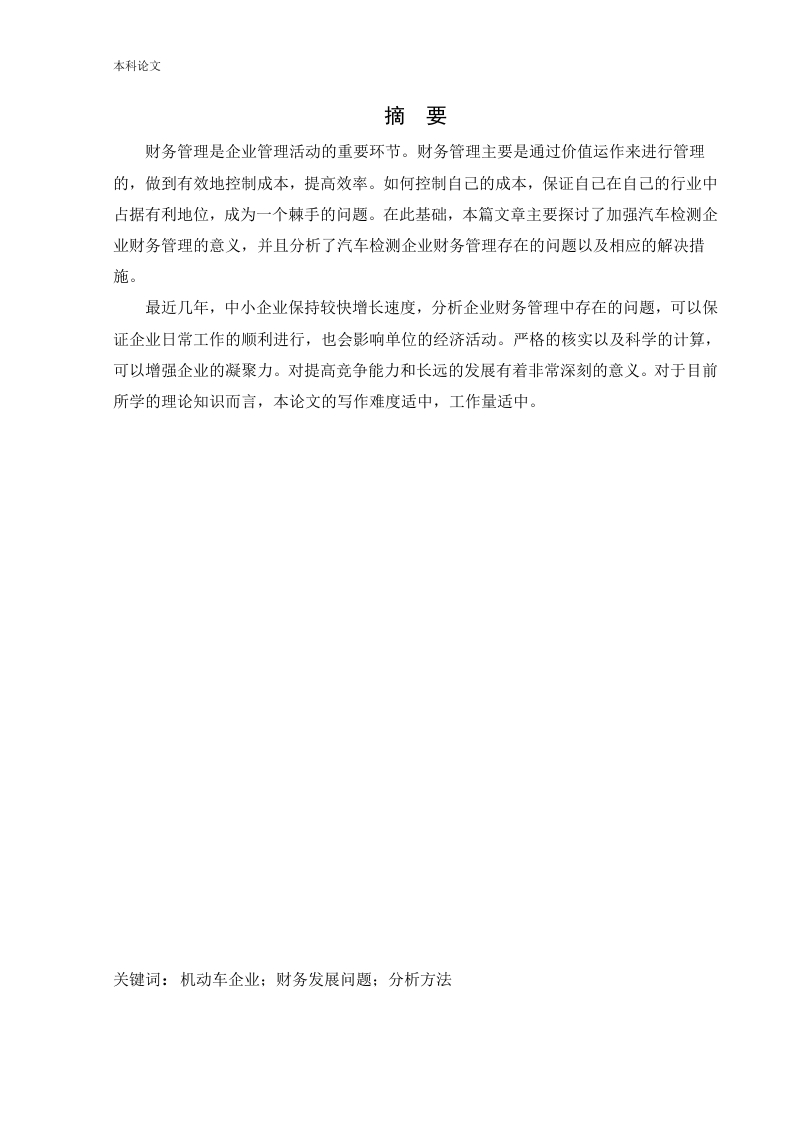 本科论文摘要财务管理是企业管理活动的重要环节。财务管理主要是通过价值运作来进行管理的,做到有效地控制成本,提高效率。如何控制自己的成本,保证自己在自己的行业中占据有利地位,成为一个棘手的问题。在此基础,本篇文章主要探讨了加强汽车检测企业财务管理的意义,并且分析了汽车检测企业财务管理存在的问题以及相应的解决措施。最近几年,中小企业保持较快增长速度,分析企业财务管理中存在的问题,可以保证企业日常工作的顺利进行,也会影响单位的经济活动。严格的核实以及科学的计算,可以增强企业的凝聚力。对提高竞争能力和长远的发展有着非常深刻的意义。对于目前所学的理论知识而言,本论文的写作难度适中,工作量适中。关键词:机动车企业:财务发展问题:分析方法本科论文AbstractThrough vaue management,we can contro cost and improve efficiency.At present,thecompetition pressure of motor vehice enterprises is increasing.How to contro their own coststo ensure that they occupy a dominant position in the industry has become a thorny probem.On this basis,this article mainly discusses the significance of strengthening the financialmanagement of automobile manufacturing enterprises,and analyzes the problems andcorresponding countermeasures in the financial management of automobile manufacturingenterprises.In recent years,sma and medium-sized enterprises have maintained a rapidgrowth rate.The anaysis of the probems existing in the financia management of an enterprisecan ensure the smooth deveopment of the daiy work of the enterprise and the strictverification and scientific cacuation of the economic activities of the unit.We wi strengthenthe economic strength of sma and medium-sized enterprises,acceerate their deveopment,and enhance their cohesion.This is of great significance for improving competitiveness andlong-term development.As far as the current theoretica knowedge is concerned,the difficutyof writing is moderate and the workoad is moderate.Key words:Motor vehice enterprises;financia deveopment issues;anaysis methodsKey words:Motor vehice enterprises;financia deveopment issues;anaysis methods本科论文目录第1章绪论1.1研究背景及意义1.1.1研究背景1.1.2研究意义1.2研究内容及方法2第2章财务管理相关理论基础32.1财务管理的定义32.2财务管理的内容.…2.3财务管理的目标32.3.1利润最大化32.3.2股东财富最大化42.3.3利益相关者价值最大化2.3.4实现企业价值最大化4第3章公司概况与财务管理存在的问题3.1公司基本概况…53.2公司财务管理存在的问题3.2.1财务管理环境不规范.53.2.2资金管理不善,资金使用不合理53.2.3成本核算混乱,会计核算不规范3.2.4不重视资金的时间价值.3.2.5不重视各项预算的编制6第4章财务管理问题的原因分析4.1财务管理理念滞后..84.1.1公司存在一言堂”现象…84.1.2领导者不重视财务管理4.1.3财务人员待遇不合理.…4.2内部控制制度存在缺陷…94.2.1对预算管理认识不足