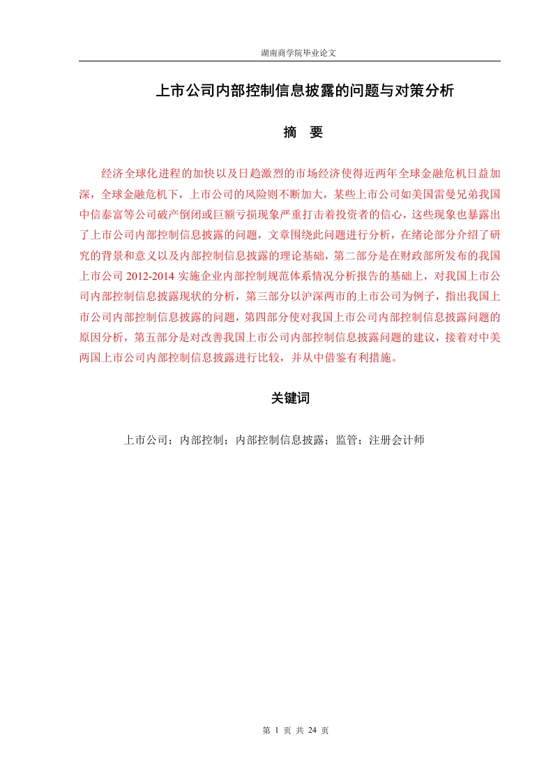 湖南商学院毕业论文上市公司内部控制信息披露的问题与对策分析摘要经济全球化进程的加快以及日趋激烈的市场经济使得近两年全球金融危机日益加深,全球金融危机下,上市公司的风险则不断加大,某些上市公司如美国雷曼兄弟我国中信泰富等公司破产倒闭或巨额亏损现象严重打击着投资者的信心,这些现象也暴露出了上市公司内部控制信息披露的问题,文章围绕此问题进行分析,在绪论部分介绍了研究的背景和意义以及内部控制信息披露的理论基础,第二部分是在财政部所发布的我国上市公司2012-2014实施企业内部控制规范体系情况分析报告的基础上,对我国上市公司内部控制信息披露现状的分析,第三部分以沪深两市的上市公司为例子,指出我国上市公司内部控制信息披露的问题,第四部分使对我国上市公司内部控制信息披露问题的原因分析,第五部分是对改善我国上市公司内部控制信息披露问题的建议,接着对中美两国上市公司内部控制信息披露进行比较,并从中借鉴有利措施。关键词上市公司:内部控制:内部控制信息披露;监管:注册会计师第1页共24页湖南商学院毕业论文AbstractAccelerate the process of economic globalization and increasingly fierce marketeconomy has made the past two years,the global financial crisis deepening global financialcrisis,the risk of listed companies is constantly increasing,some listed companies such asLehman Brothers and other companies of CITIC Pacific bankruptcy or huge losses seriousblow with the confidence of investors,these phenomena also exposed the internal control oflisted companies information disclosure issues surrounding this article analyzes the problemsin the introduction section introduces the background and significance of the information andinternal control disclosure of the theoretical basis,and the second part is in China's listedcompanies issued by the Ministry of Finance 2012-2014 implementation of enterprise internalcontrol system analysis analyzing reports on internal control information disclosure of listedcompanies in China the status quo,the third portion Shanghai and Shenzhen listed companies,for example pointed out that the internal control of the listed company information disclosureissue,the reason for making the fourth part of the internal control information disclosure oflisted companies in the analysis,the fifth part is to improve the internal control informationdisclosure of listed companies in China issue recommendations,followed by the twocountries on the internal control information disclosure of listed companies to compare andlearn from favorable measures.Key wordsListed Companies Internal Control Internal control information disclosure;Supervision Certified Public Accountant第2页共24页湖南商学院毕业论文目录摘要1Abstract ..............2.(一)研究背景及意义51.研究背景52.研究意义5(二)内部控制信息披露的理论基础51.内部控制以及内部控制信息披露的概念.52.内部控制信息披露的理论分析二、我国上市公司内部控制信息披露的现状分析(一)我国上市公司内部控制信息披露规范1.监管机构内部控制规范…2.管理部门内部控制规范(二)对我国上市公司内部控制信息披露规范的分析91.内部控制评价报告披露情况.92.内部控制评价报告有效性的结果…103内部控制缺陷的认定标准和数量的披露情况10三、我国上市公司内部控制信息披露的问题12(一)内部控制报告披露的水平比较低.12(二)内部控制责任主体缺位现象严重(三)内部控制评价标准混乱14(四)内部控制内容范围多且复杂..15(五)内部控制信息披露缺乏实质性内容15(一)我国上市公司内部控制信息披露问题的客观原因161.相关法律规范缺失162.监管力度不够…16(二)我国上市公司内部控制信息披露问题的主观原因171.上市公司披露内部控制信息动力不足2.相关管理人员认识不到位.173.内部控制评价报告格式与内容差异较大.1719第3页共24页