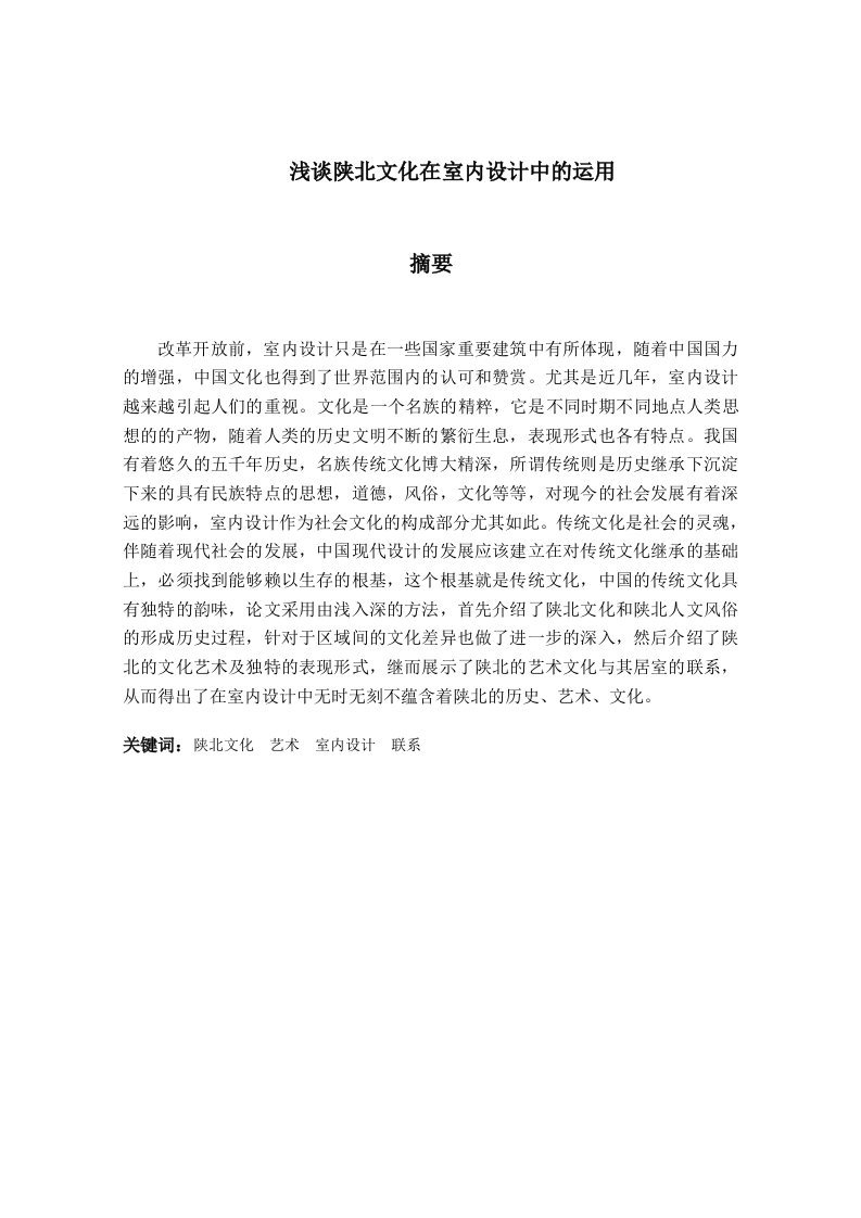 浅谈陕北文化在室内设计中的运用摘要改革开放前,室内设计只是在一些国家重要建筑中有所体现,随着中国国力的增强,中国文化也得到了世界范围内的认可和赞赏。尤其是近几年,室内设计越来越引起人们的重视。文化是一个名族的精粹,它是不同时期不同地点人类思想的的产物,随着人类的历史文明不断的繁衍生息,表现形式也各有特点。我国有着悠久的五千年历史,名族传统文化博大精深,所谓传统则是历史继承下沉淀下来的具有民族特点的思想,道德,风俗,文化等等,对现今的社会发展有着深远的影响,室内设计作为社会文化的构成部分尤其如此。传统文化是社会的灵魂,伴随着现代社会的发展,中国现代设计的发展应该建立在对传统文化继承的基础上,必须找到能够赖以生存的根基,这个根基就是传统文化,中国的传统文化具有独特的韵味,论文采用由浅入深的方法,首先介绍了陕北文化和陕北人文风俗的形成历史过程,针对于区域间的文化差异也做了进一步的深入,然后介绍了陕北的文化艺术及独特的表现形式,继而展示了陕北的艺术文化与其居室的联系,从而得出了在室内设计中无时无刻不蕴含着陕北的历史、艺术、文化。关键词:陕北文化艺术室内设计联系AbstractBefore reform and opening up,indoor design just in some countries importantbuildings reflected,with China's strength enhancing,Chinese culture alsogot within the world recognized and appreciated.Especially in recent years,indoor design more and more attracted people's attention.Culture is theessence of a nation,it is different time place the product of human thinking,as the history of human civilization thriving there continuously,form alsohave different features.Our country has a long history of five thousandyears,the name of traditional culture is really profound,the conventionalis under the historical inheritance of precipitation down with thecharacteristics of the nationalities ideas,moral,customs,culture,andso on,on the current social development has a profound impact,interiordesign as part of the social culture,especially.Traditional culture isthe soul of the society,along with the development of modern society,thedevelopment of Chinese modern design should be based on the traditionalcultural inheritance,and on the basis of must find can live the foundationof the earth,and the foundation is traditional culture,traditionalChinese culture has a unique flavor,using the method of d-galactose inducedaging paper,first introduced the north of shaanxi province of humanitiesculture and customs form a historical process,aim at the regional culturaldifferences also did further thorough,and then introduced the northernshaanxi of art,cultural and unique form of expression,and then show theart and culture of north of the bedroom contact,and reaches in interiordesign never fails to contain the northern shaanxi history,art and culture.Keywords:northern shaanxi culture art interior design contact