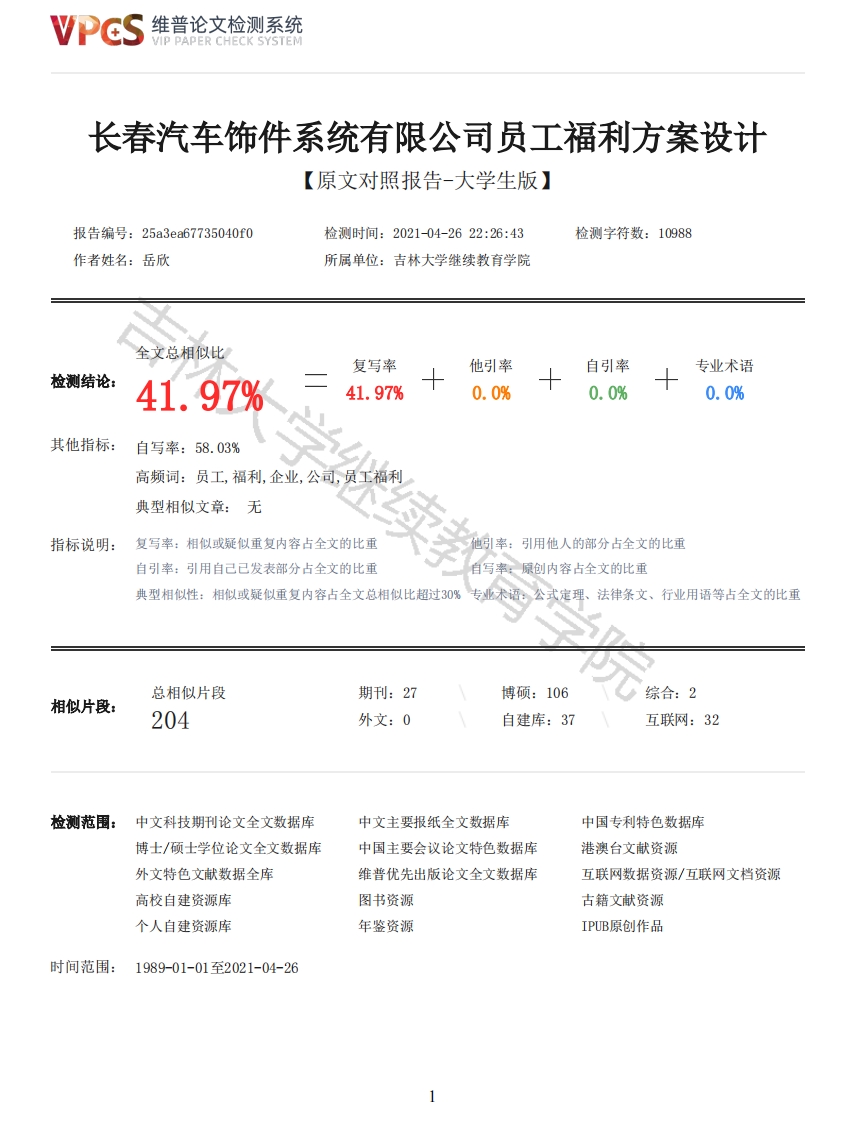 维普论文检测系统VIP PAPER CHECK SYSTEM长春汽车饰件系统有限公司员工福利方案设计【原文对照报告-大学生版】报告编号:25a3ea67735040f0检测时间:2021-04-2622:26:43检测字符数:10988作者姓名:岳欣所属单位:吉林大学继续教育学院全文总相似比复写率他引率自引率专业术语检测结论:41.97%41.97%0.0%0.0%0.0%其他指标:自写率:58.03%高频词:员工,福利,企业,公司,员工福利典型相似文章:无指标说明:复写率:相似或疑似重复内容占全文的比重他引率:引用他人的部分占全文的比重自引率:引用自己已发表部分占全文的比重自写率:原创内容占全文的比重典型相似性:相似或疑似重复内容占全文总相似比超过30%专业术语:公式定理、法律条文、行业用语等占全文的比重总相似片段期刊:27博硕:106综合:2相似片段:204外文:0自建库:37互联网:32检测范围:中文科技期刊论文全文数据库中文主要报纸全文数据库中国专利特色数据库博士/硕士学位论文全文数据库中国主要会议论文特色数据库港澳台文献资源外文特色文献数据全库维普优先出版论文全文数据库互联网数据资源/互联网文档资源高校自建资源库图书资源古籍文献资源个人自建资源库年鉴资源IPUB原创作品时间范围:1989-01-01至2021-04-26维普论文检测系统VIP PAPER CHECK SYSTEM原文对照颜色标注说明:■自写片段■复写片段(相似或疑似重复)口引用片段(引用)■专业术语(公式定理、法律条文、行业用语等)摘要随着我国经济的不断发展,人才竞争日趋明显,传统的调整工资的方式已经无法满足人们的需求。为了达到吸引和保留人才的目的,越来越多的企业开始关注员工福利。福利是薪酬体系的重要组成部分,是企业支付给员工的间接薪酬,对员工的积极性、创造性以及员工的忠诚度有着重要的影响,建立科学合理的福利体系对企业长久发展具有重要意义。本文结合长春汽车饰件系统有限公司实际情况,对福利政策进行分析和设计。关键词:员工福利:间接薪酬:福利设计:科学合理目录摘要1目录2前言4第一章员工福利及其发展51.1员工福利51.2员工福利的优势5教育学院1.3员工福利的发展历程61.3.1员工福利的国外发展历程61.3.2员工福利的国内发展历程61.4员工福利类型71.4.1法定福利71.4.1.1员工法定福利的主要内容71.4.2非法定福利81.4.2.1非法定福利定义81.4.2.2非法定福利主要内容81.4.2.3非法定福利的作用81.4.2.4弹性福利与精神福利9第二章长春汽车饰件系统有限公司福利现状102.1长春汽车饰件系统有限公司情况概述102.2长春汽车饰件系统有限公司现行福利政策102.2.1为员工建立了“五险一金”的福利制度102.2.2依据员工工龄长短,可享有5天-15天不等的带薪休假102.2.3员工享有提升个人能力的福利待遇102.2.4设置完善的员工晋升通道112.2.5定期为员工进行体检,并提供补充医疗保险及职工互助险112维普论文检测系统VIP PAPER CHECK SYSTEM2.2.6为员工提供了人性化的补充福利112.2.7为员工提供节日福利112.2.8员工特股112.2.9其他福利11第三章长春汽车饰件系统有限公司福利状况调查及分析123.1长春汽车饰件系统有限公司福利状况调查123.2调查结果分析123.3长春汽车饰件系统有限公司员工福利存在问题及原因143.3.1员工实际满意度不高143.3.2福利项目模式单一、无差异化设计143.3.3员工对福利制度概念不清晰143.3.4合理发放福利和控制成本成为难题15第四章员工福利优化方案设计154.1优化原则154.1.1合理性原则154.1.2适应性原则164.1.3激励原则164.1.4对外具有竞争性164.2优化方案164.2.1多渠道宣传公司福利政策164.2.2员工自愿选择公积金个人缴存比例164.2.3加强公司团队建设164.2.4将福利水平与企业的绩效挂钩16结语18致谢19参考文献20前言随着时代的发展,人力资源对于企业来说越来越重要,因此,如何使人力资源发挥出最大作用成为各企业研究的重点。最终发现能够激发人力资源潜力的方式在于激励。激励是管理过程中不可或缺的环节,它可以激发员工对于工作的热情,从而使员工的价值得以最大限度的发挥,最终达到实现组织目标的目的。薪酬福利是非常有效的激励员工的方法,当员工获得的薪酬总量相同的时候,企业使用不同的方式支付给员工,会获得不同的效果。因此,如果要发挥薪酬福利的的最大价值,又可以达到稳定员工的效果,薪酬福利制度中增加激励功能是非常有效的方企业提供适度的福利是提升员工疑聚力的重要方式和手段,企业在生产经营和管理中,通过增加工资来稳定员工的时代已经过去,这种方式不能真正使员工感受到企业的愿景和关怀,同时居高不下的薪酬会使企业人工成本过高,而在市场竞争中丧失了自己的优势,最终不得不进行裁员。在经济高速发展的今天,人才是企业发展的核心动力,“以人为本”的人力资源管理理论逐渐成为企业人力资源管理的共识,而其中的员工福利管理日益成为企业的关注重点。深得人心的福利待遇,比高薪更能有效地激励员工。第一章员工福利及其发展1.1员工福利员工福利指的是企业秉持对员工负责的态度,基于与员工的劳动关系,衡量自身盈利能力,而为员工提供的提升员工及其家庭生活质量的非货币性物资或服务。员工福利作为人力资源薪酬管理的非常重要的组成部分,对员工具有的很大的激励作用,建立完善的薪酬福利体系,能够很大程度激励员工努力工作,凝聚使其,对于企业提升经济效益等具有正向作用。除了上