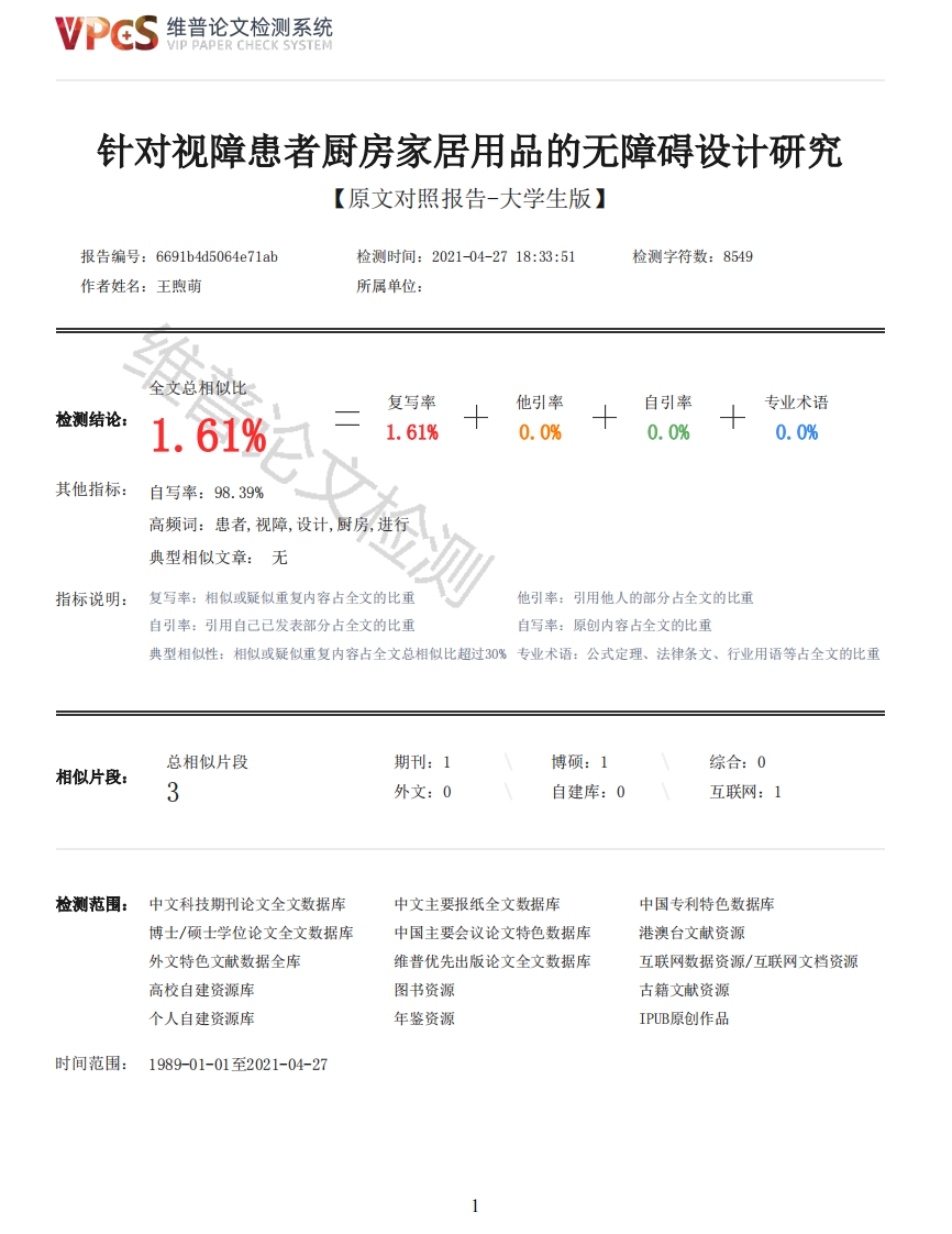 维普论文检测系统/IP PAPER CHECK SYSTEM针对视障患者厨房家居用品的无障碍设计研究【原文对照报告-大学生版】报告编号:6691b4d5064e71ab检测时间:2021-04-2718:33:51检测字符数:8549作者姓名:王煦萌所属单位:全文总相似比复写率他引率自引率专业术语检测结论:1.61%1.61%0.0%0.0%0.0%其他指标:自写率:98.39%高频词:患者,视障,设计,厨房,进行典型相似文章:无指标说明:复写率:相似或疑似重复内容占全文的比重他引率:引用他人的部分占全文的比重自引率:引用自己已发表部分占全文的比重自写率:原创内容占全文的比重典型相似性:相似或疑似重复内容占全文总相似比超过30%专业术语:公式定理、法律条文、行业用语等占全文的比重总相似片段期刊:1博硕:1综合:0相似片段:3外文:0自建库:0互联网:1检测范围:中文科技期刊论文全文数据库中文主要报纸全文数据库中国专利特色数据库博士/硕士学位论文全文数据库中国主要会议论文特色数据库港澳台文献资源外文特色文献数据全库维普优先出版论文全文数据库互联网数据资源/互联网文档资源高校自建资源库图书资源古籍文献资源个人自建资源库年鉴资源IPUB原创作品时间范围:1989-01-01至2021-04-27维普论文检测系统VIP PAPER CHECK SYSTEM原文对照颜色标注说明:■自写片段■复写片段(相似或疑似重复)引用片段(引用)■专业术语(公式定理、法律条文、行业用语等)摘要近年来,我们视障患者的数量逐年攀升,针对视障患者的厨房产品设计少之又少,我们正常人能够进行使用的厨房用品,视障患者很难适应这些产品,而它们的安全性对于视障群体来说更是较普通人降低不少。本论文针对这一现象提出针对视障患者家居厨房用品的无障碍设计研究,通过文献研究法、情景观察法、深入访谈法及收纳法进行研究,进行视障患者生理和心理特点分析,依据安全原则、容错原则、便捷原则、自立原则,提出感官代偿法、通用法、减去盲文法设计方法,对现有的视障患者厨房产品设计案例进行分析,总结研究成果的痛点,并提出适用于视障患者的厨房产品设计定位。最后对适用视障患者的厨房产品设计进行展望。关键词:视障患者厨房用品感官代偿通用AbstractIn recent years,the number of visually impaired patients is increasing year by year,and thedesign of kitchen products for visually impaired patients is very few.We can use kitchen productsfor normal people.Visually impaired patients are difficult to adapt to these products,and theirsafety is much lower than ordinary people.In view of this phenomenon,this paper puts forward theresearch on barrier free design of household kitchen supplies for visually impaired patients.Through literature research method,scene observation method,in-depth interview method and storagemethod,it analyzes the physiological and psychological characteristics of visually impairedpatients.According to the principles of safety,fault tolerance,convenience and self-reliance,itputs forward the sensory compensation method,the general method,the comprehensive method and thecomprehensive method By subtracting the Braille design method,this paper analyzes the existingcases of kitchen product design for visually impaired patients,summarizes the pain points of theresearch results,and puts forward the positioning of kitchen product design for visually impairedpatients.Finally,the kitchen product design for visually impaired patients is prospected.Key words:visually impaired patients kitchen supplies sensory compensation针对视障患者家居厨房用品的无障碍设计研究一、绪论(一)课题研究背景1.社会背景“以人为本”这一设计思想始终贯穿着产品设计的所有环节,但产品设计具有大众化这一特点将受众群体更多地指向了正常人,往往会忽视一部分弱势群体,这一部分弱势群体也是最需要我们进行关怀的,这时就有了针对弱势群体的“情感化设计”。“衣、食、住、行”包含了太多层面,而其中“食”是我们每天都要进行的活动,厨房是每天每个家庭必须涉足的领域,厨房用品是否得心应手也对人们做饭的效率、安全性有了越来越大的影响。同样,社会弱势群体也需要进行厨房作业这一活动,但目前针对弱势群体的厨房用品较少。近年来,我们视障患者的数量逐年攀升,针对视障患者的厨房产品设计少之又少,我们正常人能够进行使用的厨房用品,视障患者很难适应2维普论文检测系统VIP PAPER CHECK SYSTEM这些产品,而它们的安全性对于视障群体来说更是较普通人降低不少。视障患者的日常生活较其他弱势群体的日常生活方式很难被大众了解,且视障患者普遍具有很强的防备心,不愿不熟悉的正常人参与到自己的日常生活中,这就使观察视障患者居家生活变成一件很困难的事,同时为设计视障患者适用的厨房产品造成一定困难,这也成为了市面上视障患者适用的厨房用品较少的原因之一。基于我国对于弱势群体的政策性关怀,对于弱势群体的关怀也应融入到我们的日常生活中,针对视障患者的产品设计不仅具有很强的可挖掘性,同时也体现了社会对于视障患者群体的关怀。帮助视障患者实现独立生活,提高其生活质量,成为我国社会和谐发展的一大愿景。2.经济文化背景“民以食为天”,厨房文化已经融入到我们的日常生活中,有关厨房用品的设计大量涌现,竞争也非常激烈,消费者更倾向于带“有温度”的产品设计,使得厨房产品类别得以细化。正常消费者对于厨房产品的挑剔显而易见,而视障患者更是需要这种“有温度”的厨房产品