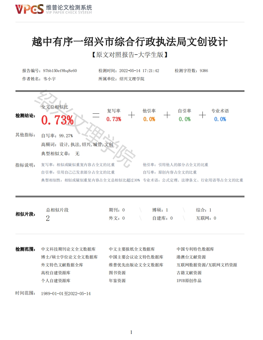 维普论文检测系统/IP PAPER CHECK SYSTEM越中有序一绍兴市综合行政执法局文创设计【原文对照报告-大学生版】报告编号:97bb150ef8bq8e60检测时间:2022-05-1417:21:42检测字符数:9386作者姓名:韦小宇所属单位:绍兴文理学院全文总相似比复写率他引率自引率专业术语检测结论:0.73%0.73%0.0%0.0%0.0%其他指标:自写率:99.27%高频词:设计,执法,绍兴,城管,文创典型相似文章:无指标说明:复写率:相似或疑似重复内容占全文的比重他引率:引用他人的部分占全文的比重自引率:引用自己已发表部分占全文的比重自写率:原创内容占全文的比重典型相似性:相似或疑似重复内容占全文总相似比超过30%专业术语:公式定理、法律条文、行业用语等占全文的比重总相似片段期刊:0博硕:1综合:1相似片段:2外文:0自建库:0互联网:0检测范围:中文科技期刊论文全文数据库中文主要报纸全文数据库中国专利特色数据库博士/硕士学位论文全文数据库中国主要会议论文特色数据库港澳台文献资源外文特色文献数据全库维普优先出版论文全文数据库互联网数据资源/互联网文档资源高校自建资源库图书资源古籍文献资源个人自建资源库年鉴资源IPUB原创作品时间范围:1989-01-01至2022-05-14维普论文检测系统VIP PAPER CHECK SYSTEM原文对照颜色标注说明:■自写片段■复写片段(相似或疑似重复)口引用片段(引用)■专业术语(公式定理、法律条文、行业用语等)毕业设计说明书(2022届)越中有序一绍兴市综合行政执法局文创设计学生姓名韦小宇学号20534122院系艺术学院设计1系专业视觉传达设计指导教师黄章敏填写日期2022年5月10日越中有序一绍兴市综合行政执法局文创设计摘要城市管理执法是改善城市秩序、提高城市形象、提高人民生活水平的重要屏障,因此,就必须建立高素质的城市管理执法队伍,塑造良好的城管形象,使群众更透彻的了解绍兴综合行政执法局的职能,更主动、积极配合执法局的工作,共同构建有序、和谐的绍兴。本课题选用“越中有序”为主题,以城管执法的情景为出发点,以绍兴综合行政执法局的相关元素为重点,在设计的过程中以对比的方法结合城管执法的情景、提取城管执法的元素,通过对视觉元素的提取、插画的设计和文创产品载体的选取,主要以孟菲斯风格为主、高明度的色彩搭配、几何元素的大量运用来对生活用品、文具、益智类玩具以及摆件等类型的文创产品进行设计并应用推广,从而使其具有趣味性和冲击力强的鲜明特征。能够鲜明的突出表达绍兴综合行政执法局的职能,使公众提高对执法局的信任度,以及提高执法局的行政效率,构建秩序井然的和谐绍兴。关键词:越中有序、孟菲斯风格、文创产品设计Order in Shaoxing-Cultural and creativedesign of Shaoxing comprehensiveadministrative law enforcement bureauABSTRACT2维普论文检测系统VIP PAPER CHECK SYSTEMUrban management law enforcement is to improve the order of the city,improve the urban image,improve people's living standards important barrier,therefore,it is necessary to establish a high-quality urban management law enforcement team,shaping good urban image,make people more thoroughlyunderstand the functions of the comprehensive administrative law enforcement bureau of Shaoxing,more active,actively cooperate with law enforcement bureau work,jointly build orderly andharmonious Shaoxing.This topic is chosen in "the order"as the theme,to the urban management enforcement situationas a starting point,with the comprehensive administrative law enforcement bureau of Shaoxing,withemphasis on the related elements,in the process of design with comparison method and combining withthe urban management enforcement scenarios,extract elements of the urban management enforcement,through extraction,illustration design of visual elements and a selection of product carrier,Mainly based on Memphis style,high brightness color collocation,a large number of geometricelements are used to design and promote the cultural and creative products such as home furnishing,stationery and decoration,and make them have the distinctive characteristics of fun and strongimpact.Thus,it can highlight the functions of Shaoxing Comprehensive administrative lawenforcement Bureau,improve the public's trust in the law enforcement Bureau,improve theadministrative efficiency of the law enforcement Bureau,and build an orderly and harmoniousShaoxing.Key words:Order in Shaoxings Memphis style s Cultural and creative product design中文摘要I英文摘要II1绪论11.1课题简介11.2选题背景及课题来源12课题调研23设计概念及设计思想(定位)33.1设计概念33.2设计思想34设计展开过程或创作过程4“越中有序”字体设计4IP形象设计4插画海报设计55文创产品设计7生活用品类7装饰类10玩具类10文具类11设计成果136结束语13参考文献14致谢161.堵论1.1课题简介本课题的名称为“越中有序一一绍兴市综合行政执法局文创设计”,课题中的“越”即绍兴的简称,代指绍兴,“序”则意味着有秩序,条条有理,“越中有序”意为通过绍兴市综合行政执法局的治理,使绍兴变得秩序井然,人们对绍兴市综合行政执法局的职能更加了解,能够更积极、主动的配合执法局工作,共同构建有序、和谐的绍兴。3