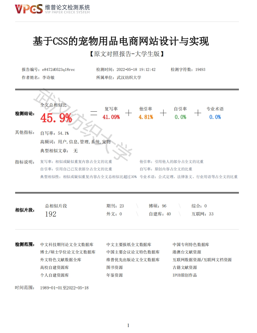 维普论文检测系统VIP PAPER CHECK SYSTEM基于CSS的宠物用品电商网站设计与实现【原文对照报告-大学生版】报告编号:e8472d0523g18rec检测时间:2022-05-1819:12:42检测字符数:19493作者姓名:李诗敏所属单位:武汉纺织大学全文总相似比复写率他引率自引率专业术语检测结论:45.9%41.09%4.81%0.0%0.0%其他指标:自写率:54.1%高频词:用户,信息,管理,系统,宠物典型相似文章:无指标说明:复写率:相似或疑似重复内容占全文的比重他引率:引用他人的部分占全文的比重自引率:引用自己已发表部分占全文的比重自写率:原创内容占全文的比重典型相似性:相似或疑似重复内容占全文总相似比超过0%专业术语:公式定理、法律条文、行业用语等占全文的比重总相似片段期刊:23博硕:96综合:0相似片段:192外文:0自建库:40互联网:33检测范围:中文科技期刊论文全文数据库中文主要报纸全文数据库中国专利特色数据库博士/硕士学位论文全文数据库中国主要会议论文特色数据库港澳台文献资源外文特色文献数据全库维普优先出版论文全文数据库互联网数据资源/互联网文档资源高校自建资源库图书资源古籍文献资源个人自建资源库年鉴资源IPUB原创作品时间范围:1989-01-01至2022-05-18维普论文检测系统VIP PAPER CHECK SYSTEM原文对照颜色标注说明:■自写片段■复写片段(相似或疑似重复)■引用片段(引用)■专业术语(公式定理、法律条文、行业用语等)毕业论文论文题目:基于CSS的宠物用品电商网站设计与实现姓名:李诗敏学号:1807270529学院:管理学院专业:电子商务指导教师:宋泽源2022年5月20日独创性声明本人郑重声明:所呈交的学位论文,是本人在导师的指导下,独立进行研究工作所取得的成果。除文中已经注明引用的内容外,本论文不包含任何其他个人或集体已经发表或撰写过的作品成果。对本文的研究作出重要贡献的个人和集体,均已在文中以明确方式标明。本人完全意识到本声明的法律结果由本人承担。学位论文作者签名:李诗敏签字日期:2022年05月10日学位论文版权使用授权书本学位论文作者完全了解武汉纺织大学有关保留、使用学位论文的规定。特授权武汉纺织大学可以将学位论文的全部或部分内容编入有关数据库进行检索,并采用影印、缩印或扫描等复制手段保存、汇编以供查阅和借阅。同意学校向国家有关部门或机构送交论文的复印件和磁盘。(保密的学位论文在解密后适用本授权说明)学位论文作者签名:李诗敏导师签名:签字日期:2022年05月10日签字日期:2022年05月10日摘要随着时代的变迁,在人们的不断努力下,人们终于迎来物资繁盛的时代,在信息的时代里,越来越多的资源得到了合理的分配,但是随着物资优渥和工作节奏的快步伐,人们的精神需求却明显跟不上步伐,越来越多的人开始2维普论文检测系统VIP PAPER CHECK SYSTEM尝试着去养宠物以此获得慰藉,填充内心世界的匮乏。因此人们对宠物的需求量也形成了产业链,今天这个加速前进的步伐下,内卷越来越严重,人们也患上不同程度的抑郁与焦虑,养宠物这件事成为了我们迫切的出破口。本次毕业设计的主题是宠物用品网站,是一个既可以分享宠物瞬间又可以轻松购物的网站。网站功能强大包含了宠物商品,狗狗用品、猫咪用品、狗狗零食、猫咪零食以及购物指南。日常中会有更多的分享宠物陪伴时光和饲养宠物心得,至还可以提供私人课程,教授小主如何训练宠物。本网站是基于CSS和SQL、C语言而设计,网站稳定可靠,定期清理不良链接,定时推新一些新产品。关键词:宠物电商:CSS:SQL:线上网站ABSTRACTWith each passing day,inexorably,along with the improvement of living standards and scientificand technological innovation,people finally supplies prosperous come of age,in the era ofinformation,more and more got the reasonable allocation of resources,but as the material well andworking rhythm fast pace,far couldn't keep up with the pace of people's spiritual needs,More andmore people start to try to keep pets to get comfort and fill the lack of inner world.Therefore,people's demand for pets has also formed an industrial chain,and today's online pet shops in theworld provide people with more convenient and satisfying pet services.I designed by pet sharing website,is a can share the pet moments and can easily shoppingwebsite.The website has powerful functions,including pet snacks,pet clothes,pet toiletries,petmedical care,pet matching,pet foster care and all aspects of the service.In daily life,we canshare more pet company time and pet raising experience,and even provide private courses to teachthe owner how to train the pet.Therefore,it is very friendly and convenient for people's life.Whether individual or pet shop can provide free customer service consultation,at any time to solvethe problems of small owners,I hope you will like it.This website is designed based on CSS and SQL,C language,the site is stable and reliable,regularcleaning bad links,timed push some new products.Key words:Pet electricity;CSS;SQL;Online Website目录1绪论······1.1研究的背景和意义1.2研究现状.......1.3研究的目的及内容···1.4论文结构2开发技术介绍······2.1CSS开发语言2.2MYSL数据库···2.3网设计技术・3网站分析53.1需求分析53.2可行性分析····783.4数据流程分析··3