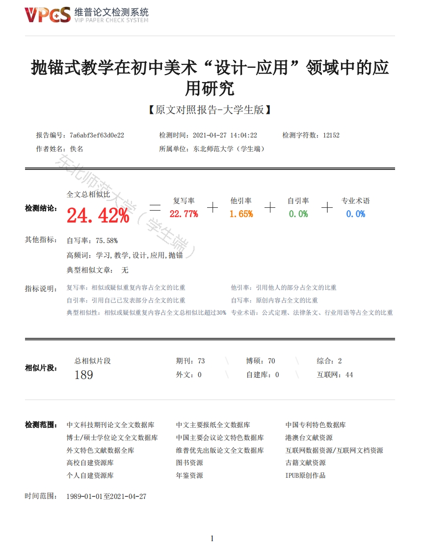 维普论文检测系统/IP PAPER CHECK SYSTEM抛锚式教学在初中美术“设计-应用”领域中的应用研究【原文对照报告-大学生版】报告编号:7a6abf3ef63d0e22检测时间:2021-04-2714:04:22检测字符数:12152作者姓名:佚名所属单位:东北师范大学(学生端)全文总相似比复写率他引率自引率专业术语检测结论:24.42%22.77%1.65%0.0%0.0%其他指标:自写率:75.58%高频词:学习,教学,设计,应用,抛错典型相似文章:无指标说明:复写率:相似或疑似重复内容占全文的比重他引率:引用他人的部分占全文的比重自引率:引用自己已发表部分占全文的比重自写率:原创内容占全文的比重典型相似性:相似或疑似重复内容占全文总相似比超过30%专业术语:公式定理、法律条文、行业用语等占全文的比重总相似片段期刊:73博硕:70综合:2相似片段:189外文:0自建库:0互联网:44检测范围:中文科技期刊论文全文数据库中文主要报纸全文数据库中国专利特色数据库博士/硕士学位论文全文数据库中国主要会议论文特色数据库港澳台文献资源外文特色文献数据全库维普优先出版论文全文数据库互联网数据资源/互联网文档资源高校自建资源库图书资源古籍文献资源个人自建资源库年鉴资源IPUB原创作品时间范围:1989-01-01至2021-04-27维普论文检测系统VIP PAPER CHECK SYSTEM原文对照颜色标注说明:■自写片段■复写片段(相似或疑似重复)引用片段(引用)■专业术语(公式定理、法律条文、行业用语等)范大学学校代码:10200学号:2017011481本科毕业论文抛锚式教学在初中美术“设计-应用”领域中的应用研究Research on the Application of Anchor Teaching in the Field of Art Design-Application in JuniorMiddle School学生姓名:缑晓璐指导教师:费明宇所在学院:美术学院所学专业:美术学(师范)东北师范大学2021年4月独创性声明本人郑重声明:所提交的毕业论文是本人在导师指导下独立进行研究工作所取得的成果。据我所知,除了特别加以标注和致谢的地方外,论文中不包含其他人已经发表或撰写过的研究成果。对本人的研究作出重要贡献的个人和集体,均已在文中做了明确的说明。本声明的法律结果由本人承担。论文作者签名:缑晓璐日期:摘要根据2011版新课程标准的内容,在教学过程中,要关注学生发展,教师要认真研究课堂教学策略,激发学生学习热情,体现学生主体,鼓励学生探究,高效实现目标。新课程课堂教学要真正体现以学生为主体,提高学生学习热情,增强学生自主探究,自主学习的能力,培养学生的创新精神。本论文主要论述抛锚式教学理念如何有效合理的应用于初中美术设计-应用学习领域中,采用一系列研究方法进行论述,如文献调查法、描述性研究法、经验总结2维普论文检测系统VIP PAPER CHECK SYSTEM法等研究法法进行讨论抛错式教学应用于初中美术设计-应用学习领域的可行性。关键词:抛错式教学:初中美术:设计-应用学习领域AbstractAccording to the contents of the new curriculum standard of 2011 edition,in the teachingprocess,we should pay attention to the development of students.Teachers should seriously studyclassroom teaching strategies,stimulate students'learning enthusiasm,reflect students'main body,encourage students to explore,and achieve the goal efficiently.The new curriculum classroomteaching should truly reflect the students as the main body,improve students'learning enthusiasm,and enhance students'ability of independent inquiry and independent learning,To cultivatestudents'innovative spirit,this paper mainly discusses how the anchored teaching idea iseffectively and reasonably applied in the field of junior high school art design applicationlearning.A series of research methods are used to discuss,such as literature survey,descriptiveresearch,experience summary and other research methods to discuss the feasibility of anchoredTeaching applied in junior high school art design application learning.Key words:anchored teaching,junior high school art design,applied learning field目录摘要IAbstract II目录III1抛锚式教学模式相关理论的概述1学生端1.1抛锚式教学是什么11.2抛锚式教学的五个阶段11.2.1创设情境11.2.2确定问题21.2.3自主学习21.2.4协作学习21.2.5整体评价21.3抛锚式教学的主要目的22新课程标准下的初中美术课堂“设计-应用”领域的要求32.1“设计-应用”学习领域课程目标32.2“设计-应用”学习领域课程内容32.2.1课程设计要点32.2.2学习活动建议32.2.3评价要点43抛锚式教学引入初中美术“设计-应用”领域的可行性53.1新课程改革下的抛错式教学模式优势所在53.2抛错式教学模式应用于初中美术“设计-应用”领域的原则53.3抛错式教学模式应用于初中美术“设计-应用”领域的方法53.3.1结合“设计-应用”领域课程设计要求如何创设情境53.3.2结合“设计-应用”领域课程设计要求如何确定问题63.3.3结合“设计-应用”领域课程设计要求如何自主学习73.3.4结合“设计-应用”领域课程设计要求如何协作学习73.4抛锚式教学模式应用于初中美术“设计-应用”领域的优点84抛锚式教学模式应用于初中美术“设计-应用”的教学设计方案-一-一-以人美版教材为例94.1方案一:八年级下册-一一墙壁小装饰94.1.1分析本课程93