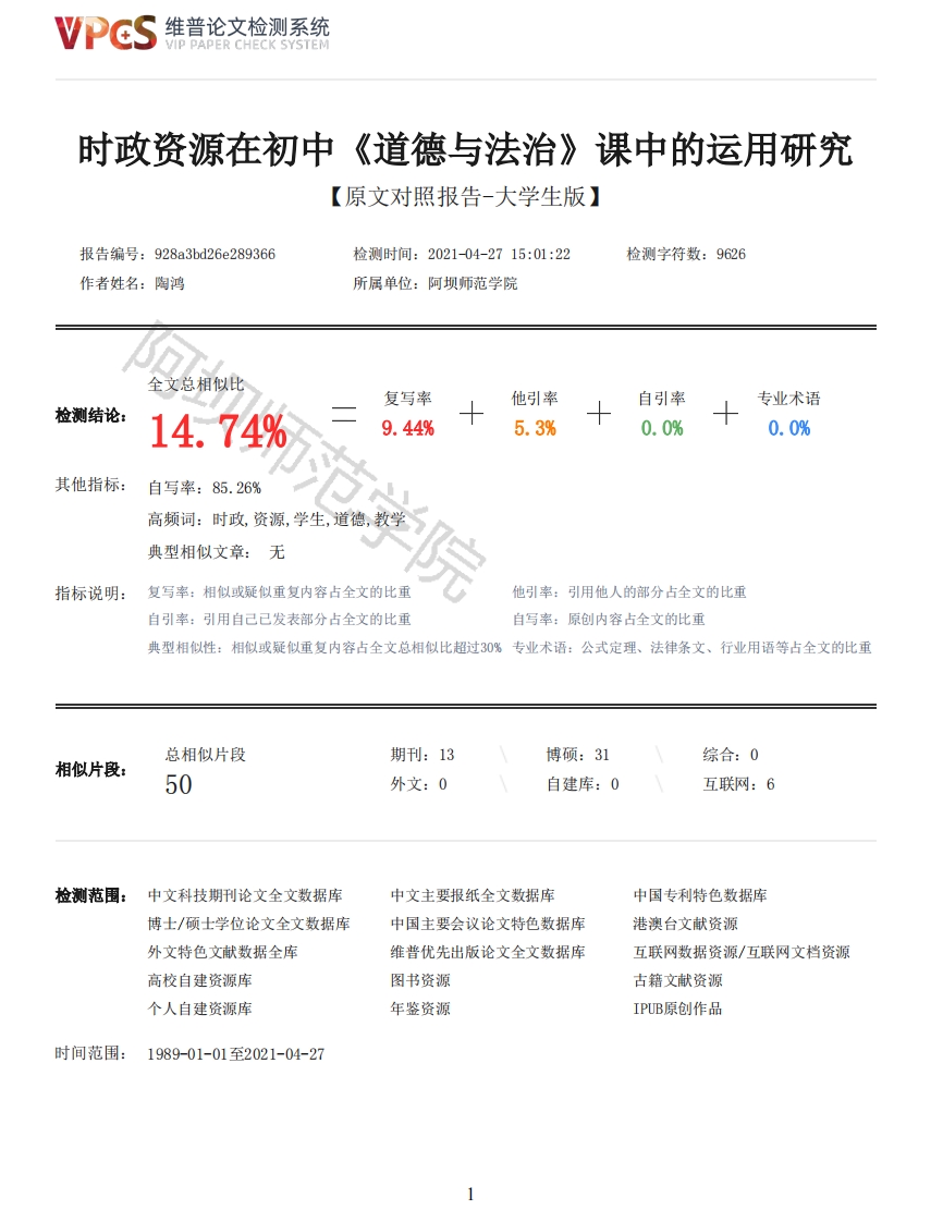 维普论文检测系统/IP PAPER CHECK SYSTEM时政资源在初中《道德与法治》课中的运用研究【原文对照报告-大学生版】报告编号:928a3bd26e289366检测时间:2021-04-2715:01:22检测字符数:9626作者姓名:陶鸿所属单位:阿坝师范学院全文总相似比复写率他引率自引率专业术语检测结论:14.74%9.44%5.3%0.0%0.0%其他指标:自写率:85.26%高频词:时政,资源,学生,道德,教学典型相似文章:无指标说明:复写率:相似或疑似重复内容占全文的比重他引率:引用他人的部分占全文的比重自引率:引用自己已发表部分占全文的比重自写率:原创内容占全文的比重典型相似性:相似或疑似重复内容占全文总相似比超过30%专业术语:公式定理、法律条文、行业用语等占全文的比重总相似片段期刊:13博硕:31综合:0相似片段:50外文:0自建库:0互联网:6检测范围:中文科技期刊论文全文数据库中文主要报纸全文数据库中国专利特色数据库博士/硕士学位论文全文数据库中国主要会议论文特色数据库港澳台文献资源外文特色文献数据全库维普优先出版论文全文数据库互联网数据资源/互联网文档资源高校自建资源库图书资源古籍文献资源个人自建资源库年鉴资源IPUB原创作品时间范围:1989-01-01至2021-04-27维普论文检测系统VIP PAPER CHECK SYSTEM原文对照颜色标注说明:■自写片段■复写片段(相似或疑似重复)口引用片段(引用)■专业术语(公式定理、法律条文、行业用语等)ABA TEACHERS UNIVERSITY本科毕业论文(设计)题目:时政资源在初中《道德与法治》课中的运用研究二级学院马克思主义学院专业年级思想政治教育专业学生姓名陶鸿学号2017677指导教师赵秀花职称副教授完成时间:2021年04月26日时政资源在初中《道德与法治》课中的运用研究学生:陶鸿指导教师:赵秀花摘要:时政资源为初中《道德与法治》课程提供了丰富的教学素材,是该课程教师教学的重要载体,是十分重要的教学资源。鉴于此,本文从时政资源的含义出发,挖掘时政资源与初中《道德与法治》课的内在联系,通过大量文献资料的分析,进而总结出时政资源在初中《道德与法治》课教学中的运用价值。根据时政资源在初中《道德与法治》课教学中的应用现状,有针对性的从充分挖掘时政资源、定期开展师资专项培训、增强学生学习兴趣、提升教学内容的思想性和深刻性四个角度,提出时政资源在初中《道德与法治》课教学中的运用策略,以期让时政资源更好的融入初中《道德与法治》课堂,提高教学质量。关键词:时政资源;道德与法治:运用Research on the application of current political resources in the middle school "morality andrule of law"courseStudent:Tao HongAdvisor:Zhao XiuhuaAbstract:As an important teaching resource,current politics resources have become an importantcarrier of moral and rule of law courses in junior high schools,providing more teaching materialsfor moral and rule of law courses.In view of this,this paper starts from the meaning of the course2维普论文检测系统VIP PAPER CHECK SYSTEMof morality and the rule of law and the current political resources,combined with the internalconnection of the course of morality and the rule of law,analyzes a large number of literature andteaching experience of teachers,and then concludes the use value of the current political resourcesin the teaching of the course of morality and the rule of law in junior middle school.Resourcesaccording to the current politics in junior high school the application status of "morality and therule of law"course teaching,targeted the current politics from mining resources,regularly carryout special training,increase students interest in learning,and the integration of students'future development perspective put forward political resources in junior high school of morality andthe application of the rule of law teaching strategy,in order to make government resources betterinto the class of morality and the rule of law,so as to realize the goal of moral education ofmorality and the rule of law course,improve the quality of teaching.Key words:Current political resources;morality and rule of law;using目录前言1一、时政资源在初中《道德与法治》课中应用的相关问题概述1(一)时政资源的界定1(二)时政资源与《道德与法治》课的内在联系2(三)时政资源应用于《道德与法治》课的理论依据3二、时政资源运用于《道德与法治》课的重要性4(一)弥补《道德与法治》教材的局限性4(二)提高课堂教学质量4(三)培养学生爱国主义情怀4三、《道德与法治》教学实践中运用时政存在的问题5(一)时政资源选材不合理5(二)时政资源运用方式欠缺5(三)教学内容与学生未来发展相脱离5四、时政资源在《道德与法治》课教学中的运用对策6(一)充分挖掘时政资源,提升时政资源的利用效率6(二)定期开展师资专项培训,提高整合时政资源的素养6(三)突出时政资源的生活价值,增强学生学习兴趣7(四)化虚为实,提升内容的思想性和深刻性7结束语:8前言初中《道德与法治》课作为一门与时政紧密相连的德育课程,也是一门与社会生活紧密联系的综合课程,这决定了时政资源是《道德与法治》课程的重要载体和重要教学内容。为了提升《道德与法治》课程的课堂教学质量,本文旨在关注时政资源在初中《道德与法治》课程中的运用策略,探究将时政资源运用于《道德与法治》课中的有效策略,实现学科育人目标,完成立德树人的根本任务。一、时政资源在初中《道德与法治》课中应用的相关问题概述概念的界定是为了将研究问题的相关因素进行清