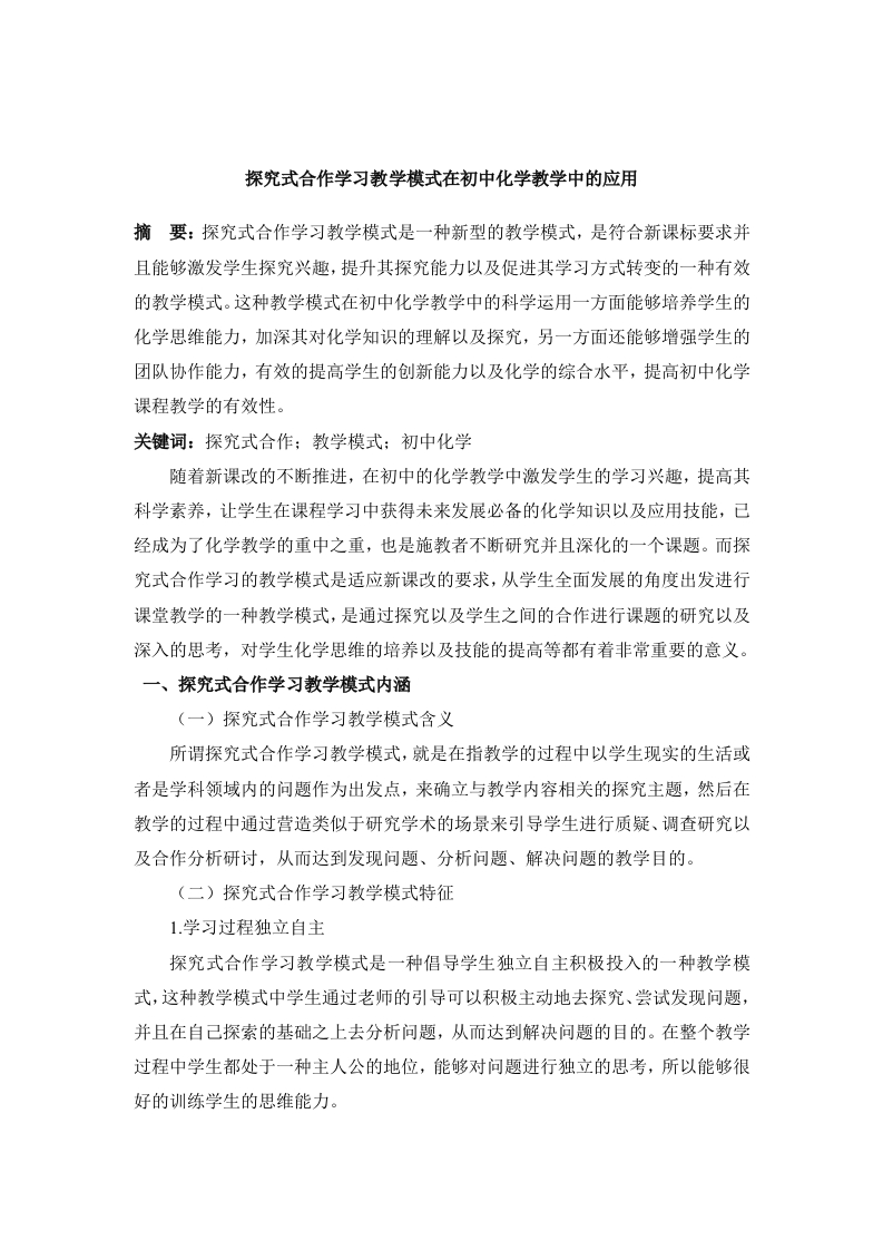 探究式合作学习教学模式在初中化学教学中的应用摘要:探究式合作学习教学模式是一种新型的教学模式,是符合新课标要求并且能够激发学生探究兴趣,提升其探究能力以及促进其学习方式转变的一种有效的教学模式。这种教学模式在初中化学教学中的科学运用一方面能够培养学生的化学思维能力,加深其对化学知识的理解以及探究,另一方面还能够增强学生的团队协作能力,有效的提高学生的创新能力以及化学的综合水平,提高初中化学课程教学的有效性。关键词:探究式合作:教学模式:初中化学随着新课改的不断推进,在初中的化学教学中激发学生的学习兴趣,提高其科学素养,让学生在课程学习中获得未来发展必备的化学知识以及应用技能,已经成为了化学教学的重中之重,也是施教者不断研究并且深化的一个课题。而探究式合作学习的教学模式是适应新课改的要求,从学生全面发展的角度出发进行课堂教学的一种教学模式,是通过探究以及学生之间的合作进行课题的研究以及深入的思考,对学生化学思维的培养以及技能的提高等都有着非常重要的意义。一、探究式合作学习教学模式内涵(一)探究式合作学习教学模式含义所谓探究式合作学习教学模式,就是在指教学的过程中以学生现实的生活或者是学科领域内的问题作为出发点,来确立与教学内容相关的探究主题,然后在教学的过程中通过营造类似于研究学术的场景来引导学生进行质疑、调查研究以及合作分析研讨,从而达到发现问题、分析问题、解决问题的教学目的。(二)探究式合作学习教学模式特征1.学习过程独立自主探究式合作学习教学模式是一种倡导学生独立自主积极投入的一种教学模式,这种教学模式中学生通过老师的引导可以积极主动地去探究、尝试发现问题,并且在自己探索的基础之上去分析问题,从而达到解决问题的目的。在整个教学过程中学生都处于一种主人公的地位,能够对问题进行独立的思考,所以能够很好的训练学生的思维能力。2.具有很强的操作性探究性合作学习教学模式中有一个很重要的部分,就是探究的部分。这部分的教学有着很强的操作性,需要学生通过调查、查询资料并且进行实验才能够完成。在这个过程中还需要学生之间相互合作,通过讨论交流来完善自己的结论,从而让整个知识技能的获得有效。3.有助于学生发散性思维的激发探究性合作学习教学模式能够促使学生从多方面进行问题的思考,让学生在自主的探索中了解问题的本质。当然这样的教学模式因为其课堂氛围的轻松以及思维的活跃可以激发学生的发散性思维,能够让学生在彼此的交流之中得出更深层次的认识,提高其学习能力。二、探究式合作学习教学模式的构建(一)引入问题阶段模式构建在引入问题的阶段,老师需要为学生的探究创造一个有着探究感觉的环境,从而激发学生的探讨问题的欲望。在这个引入问题的过程中老师应该结合课本中的知识,准备好探究时需要的一些道具。并且对于班级内部要进行分组,将教学内容的设计任务分配到各个小组,让小组的成员明确自己的责任,从而有效的展开交流。(二)合作探究阶段模式构建这个阶段是学生合作探究的一个阶段。每个组的同学可以通过老师提出的问题而展开一些探究性的活动。在这个过程中老师需要查找问题的信息,并且发现老师所提问题中的一些问题,通过独立的思考以及合作讨论来获得一些探究的结果。在这个过程中每个小组的成员都应该明确,每个人都应该准确的完成自己的任务,这样才能够让探究活动有效。(三)组织交流阶段模式构建组织交流的阶段是在各小组汇报了探究结果之后的交流,在这个过程中学生可以对老师所提出的问题研究出的结果进行质疑,对其它小组的探究活动作出一些质疑以及讨论。然后老师再根据学生之间的谈论进行适当的探究点评,解答探究过程中存在的一些问题。(四)实践应用阶段模式构建这个阶段是整个探究合作学习教学模式的最后一个阶段,这个阶段是评价反馈的阶段,让学生将自己探究出的结果应用到具体的实践之中,通过练习从而对探究的结果进行更深层次的掌握,完成整个探究性的活动。三、探究式合作学习教学模式在初中化学教学中的具体应用在初中的化学教学中探究式合作学习教学模式的应用需要老师合理的引进探究的问题,并且有效的组织学生做好课题的探究,从而让整个探究学习都在可控有效的范围内进行。本文以“氧气的实验室制法”这一节化学内容为例,来详细阐述在初中化学的教学中如何应用这种教学模式。(一)什么物质可以制取氧气在“氧气的实验室制法”这个课题的探究中,老师可以先根据已经学过的知识,即植物可以通过光合作用制取氧气来引入实验室方法制取氧气这一新课题。然后为这一课题的研究准备过氧化氢溶液、二氧化锰、酒精灯、火柴、药匙、制取氧气的简易发生装置一套等这些实验物品。在准备工作完毕之后,老师可以列举出一些物质如:食盐(主要成分为NaC)、盐酸(主要成分为HCI)、过氧化氢(HO2)高锰酸钾(KMO4)、甲烷(CH4),让学生们猜想这些物品哪几种可以制出氧气,然后让他们对自己的猜想给出理由。可能在选择中学生们会说过氧化氢与高锰酸钾能够制作出氧气,因为它含有氧元素。当然对于学生的猜想,老师应该给与其肯定,并讲明在本节课的