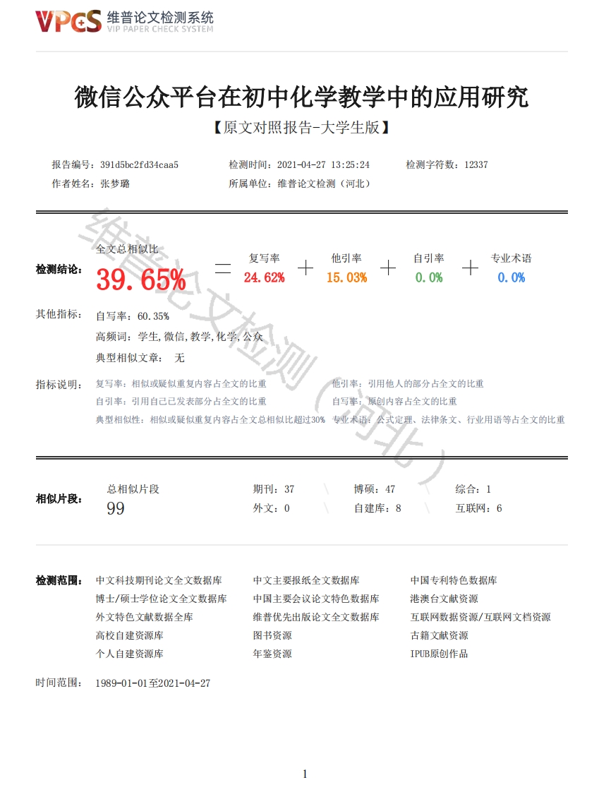 维普论文检测系统/IP PAPER CHECK SYSTEM微信公众平台在初中化学教学中的应用研究【原文对照报告-大学生版】报告编号:391d5bc2fd34caa5检测时间:2021-04-2713:25:24检测字符数:12337作者姓名:张梦璐所属单位:维普论文检测(河北)全文总相似比复写率他引率自引率专业术语检测结论:39.65%24.62%15.03%0.0%0.0%其他指标:自写率:60.35%高频词:学生,微信,教学,化学,公众典型相似文章:无指标说明:复写率:相似或疑似重复内容占全文的比重他引率:引用他人的部分占全文的比重自引率:引用自己已发表部分占全文的比重自写率:原创内容占全文的比重典型相似性:相似或疑似重复内容占全文总相似比超过30%专亚术语:公式定理、法律条文、行业用语等占全文的比重总相似片段期刊:37博硕:47综合:1相似片段:99外文:0自建库:8互联网:6检测范围:中文科技期刊论文全文数据库中文主要报纸全文数据库中国专利特色数据库博士/硕士学位论文全文数据库中国主要会议论文特色数据库港澳台文献资源外文特色文献数据全库维普优先出版论文全文数据库互联网数据资源/互联网文档资源高校自建资源库图书资源古籍文献资源个人自建资源库年鉴资源IPUB原创作品时间范围:1989-01-01至2021-04-27维普论文检测系统VIP PAPER CHECK SYSTEM原文对照颜色标注说明:■自写片段■复写片段(相似或疑似重复)口引用片段(引用)■专业术语(公式定理、法律条文、行业用语等)摘要21世纪,大数据时代的发展在移动智能终端软件的出现上体现的淋漓尽致,尤其是微信这一款社交软件,作为学生、家长、教师都能熟练操作的一款移动社交软件,正好可以实现学生移动学习的要求,让学生对化学学科的学习不止局限于教室。本文采用微信的一个功能板块一一微信公众号实现和特定群体的文字、图片、语音、视频的全方位沟通,将人教版初中化学与移动学习平台一微信公众号进行融合,把化学课堂、化学实验室等放在一个由教师管理的微信公众号帐号里,并不定期更新一些生活中的化学小知识,把化学与生活结合,让学生实现随走随学、随忆随记的移动学习模式。通过运用问卷调查法、文献研究法等方法得出学生、家长、教师对于微信公众平台应用于化学课堂的认可度及学生对于化学类微信公众号的喜爱程度。把对学生的化学思维的培养分散到生活的方方面面。将微信应用于初中化学教学可以补救现行化学教学中一些不足和缺陷,更有利于推进初中化学教育的全面发展关键词:初中化学:微信公众平台:教育:研究ABSTRACTIn the 21st century,the development of big data era is reflected incisively and vividly in theemergence of mobile intelligent terminal software,especially wechat,a social software that can beskillfully operated by students,parents and teachers.It can just meet the requirements ofstudents'mobile learning,so that students&apos:learning of chemistry is not limited to theclassroom.Official account of WeChat official account is used to achieve the comprehensivecommunication of the WeChat official account and the specific groups of characters,pictures,voiceand video.The integration of the chemistry and mobile learning platform of WeChat public address isput into the chemistry teaching laboratory and chemical laboratory.Update some chemistry knowledgefrom time to time,combine chemistry with life,and let students realize the mobile learning mode oflearning as they go and remembering as they remember.By using the methods of questionnaire andliterature,the students&apos:,parents&apos:and teachers'recognition of the WeChat publicplatform in chemistry class and the students'favorite degree toward the chemical WeChatofficial account are obtained.Spread the cultivation of students'chemical thinking to allaspects of life.The application of wechat in junior high school chemistry teaching can make up forsome deficiencies in the current chemistry teaching,and is more conducive to promoting thecomprehensive development of junior high school chemistry education.Key words:junior high school chemistry:Wechat public platform;Education;Research目录摘要IIIABSTRACTIV2维普论文检测系统VIP PAPER CHECK SYSTEM目录V第1章绪论11.1研究背景11.1.1新课程改革的要求11.1.2初中化学学科的要求11.1.3教有信息化的要求11.2研究意义21.2.1理论意义21.2.2实际意义2第2章微信公众平台在初中化学教学中的可行性分析32.1调查目的32.2调查对象32.3调查结果分析3第3章微信公众平台应用于初中化学教学的应用实践研究93.1微信公众平台应用于初中化学教学的前期准备93.1.2搜集资料进行整合103.1.3发布推文113.2课堂教学123.2.1新课导入123.2.2新课数学123.2.3课堂小练133.3课后反馈133.4课后辅导143.5成绩对比143.6学生倾向15第4章研究结论与展望16文检测(河北)3.1.1教师注册微信公众号并指导学生关注94.1微信辅助初中化学教学的优势164.1.2激发学生兴趣164.1.2提高教学效率164.2微信辅助初中化学教学的不足164.3微信公众平台辅助初中化学教学的建议16结论17参考文献18致谢19附录1关于“微信公众平台在化学课堂的使用情况”调查问卷20附录2关于“中学生使用微信公众平台情况”调查问卷21附录3关于“微信公众平台应用情况”调查问卷22第1章绪论1.1研究背景1.1.1新课程改革的要求近年来,由于信息技术高速发展,传统的教育教学模式已不能顺应社会信息化的发展步伐。为了顺应社会发展,我国开始实行新一轮新课改。新课程改革的三大基本理念是关注学生发展,强调教师成长和重视因材施教。新课程改革要求以“为了每个