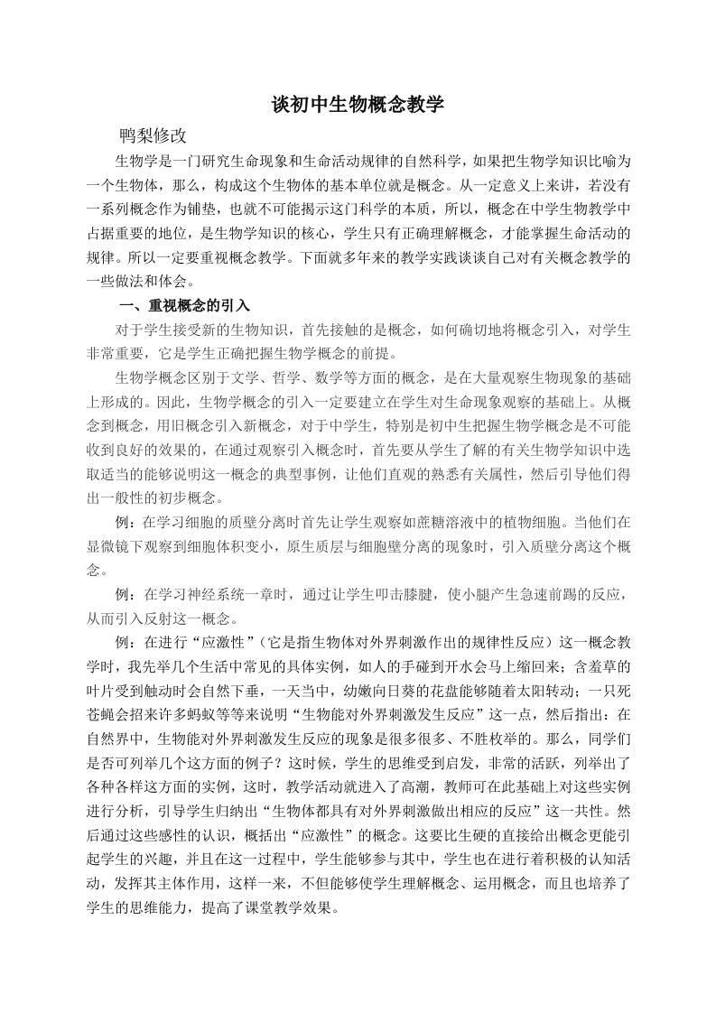 谈初中生物概念教学鸭梨修改生物学是一门研究生命现象和生命活动规律的自然科学,如果把生物学知识比喻为一个生物体,那么,构成这个生物体的基本单位就是概念。从一定意义上来讲,若没有一系列概念作为铺垫,也就不可能揭示这门科学的本质,所以,概念在中学生物教学中占据重要的地位,是生物学知识的核心,学生只有正确理解概念,才能掌握生命活动的规律。所以一定要重视概念教学。下面就多年来的教学实践谈谈自己对有关概念教学的一些做法和体会。一、重视概念的引入对于学生接受新的生物知识,首先接触的是概念,如何确切地将概念引入,对学生非常重要,它是学生正确把握生物学概念的前提。生物学概念区别于文学、哲学、数学等方面的概念,是在大量观察生物现象的基础上形成的。因此,生物学概念的引入一定要建立在学生对生命现象观察的基础上。从概念到概念,用旧概念引入新概念,对于中学生,特别是初中生把握生物学概念是不可能收到良好的效果的,在通过观察引入概念时,首先要从学生了解的有关生物学知识中选取适当的能够说明这一概念的典型事例,让他们直观的熟悉有关属性,然后引导他们得出一般性的初步概念。例:在学习细胞的质壁分离时首先让学生观察如蔗糖溶液中的植物细胞。当他们在显微镜下观察到细胞体积变小,原生质层与细胞壁分离的现象时,引入质壁分离这个概念。例:在学习神经系统一章时,通过让学生叩击膝腱,使小腿产生急速前踢的反应,从而引入反射这一概念。例:在进行“应激性”(它是指生物体对外界刺激作出的规律性反应)这一概念教学时,我先举几个生活中常见的具体实例,如人的手碰到开水会马上缩回来:含羞草的叶片受到触动时会自然下垂,一天当中,幼嫩向日葵的花盘能够随着太阳转动:一只死苍蝇会招来许多蚂蚁等等来说明“生物能对外界刺激发生反应”这一点,然后指出:在自然界中,生物能对外界刺激发生反应的现象是很多很多、不胜枚举的。那么,同学们是否可列举几个这方面的例子?这时候,学生的思维受到启发,非常的活跃,列举出了各种各样这方面的实例,这时,教学活动就进入了高潮,教师可在此基础上对这些实例进行分析,引导学生归纳出“生物体都具有对外界刺激做出相应的反应”这一共性。然后通过这些感性的认识,概括出“应激性”的概念。这要比生硬的直接给出概念更能引起学生的兴趣,并且在这一过程中,学生能够参与其中,学生也在进行着积极的认知活动,发挥其主体作用,这样一来,不但能够使学生理解概念、运用概念,而且也培养了学生的思维能力,提高了课堂教学效果。二、运用类比归纳把握概念本质有些概念,由于表达概念的词语基本相同(腐生、寄生、共生),或内容上有共同的因素(如显性基因、隐性基因、等位基因)致使我们在学习时易混淆不清,在运用时产生错误的理解,把一个概念的某些属性运用到另一个概念中去,因此在学习时要运用类比归纳的方法区分易混淆概念,通过对相关概念的比较和联系,找出概念之间的本质属性,区别概念之间的差异以达到对概念的正确理解和区别。我认为表格是一种比较简单又有效的形式。举例如下表:营养方式特点举例将有机物分解成无机物,并从中获得营枯草杆菌、乳酸菌、霉菌、腐生养,称为分解者蘑菇生活在其他生物体内或体表,并从这些生炭疽杆菌、某些真菌、寄生物中获得营养,称为消费者肺炎双球菌、所有病毒与其它生物共同生活在一起,相互依赖,根瘤菌、黏球菌、真菌与藻共生彼此有利,一旦分开,两者不能独立生活类共生形成的地衣名词概念举例占主导地位,能表现出来的基因,用大写显性基因A-双眼皮字母表示隐性基因会被掩盖的基因,用小写字母表示a-单眼皮在成对的基因中,两个不同的基因称为等等位基因Aa位基因由显性基因控制的性状,可能是成对基因显性性状AA,Aa(双眼皮)都是显性基因(AA),也可是等位基因(Aa隐性基因控制的性状,必须成对基因都是隐性性状aa(单眼皮)隐性(aa)三,重视概念图的运用概念图是一种用来组织和表征知识的有用工具,通常是将有关某一主题不同级别的概念或命题置于方框或圆圈内,再以连线将相关概念和命题连接形成关于该主题的概念或命题网络,这种把概念之间的意义联系以科学命题的形式有机地联系起来的空间网络结构图,叫概念图。概念图以直观形象的方式表达知识结构,能有效呈现思考过程及知识的关联,引导学生进行意义建构。概念图的理论是建构主义理论,建构主义理论认为:学习是学习者把已有的知识和经验为基础,进行知识的主动建构的活动。在生物体的器官、系统教学中,应用概念图教学策略来建构知识结构,复习时需将所学知识进行系统梳理,拓展,更重要的是促进知识的迁移、能力发展、情感态度及价值观的培养。复习中最高境界是用最少时间呈现最大的信息量,培养最强的应用能力和科学探究能力,而且学生还要将前后所学的知识进行联系并重新建构,最终达到迁移和应用的目的。将概念图这一认知工具应用到“生物体的器官、系统”一章学习中,让学生绘制概念图,使他们主动参与知识的回顾及提炼过程,整合新旧知识,建构知识网络,浓缩知识结构,达到灵活迁移知识的目的。如植物的结构层次概念图:细胞分形包括组织分生组织包括包括包括分化成分化