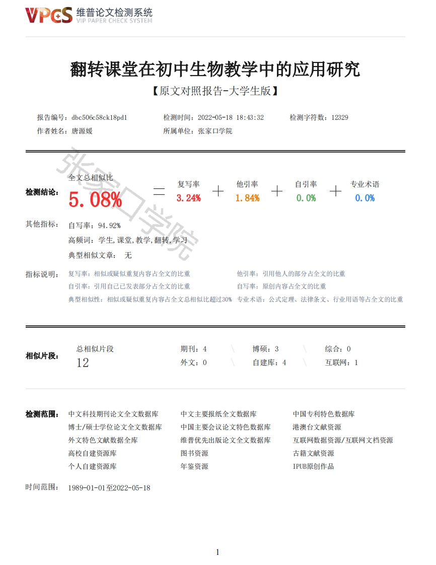 维普论文检测系统/IP PAPER CHECK SYSTEM翻转课堂在初中生物教学中的应用研究【原文对照报告-大学生版】报告编号:dbc506c58ck18pd1检测时间:202205-1818:43:32检测字符数:12329作者姓名:唐源媛所属单位:张家口学院全文总相似比复写率他引率自引率专业术语检测结论:5.08%3.24%1.84%0.0%0.0%其他指标:自写率:94.92%高频词:学生,课堂,教学,翻转,学典型相似文章:无指标说明:复写率:相似或疑似重复内容占全文的比重他引率:引用他人的部分占全文的比重自引率:引用自己已发表部分占全文的比重自写率:原创内容占全文的比重典型相似性:相似或疑似重复内容占全文总相似比超过30%专业术语:公式定理、法律条文、行业用语等占全文的比重总相似片段期刊:4博硕:3综合:0相似片段:12外文:0自建库:4互联网:1检测范围:中文科技期刊论文全文数据库中文主要报纸全文数据库中国专利特色数据库博士/硕士学位论文全文数据库中国主要会议论文特色数据库港澳台文献资源外文特色文献数据全库维普优先出版论文全文数据库互联网数据资源/互联网文档资源高校自建资源库图书资源古籍文献资源个人自建资源库年鉴资源IPUB原创作品时间范围:1989-01-01至2022-05-18维普论文检测系统VIP PAPER CHECK SYSTEM原文对照颜色标注说明:■自写片段■复写片段(相似或疑似重复)口引用片段(引用)■专业术语(公式定理、法律条文、行业用语等)ZHANGJIAKOU UNIVERSITY本科毕业设计(论文)翻转课堂在初中生物教学中的应用研究姓名唐源媛学号18113070102学院旅游与环境学院专业生物科学指导教师远婷二零二二年五月二十日毕业设计(论文)原创性声明本人所提交的毕业设计(论文),是在导师的指导下,独立进行研究工作所取得的原创性成果。除文中已经注明引用的内容外,本论文不包含任何其他个人或集体已经发表或撰写过的研究成果。对本文的研究做出重要贡献的个人和集体,均已在文中标明。本声明的法律后果由本人承担。论文作者(签名):指导教师确认(签名):年月日年月日毕业设计(论文)版权使用授权书本毕业设计(论文)作者完全了解张家口学院有权保留并向国家有关部门或机构送交毕业设计(论文)的复印件和磁盘,允许论文被查阅和借阅。本人授权张家口学院可以将毕业设计(论文)的全部或部分内容编入有关数据库进行检索,可以采用影印、缩印或其它复制手段保存、汇编毕业设计(论文)。保密的毕业设计(论文)在年解密后适用本授权书。论文作者(签名):指导教师(签名):年月日年月日摘要对翻转课堂在初中生物教学中的应用进行研究。以四川大竹中学为例,与初中生物老师交流访谈,对翻转课堂2维普论文检测系统VIP PAPER CHECK SYSTEM在初中生物教学中的优势、局限性、客观评价等问题进行分析和探讨。以参与过初中生物翻转课堂的学生为研究对象,采用问卷调查法,对初中生物翻转课堂的实际效果进行了分析,并对其进行了针对性的改进。综合分析得出结论,翻转课堂在学生自主学习能力的培养和增强、团队意识和人际交往能力的提高、思维能力的发展等方面具有积极效果。但翻转课堂也存在不能保证全体学生均积极参与,对学生的自觉性要求过高以及消耗时间较多等问题。基于在实践中存在的问题,提出培养学生学习主动性,加强学生之间的组织管理监督,多角度关注学生以及改进教学内容等策略。关键词:翻转课堂:初中生物:应用ABSTRACTThe application of flipped classrooms in the teaching of biology in junior high schools wasstudied.Taking Sichuan Dazhu Middle School as an example,through interviews with junior highschool biology teachers,we focused on analyzing the advantages,constraints,objective evaluationsand other issues of flipped classrooms in junior high school biology teaching,and collectedcountermeasures.Taking students who have participated in the junior high school biology flippingclassroom as the research object,the questionnaire survey method is used to analyze the practicaleffect of the flipped classroom in the teaching of junior high school biology,and the correspondingimprovement strategy is proposed.It can be seen from the summary and analysis that the flippedclassroom has positive effects in the cultivation and improvement of independent learning ability,the improvement of team awareness and interpersonal skills,and the development of thinking ability.However,there are also problems such as the active participation of all students in the flippedclassroom,the excessive requirements for students'self-consciousness and the consumption of moretime.Based on the existing problems in practice,he proposes some strategies such as cultivatingthe students'learning initiative,strengthening organizational management supervision among thestudents,paying attention to students from multiple angles,and improving teaching content.Key words:Flipping the classroom:Junior Biology:Apply目录第1章引言第2章翻转课堂的基本理论··············第3章翻转课堂在初中生物教学中的应用现状调查··3.1学生在翻转课堂的学习现状调查及分析····3.1.1学生对生物学科重视程度调查····3.1.2学生课前阶段的态度调查·····3.2教师在翻转课堂的教学现状及分析·····第4章翻转课堂在初中生物教学中的优势······4.2培养学生的团队意识、提升学生的人际交往能力4.3促进学生的思维能力发展·············第5章翻转课堂在初中生物教学中仍然存在的问题···3