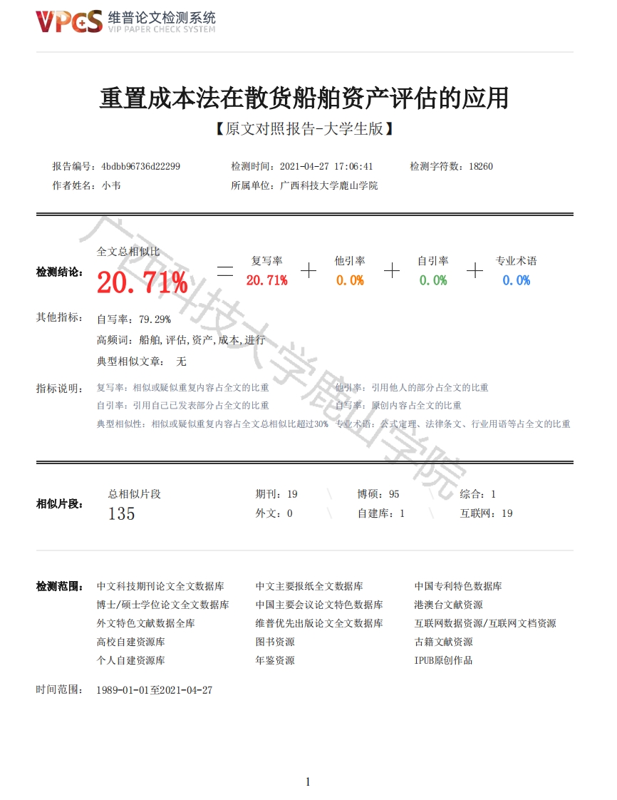 维普论文检测系统/IP PAPER CHECK SYSTEM重置成本法在散货船舶资产评估的应用【原文对照报告-大学生版】报告编号:4bdbb96736d22299检测时间:2021-04-2717:06:41检测字符数:18260作者姓名:小韦所属单位:广西科技大学鹿山学院全文总相似比复写率他引率自引率专业术语检测结论:20.71%20.71%0.0%0.0%0.0%其他指标:自写率:79.29%高频词:船舶,评估,资产,成本,进行典型相似文章:无指标说明:复写率:相似或疑似重复内容占全文的比重他引率:引用他人的部分占全文的比重自引率:引用自己已发表部分占全文的比重自写率:原创内容占全文的比重典型相似性:相似或疑似重复内容占全文总相似比超过30%专亚术语:公式定理、法律条文、行业用语等占全文的比重总相似片段期刊:19博硕:95综合:1相似片段:135外文:0自建库:1互联网:19检测范围:中文科技期刊论文全文数据库中文主要报纸全文数据库中国专利特色数据库博士/硕士学位论文全文数据库中国主要会议论文特色数据库港澳台文献资源外文特色文献数据全库维普优先出版论文全文数据库互联网数据资源/互联网文档资源高校自建资源库图书资源古籍文献资源个人自建资源库年鉴资源IPUB原创作品时间范围:1989-01-01至2021-04-27维普论文检测系统VIP PAPER CHECK SYSTEM原文对照颜色标注说明:■自写片段■复写片段(相似或疑似重复)口引用片段(引用)■专业术语(公式定理、法律条文、行业用语等)柳州工学院毕业设计(论文)评估的应用学院:经济管理学院专业班级:资产评估172班姓名:韦芳学号:20171495指导教师:陈小倩/陈巧巧职称:会计师西利技大学鹿山之题目:重置成本法在散货船舶资产二O二一年四月三十日摘要近年来我国社会主义市场经济呈进步与迅猛发展趋势,资产评估服务的范围逐渐扩广,其中资产评估服务对象的分工和类型也变得愈加冗杂。现如今,船舶资产进行的评估服务已经涵盖了从作价入股、产权交换、损失补偿、争议调解等许多方面,船舶资产审计在我国社会主义市场经济中扮演着愈加重要的角色,如何评估、怎样评估,才能用合理的价格表达出船舶应具有的真实价值是目前面临的一个常见问题。首先,本文介绍了船舶资产的结构、特点以及评估程序,以散货船舶“海华6608”为例。根据船舶的结构特征结合资产评估的理论知识,选择重置成本法对船舶进行评估。其次,对船舶在重置成本法中存在的问题进行分析,从中发现成新率存在计算不合理、参数指标选取缺乏依据等系列问题。因此,对重置成本法进行改进,依据《船舶产品报价手册》等资料对参数指标进行选取,利用模糊综合评价法运用于成新率的计算。有利于规范了资产评估行业的发展,并且对资产评估的实务研究具有参考价值。关键词:重置成本法:船舶资产评估:模糊综合评价法AbstractIn recent years,China's socialist market economy has shown a trend of progress and rapiddevelopment.The scope of asset appraisal services is gradually expanding,and the division andtypes of asset appraisal services are increasingly complex.At present,ship assets evaluationservice has covered many aspects such as pricing,equity trading,loss compensation,disputemediation,etc.ship assets audit plays an increasingly important role in China's socialist marketeconomy.How to express the true value of the ship at a reasonable price is a common problem.Firstly,this paper introduces the structure,characteristics and evaluation procedure of shipassets by taking the bulk carrier "Haihua 6608"as an example.According to the structural2维普论文检测系统VIP PAPER CHECK SYSTEMcharacteristics of the ship,combined with the theoretical knowledge of asset evaluation,thereplacement cost method is selected to evaluate the ship.Secondly,it analyzes the problemsexisting in the replacement cost method and finds that the calculation of the new rate isunreasonable and the parameter selection is lack of basis.Therefore,the replacement cost method isimproved,and the parameters are selected according to the quotation Manual of ship products.Themethod of fuzzy comprehensive evaluation is used to calculate the newness rate.It is helpful tostandardize the development of asset appraisal industry and has reference value for the research ofasset appraisal practice.Key words:replacement cost method;ship assets evaluation;fuzzy comprehensive evaluation method目录摘要IAbstractII一、绪论1(一)研究背景与意义11.研究背景12.研究意义1(二)研究内容与方法21.研究内容22.研究方法2二、船舶资产评估理论基础3(一)船舶的结构与特点31.船舶的结构32.船舶的特点31.评估原则42.评估程序4科技大学鹿山学院(二)船舶资产评估原则及评估程序4(三)船舶资产评估的影响因素61.船舶种类和船体结构62.船舶技术状况和设备63.船舶航行路线64.船舶证书6(四)船舶资产评估方法比较和选择61.船舶资产评估方法比较62.船舶资产评估方法选择7(五)重置成本法相关理论71.重置成本法的应用前提72.重置成本法的公式83.模糊综合评价法8三、重置成本应用在散货船舶中存在的问题及改进分析9(一)重置成本法在船舶价值评估中存在的问题91.技术指标的选取缺乏依据92.成新率的确定存在缺陷93.公式选用不合理9(二)重置成本法在船舶资产评估的规范化改进91.材料费用和设备费用的计算102.人工费用与生产专用费的计算133.利润、税金及资金成本的计算143
