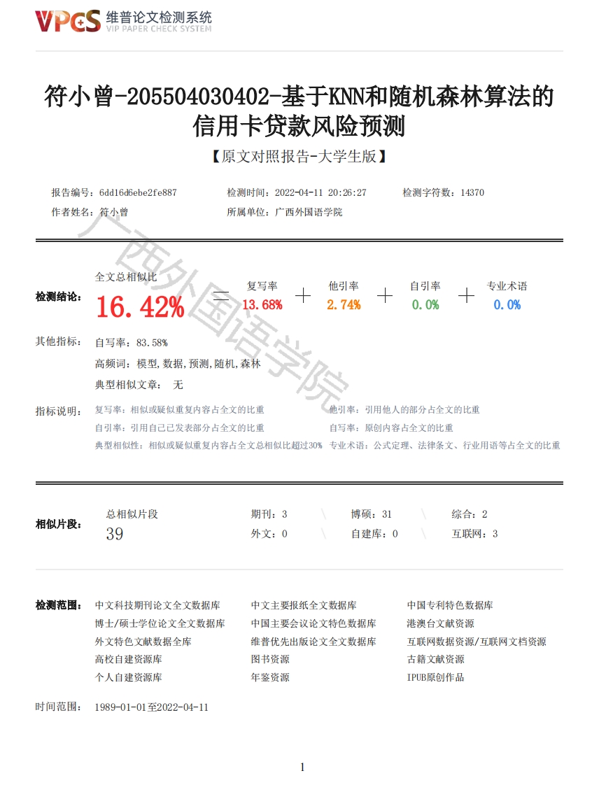 维普论文检测系统VIP PAPER CHECK SYSTEM符小曾-205504030402-基于N和随机森林算法的信用卡贷款风险预测【原文对照报告-大学生版】报告编号:6dd16d6ebe2fe887检测时间:2022-04-1120:26:27检测字符数:14370作者姓名:符小曾所属单位:广西外国语学院全文总相似比复写率他引率自引率专业术语检测结论:16.42%13.68%2.74%0.0%0.0%其他指标:自写率:83.58%高频词:模型,数据,预测,随机,森典型相似文章:无语学院指标说明:复写率:相似或疑似重复内容占全文的比重引率:引用他人的部分占全文的比重自引率:引用自己已发表部分占全文的比重自写率:原创内容占全文的比重典型相似性:相似或疑似重复内容占全文总相似比超过0%专业术语:公式定理、法律条文、行业用语等占全文的比重总相似片段期刊:3博硕:31综合:2相似片段:39外文:0自建库:0互联网:3检测范围:中文科技期刊论文全文数据库中文主要报纸全文数据库中国专利特色数据库博士/硕士学位论文全文数据库中国主要会议论文特色数据库港澳台文献资源外文特色文献数据全库维普优先出版论文全文数据库互联网数据资源/互联网文档资源高校自建资源库图书资源古籍文献资源个人自建资源库年鉴资源IPUB原创作品时间范围:1989-01-01至2022-04-11维普论文检测系统VIP PAPER CHECK SYSTEM原文对照颜色标注说明:■自写片段■复写片段(相似或疑似重复)口引用片段(引用)■专业术语(公式定理、法律条文、行业用语等)GUANGXI UNIVERSITY OF FOREIGN LANGUAGES本科毕业论文中文题目基于KNN和随机森林算法的信用卡贷款风险预测s外文题目Credit Card Loan Risk Prediction Based on KNN and Stochastic Forest Algorithm二级学院:信息工程学院专业:网络工程年级:2020级姓名:符小曾学号:205504030402指导教师:雷渊2022年4月10日广西外国语学院毕业论文(设计)学术诚信声明本人郑重声明:所呈交的毕业论文(设计),是本人在导师的指导下,独立进行研究工作所取得的成果。除文中已经注明引用的内容外,本论文(设计)不包含任何其它个人或集体已经发表或撰写过的作品成果。对本文的研究做出重要贡献的个人和集体,均已在文中以明确方式标明。本人完全意识到本声明的法律结果由本人承担。作者签名:年月日广西外国语学院毕业论文(设计)版权使用授权书本毕业论文(设计)作者同意学校保留并向国家有关部门或机构送交论文(设计)的复印件和电子版,允许论文(设计)被查阅和借阅。本人授权广西外国语学院可以将本毕业论文(设计)的全部或部分内容编入有关数据库2维普论文检测系统VIP PAPER CHECK SYSTEM进行检索,可以采用影印、缩印或扫描等复制手段保存和汇编本毕业论文(设计)。毕业论文(设计)作者签名:指导教师签名:年月日年月日目录1.1研究背景和意义·········1.2国内外研究现状1.2.1国外研究现状1.2.2国内研究现状、···2.理论和关键技术····2.1信用卡贷款风险预测模型概述2.2KN算法············2.3随机森林算法·····53.数据集描述及预处理·····3.1.1数据来源说明·····3.1.2数据特征分析······3.2数据预处理········4.模型的建立与比对·····4.1数据样本不均衡解决方法··124.2数据标准化·······4.3KN模型建立·······144.5模型参数调优······5.总结与展望·········3