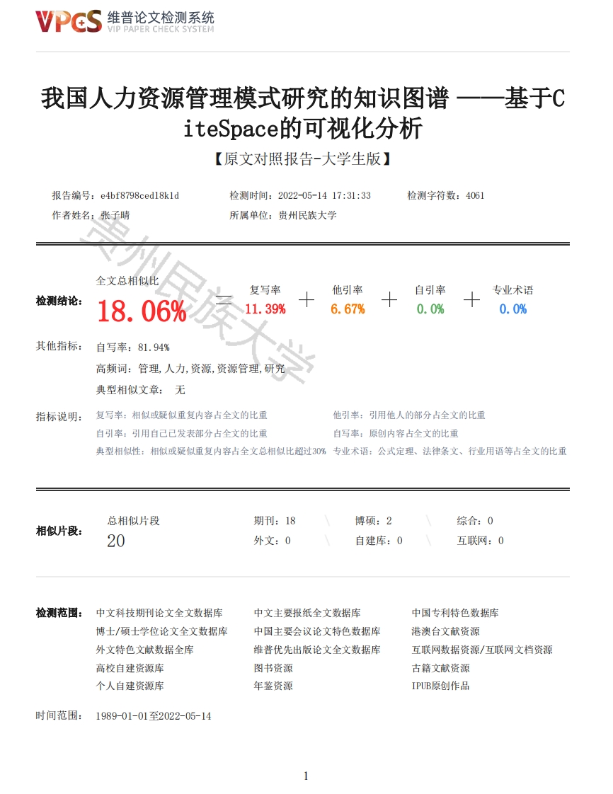 维普论文检测系统VIP PAPER CHECK SYSTEM我国人力资源管理模式研究的知识图谱一一基于CiteSpace的可视化分析【原文对照报告-大学生版】报告编号:e4hf8798ced18k1d检测时间:2022-05-1417:31:33检测字符数:4061作者姓名:张子晴所属单位:贵州民族大学全文总相似比复写率他引率自引率专业术语检测结论:18.06%11.39%6.67%0.0%0.0%其他指标:自写率:81.94%高频词:管理,人力,资源,资源管理,研究典型相似文章:无指标说明:复写率:相似或疑似重复内容占全文的比重他引率:引用他人的部分占全文的比重自引率:引用自己已发表部分占全文的比重自写率:原创内容占全文的比重典型相似性:相似或疑似重复内容占全文总相似比超过30%专业术语:公式定理、法律条文、行业用语等占全文的比重总相似片段期刊:18博硕:2综合:0相似片段:20外文:0自建库:0互联网:0检测范围:中文科技期刊论文全文数据库中文主要报纸全文数据库中国专利特色数据库博士/硕士学位论文全文数据库中国主要会议论文特色数据库港澳台文献资源外文特色文献数据全库维普优先出版论文全文数据库互联网数据资源/互联网文档资源高校自建资源库图书资源古籍文献资源个人自建资源库年鉴资源IPUB原创作品时间范围:1989-01-01至2022-05-14维普论文检测系统VIP PAPER CHECK SYSTEM原文对照颜色标注说明:■自写片段■复写片段(相似或疑似重复)口引用片段(引用)■专业术语(公式定理、法律条文、行业用语等)我国人力资源管理模式研究的知识图谱一一基于CiteSpace的可视化分析摘要分析我国人力资源管理模式学科分的布,不同机构、作者合作关系,寻找研究核心,挖掘研究热点,梳理研究历程,推动我国人力资源管理模式的发展。运用CiteSpace软件对CNKI数据库中的核心期F刊、CSSCI来源期刊进行定量分析,绘制我国人力资源管理模式研究合作机构、作者合作、关键词共现、关键词时区可视化图谱。关键词:人力资源管理模式:CiteSpace:知识图谱1绪论人力资源管理模式,是一种基于管理理念的人力资源管理实践系统[1]。人力资源管理模式政策工具更加注重服务对象的需求,改进服务方式,加强基于需求的政策工具的运用,促进企业人力资源管理模式的人性化、社会化,对人力资源管理模式的研究也成为理论界关注的焦点,相关的研究成果已经不少。然而,通过检索发现,理论界对人力资源管理模式研究成果展开计量分析的成果较少。基于此,本文拟运用当前理论界最流行的文献计量分析软件-一CiteSpace,对我国人力资源管理模式研究文献进行分析,旨在探索人力资源管理模式研究的发展脉络与研究热点,期待为后续研究提供借鉴2数据来源与研究方法2.1数据来源目前,CNKI是中国完整、权威的期刊数据库。本文的所有样本数据均来自CNKI。这篇文章是以主题检索的”人力资源管理模式”从1992年到2021年。期刊的类别是”核心期刊,"”CSSCI期刊”和"CSCD期刊。”搜索日期为2022年5月10日,共检索到752条记录。为确保文献的典型性和准确性,以Refworks格式获得737项记录,并将其输入CiteSpace软件进行分析,采用数据清理和人工删除的方法,删除了研究论文、论坛发言、书籍展示、论文和明显不符合主题的材料等非学术文献。2.2研究方法CiteSpace软件是陈超美学者开发的可视化应用软件[2]。本文运用CiteSpace?软件将737篇有效文献绘制呈相应的知识图谱。首先将知网中的737篇有效文献用Re fworks格式导出,随后运行CiteSpace软件分析数据,选择的分析对象为作者、机构、关键词,以此来对人力资源管理模式领域总体框架的探讨。3人力资源管理模式热点分析通过对文献发文量、关键词共现,核心作者,研究机构等内容的分析、总结及梳理,才能知晓在新时代背景下我国人力资源管理模式研究的新方向和新视角。3.1时间与阶段为了衡量人力资源管理模式的研究热度和发展趋势,本文对1992-2021年国内人力资源管理模式研究的年度发文量进行统计,并运用Exc1软件绘制出年度发文量的分布(图1),由此对进30年来人力资源管理模式研究论文的总2维普论文检测系统VIP PAPER CHECK SYSTEM体分布情况和基本趋势进行分析。由图1可以看出,自1992年起,国内关于人力资源管理模式研究的发文量总体上呈先升后降的趋势。图1发表在核心期刊和CSSCI来源期刊上以“人力资源管理模式”为主题的发文量总体趋势图通过相关文献阅读,结合发文量和发文时间,理论界对人力资源管理模式的研究大致课划分为以下三个阶段。第一阶段:1992-1998年,研究的萌芽时期。1998年以前,人力资源管理模式研究的文献减少,发文量均少于10篇,尚未形成研究热点,理论界对人力资源管理模式的研究是基于中国市场经济体制的逐步建立为背景的形式下产生和发展起来的,对我国人力资源管理模式发展实践进行了探讨。第二阶段:1999-2009年,研究的成长阶段。自1999年开始,人力资源管理模式研究文献逐年增加,在2006和2007年达到最大值,人力资源管理模式在企业运行中的地位和作用越来越突出,受到各种企业的高度重视和欢迎。第三阶段:2010-2021年,研究的成熟阶段。自2010年开始,关于人力资源管理模式研究的文献呈下降趋势,人力资源管理模式研究逐步迈向理性和成熟阶段。3.2文献被引情况高被引文献是指被引频次较高、周期较长的学术论文,能够客观反映论文的影响力及其在学术交流中的作用和地位[16],能够反映出该领域的