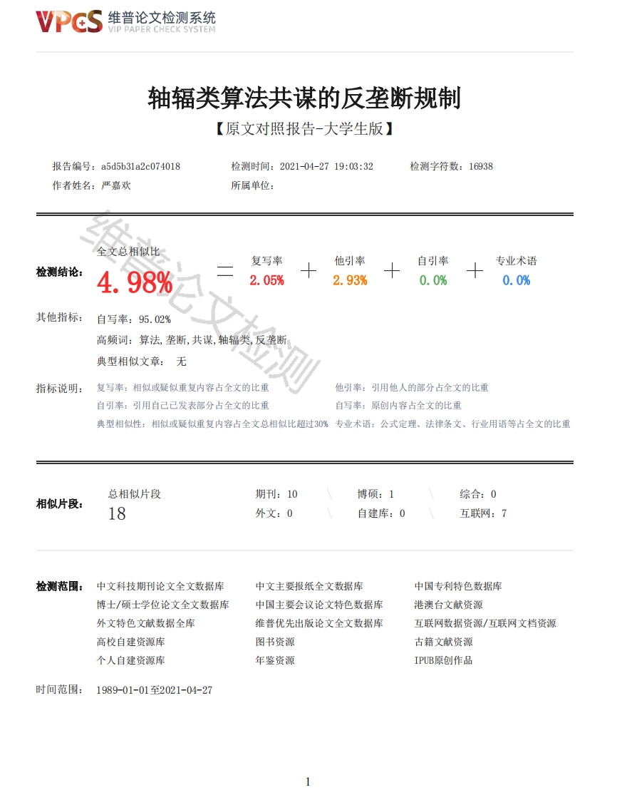 维普论文检测系统轴辐类算法共谋的反垄断规制【原文对照报告-大学生版】报告编号:a5d5b31a2c074018检测时间:2021-04-2719:03:32检测字符数:16938作者姓名:严嘉欢所属单位:全文总相似比复写率他引率自引率专业术语检测结论:4.98%2.05%2.93%0.0%0.0%其他指标:自写率:95.02%高频词:算法,垄断,共谋,轴辐类,反垄断典型相似文章:无指标说明:复写率:相似或疑似重复内容占全文的比重他引率:引用他人的部分占全文的比重自引率:引用自己已发表部分占全文的比重自写率:原创内容占全文的比重典型相似性:相似或疑似重复内容占全文总相似比超过30%专业术语:公式定理、法律条文、行业用语等占全文的比重总相似片段期刊:10博硕:1综合:0相似片段:18外文:0自建库:0互联网:7检测范围:中文科技期刊论文全文数据库中文主要报纸全文数据库中国专利特色数据库博士/硕士学位论文全文数据库中国主要会议论文特色数据库港澳台文献资源外文特色文献数据全库维普优先出版论文全文数据库互联网数据资源/互联网文档资源高校自建资源库图书资源古籍文献资源个人自建资源库年鉴资源IPUB原创作品时间范围:1989-01-01至2021-04-27维普论文检测系统VIP PAPER CHECK SYSTEM原文对照颜色标注说明:■自写片段■复写片段(相似或疑似重复)☐引用片段(引用)■专业术语(公式定理、法律条文、行业用语等)引言放眼国际,各国都开始重视大数据的发展,数据全球化趋势明显。在大数据时代下,随着互联网技术的发展,算法逐渐成为商家扩大生产、经营的重要技术手段。算法可以通过各类指令,实现个性化的需求。尤其是在资本交易过程中,交易者可以运用不同的算法策略,快速达成最优的交易方案,故算法在市场交易中扮演着重要的角色。在算法技术给我们带来极大便利的同时,也要注意到其伴随着的垄断风险。算法技术也可能会被经营者滥用,成为操纵市场价格价格、损害消费者利益、挑战执法机构的垄断工具。[1]由于数据的易得性和算法的智能性,使用算法来达成垄断协议,可以降低所需的成本并提高达成一致的效率。企业使用算法对获取到的商业数据进行分析、计算、预测,甚至以此达到限制或排除竞争的效果,产生了巨大的垄断危害。轴辐类算法共谋是目前已知算法共谋类型的其中之一,作为明示算法共谋,轴辐类算法主要是指多个经营者使用同一套或近似的定价算法,根据数据分析实现实时性、自动性的价格调整,从而在竞争者之间形成横向垄断,达到排除、限制其他竞争者的效果。轴辐算法以其具有能够实现实时的价格分析与调整的巨大便捷性,深受商家的青睐。在大部分轴辐类算法共谋案件中,纵向垄断协议的证明较为容易,而横向垄断协议却往往没有明确的证据加以证明。作为明示算法共谋之一,轴辐算法共谋具有隐蔽性、智能性、稳定性的特征,其降低了市场透明度,具有垄断风险。轴辐类算法有极大的可能被商家垄断工具以起到限制、排除竞争的效果。对于轴辐类算法的反垄断法规制研究,将有力地保障消费者的合法利益,确保市场信息数据的正确化、合规化、安全化地获取与使用,促进我国经济健康发展与经营市场的良性竞争。此外,目前我国正积极建设开放型经济新体制,这势必需要中国企业积极投入到全球经济化浪潮中。在将来中国企业进行对外贸易的时候,可能会面临外国对于我国企业所运用的算法的反垄断检查。针对轴辐类算法共谋的反垄断规制,可以保障算法市场的规范运行,在经济全球化的大趋势下为中国企业的海外经营保驾护航。一、轴辐类算法共谋概述(一)算法的定义算法的英文是一位数学家名字的音译,[2]最初算法一词用于指代数学中的欧几里得算法等数学计算方法。在步入信息时代之后,算法成为描述计算机运行特定程序、实现特定功能的指令的总称,计算机能够实现正常功能运行的关键便是算法。算法可以对数据进行分析,通过各类指令,实现个性化的需求。2017年经合组织举办了以“算法合谋”为主题的会议,这次会议主要讨论算法对于反垄断执法带来的一些挑战,本文拟采用在该会议背景文件中使用的算法的概念:算法是一个明确的、精确的、简单操作的列表,机械地、系统地应用到一组指令或对象,初始状态为输入,最终状态是输出。[3]算法表示方式众多,包含语言、列表、图片、代码、计算机程序等。(二)轴辐类算法共谋的定义算法共谋是互联网领域中的新型垄断形式,其实质是利用计算机系统、程序作为媒介实施的限制、排除竞争的行为。2015年牛津大学法学教授阿里尔·扎拉奇和美国田纳西大学法学教授斯图克提出了算法共谋的理念。[4]他们将算法共谋分成四种类型,信使类共谋、中心辐射式共谋(轴辐类共谋)、预测类共谋和自主类共谋四种类型。(见图1-1)2维普论文检测系统VIP PAPER CHECK SYSTEM在四大分类的基础上,还可以按照共谋的表意是否显明,分为明示共谋和默示共谋两种类型,其中信使类和轴辐类共谋属于属于明示共谋,而预测类和自主类共谋属于默示共谋。明示共谋是指经营者之间通过明显的协议达成垄断效果。[5]相反的是,默示共谋只需要通过双方之间的相互信赖即可默许达成。算法共谋明示共谋欧示共谋信使类共谋预测类共谋自主类共谋算法自主意识增强,人为意识减弱图1-1算法共谋分类图轴辐类算法共谋因其形成共谋的具体