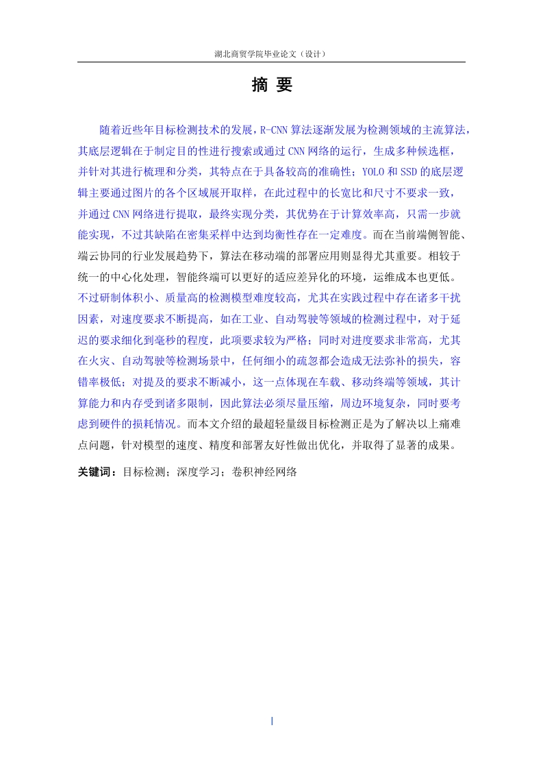 湖北商贸学院毕业论文〔设计)摘要随着近些年目标检测技术的发展,R-CNN算法逐渐发展为检测领域的主流算法,其底层逻辑在于制定目的性进行搜索或通过CNN网络的运行,生成多种候选框,并针对其进行梳理和分类,其特点在于具备较高的准确性:Y0L0和S$D的底层逻辑主要通过图片的各个区域展开取样,在此过程中的长宽比和尺寸不要求一致,并通过CNN网络进行提取,最终实现分类,其优势在于计算效率高,只需一步就能实现,不过其缺陷在密集采样中达到均衡性存在一定难度。而在当前端侧智能、端云协同的行业发展趋势下,算法在移动端的部署应用则显得尤其重要。相较于统一的中心化处理,智能终端可以更好的适应差异化的环境,运维成本也更低。不过研制体积小、质量高的检测模型难度较高,尤其在实践过程中存在诸多干扰因素,对速度要求不断提高,如在工业、自动驾驶等领域的检测过程中,对于延迟的要求细化到毫秒的程度,此项要求较为严格:同时对进度要求非常高,尤其在火灾、自动驾驶等检测场景中,任何细小的疏忽都会造成无法弥补的损失,容错率极低:对提及的要求不断减小,这一点体现在车载、移动终端等领域,其计算能力和内存受到诸多限制,因此算法必须尽量压缩,周边环境复杂,同时要考虑到硬件的损耗情况。而本文介绍的最超轻量级目标检测正是为了解决以上痛难点问题,针对模型的速度、精度和部署友好性做出优化,并取得了显著的成果。关键词:目标检测:深度学习:卷积神经网络湖北商贸学院毕业论文〔设计)ABSTRACTTarget detection has made important progress in recent years.The main idea ofmainstream algorithms such as R-CNN algorithm is to generate a series of sparsecandidate frames through selective search or CNN network (RPN),and then classifyand regress these candidate frames,with the advantage of high accuracy;YOLO andSSD,whose main idea is to uniformly and densely sample the images at differentlocations,and then use CNN to extract features and directly classify and regress,thewhole process takes only one step.densely sampled at different locations of the image,the sampling can be done at different scales and aspect ratios,and then the features areextracted using CNN and then directly classified and regressed,the whole process takesonly one step,so its advantage is fast,but an important disadvantage of uniform densesampling is that training is more difficult.Compared to unified centralized processing,smart terminals can better adapt to differentiated environments and have lower O&Mcosts.However,developing a high-quality lightweight target detection model is not soeasy,and there are often many challenges in the real environment:speed,such asindustrial vision quality inspection,autonomous driving and other real-time scenarios,the acceptable range of delay often needs to be in the millisecond level,which isextremely demanding;high accuracy,in scenarios such as autonomous driving and firedetection,a small error can bring serious losses.The tolerance for false detection andmissed detection is very low;the size should be small,in the cell phone,car,IOT andother edge-end deployment,arithmetic power and memory are limited,the algorithmneeds to achieve the ultimate compression;the deployment environment is complex anddiverse,the hardware device power consumption,specifications of various kinds.Themost ultra-lightweight target detection introduced in this paper is designed to solve theabove pain and difficulty problems,optimizing the model for speed,accuracy anddeployment friendliness,and achieving remarkable results.Key words:Target detection;Deep learning;Convolutional neural network湖北商贸学院毕业论文〔设计)第一章绪论1.1研究背景与意义现阶段,人类接触与了解外界的方式方法基本是通过视觉、嗅觉、听觉、味觉和触觉而来。其中视觉是人类最直观的获取外界信息的方式。经过历史岁月的变迁,眼下如今人类已经研究发明出可以模拟人眼成像的技术设备。将信息储存到数字图像中,进而推演出数字图像的处理过程,这一学科称之为计算机视觉。目标检测是计算机视觉技术中相当基础却也甚为重要的一项任务,它负责对数字图像中的单个或多个目标进行识别和定位。这些年中,超轻量网络技术推陈出新,基于超轻量网络的技术已经取得了硕大的进步,并且正在走出实验室进入工业领域。目标检测技术是计算机视觉系统极为关键的任务额,其在生活与工作中的多个场景得到广泛应用。例如,医学图像分析、自动驾驶汽车、业务分析和人脸识别等都依赖于目标检测技术,已经融入了我们生活的方方方面。上述应用程序所需要的计算设施可能是云计算设施、通用GPU、物联网集群或单个嵌入式设备。为了设计一种有效的目标检测器,模型缩放技术极为关键,其能够在有效提升检测设备的时效性和精确性。(1)自动驾驶:在现代智能化交通领域中,自动驾驶技术无疑是其中的亮点。该技术得益于车辆对周边环境的识别,对动态化的物体进行全方位感知,在此基础上对周围车辆、障碍物、交通标识等物件进行全面感知和识别。这也成为自动驾驶技术得以发展和普及的先决条件。(2)安防监控系统:安全防护监控系统是基于原有的监控体系的完善和升级,传统的监控系统离不开管理人员的操作,无形中增加人力成本。随着现代安全防护监控系统的发展和升级,自动识别功能得到全面发挥,其对所有动态和静态的物体进行全面捕捉。将其运用在工作场所,可对来访接待、重要资产丢失、外来人员入侵等情况发出警报。其在