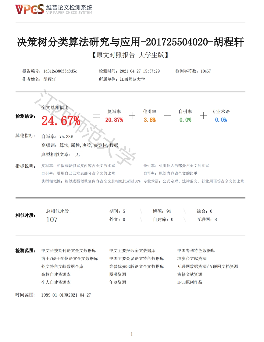 首页毕业论文大数据决策树分类算法研究与应用201725504020胡程轩_原文对照报告