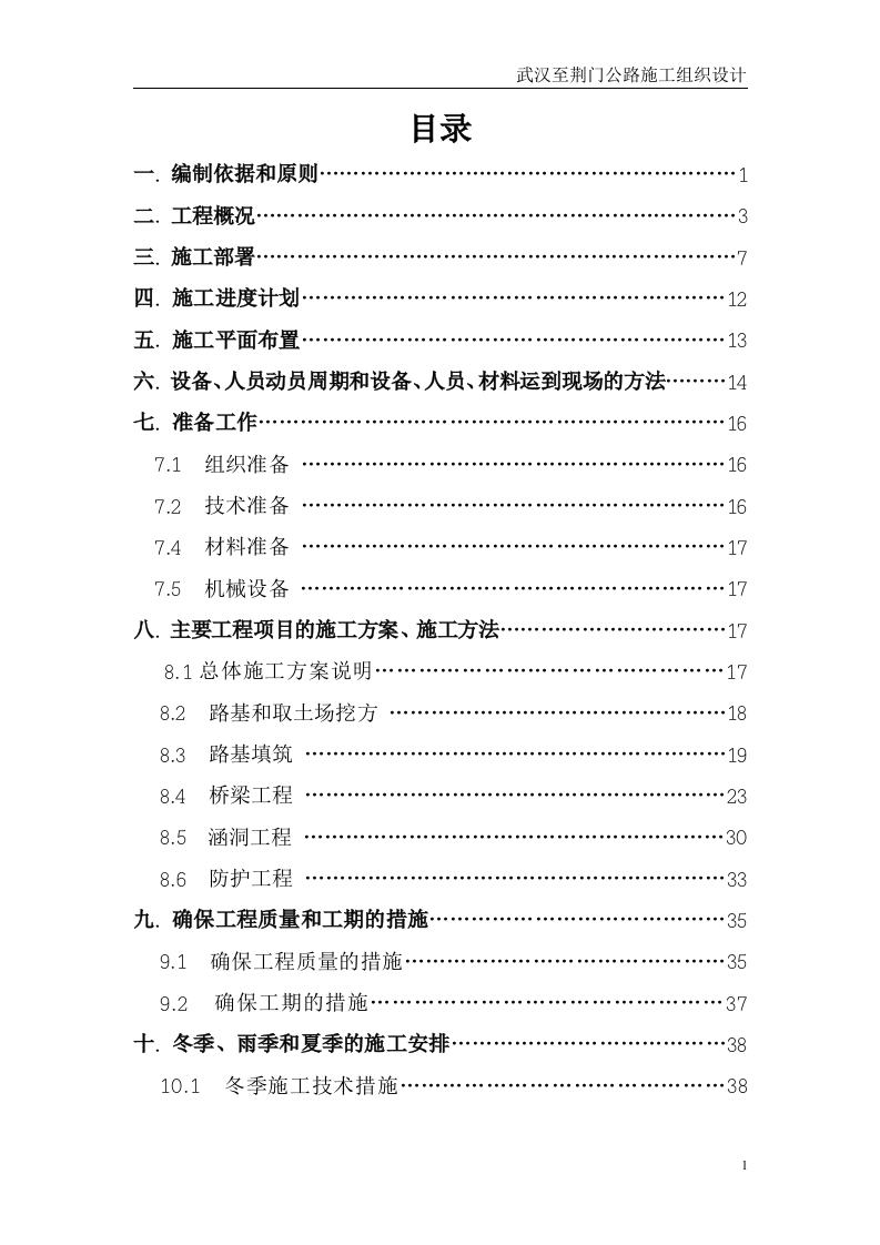 武汉至荆门公路施工组织设计目录一,编制依据和原则…二.工程概况…3三.施工部署……7四.施工进度计划…五.施工平面布置……13六.设备、人员动员周期和设备、人员、材料运到现场的方法…14七.准备工作……167.1组织准备…167.2技术准备7.4材料准备7.5机械设备八.主要工程项目的施工方案、施工方法…178.2路基和取土场挖方8.3路基填筑8.4桥梁工程8.5涵洞工程8.6防护工程33九.确保工程质量和工期的措施……359.1确保工程质量的措施……………35十.冬季、雨季和夏季的施工安排…3810.1冬季施工技术措施…381武汉至荆门公路施工组织设计10.2雨季施工技术措施………4110.3夏季施工技术措施………4410.4其它注意事项……45十一.质量、安全保证体系……4511.1质量保证体系…11.2安全保证体系表5主要分项工程施工工艺框图……53表5-1膨胀土处理…表5-2路基工程施工工艺框图…表5-3钻孔灌注桩施工工艺框图…表5-4T梁施工工艺框图…59表5-5梁板安装施工工艺框图表5-6钢筋砼连续箱梁施工工艺框图…62表5-7涵洞工程施工工艺框图…………64表5-7防护工程施工工艺框图…65表6施工总体计划表…