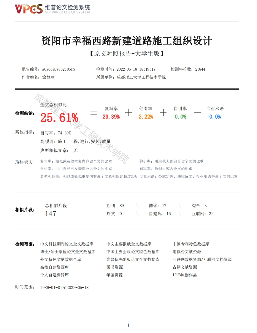 维普论文检测系统VIP PAPER CHECK SYSTEM资阳市幸福西路新建道路施工组织设计【原文对照报告-大学生版】报告编号:a0a0da07852c85f5检测时间:2022-05-1818:19:17检测字符数:23844作者姓名:涂恒瑜所属单位:成都理工大学工程技术学院全文总相似比复写率他引率自引率专业术语检测结论:25.61%23.39%2.22%0.0%0.0%其他指标:自写率:74.39%高频词:施工,工程,进行,安装,质量典型相似文章:无指标说明:复写率:相似或疑似重复内容占全文的比重他引率:引用他人的部分占全文的比重自引率:引用自己已发表部分占全文的比重自写率:原创内容占全文的比重典型相似性:相似或疑似重复内容占全文总相似比超过30%专业术语:公式定理、法律条文、行业用语等占全文的比重总相似片段期刊:89博硕:17综合:3相似片段:147外文:0自建库:16互联网:22检测范围:中文科技期刊论文全文数据库中文主要报纸全文数据库中国专利特色数据库博士/硕士学位论文全文数据库中国主要会议论文特色数据库港澳台文献资源外文特色文献数据全库维普优先出版论文全文数据库互联网数据资源/互联网文档资源高校自建资源库图书资源古籍文献资源个人自建资源库年鉴资源IPUB原创作品时间范围:1989-01-01至2022-05-18维普论文检测系统VIP PAPER CHECK SYSTEM原文对照颜色标注说明:■自写片段■复写片段(相似或疑似重复)口引用片段(引用)■专业术语(公式定理、法律条文、行业用语等)资阳市幸福西路新建道路施工组织设计作者名称:涂恒瑜专业名称:土木工程指导教师:余婷讲师摘要该篇城市道路的施工组织设计是针对施工中的各个环节所用技术及人员配置等情况的一个综合性说明文件。工程坚持“安全、文明、环保、经济”的设计理念,对各施工阶段进行施工设计。该篇施工组织设计大致包括编制说明、工程概况、施工组织机构及现场平面布置、各分项工程的施工方案与技术措施、质量和安全管理体系与措施、施工进度计划、工程应急预案等内容。其中重点编写的是施工方案与技术措施,因为它是直接关系到施工质量的重要因素。该篇施工组织设计的各个章节都是在满足国家及地方对于城市道路工程相关规定的基础上编写的。对于各个环节需要用到的人工,材料,机械,技术都做了详细的阐述。为达到其对施工的指导作用,其中充分考虑了各个方案的可行性,合理性和经济性。关键词:城市道路施工,施工组织设计,施工方案与技术措施,安全,质量AbstractThe construction organisation and design of urban roads is a comprehensive explanation documentfor the technology and staffing used in various links in the construction.The project adheres tothe design concept of "safety,civilisation,environmental protection and economy"and carries outconstruction design at all construction stages.The construction organisation design of this articleroughly includes the compilation instructions,the general situation of the project,theconstruction organisation and on-site plane layout,the construction plans and technical measures ofeach sub-project,the quality and safety management system and measures,the construction progressplan,the project emergency plan,etc.Among them,the construction plan and technical measures arewritten,because it is an important factor directly related to the construction quality.The chaptersof this construction organisation and design are compiled on the basis of meeting the relevantnational and local regulations on urban road projects.The labour,materials,machinery andtechnology that need to be used in each link are described in detail.In order to achieve itsguiding role in construction,the feasibility,rationality and economy of each scheme are fullyconsidered.Strive to build an impeccable model project for the owners.Keywords:urban road construction,construction organisation design,construction plan andtechnical measures,safety,quality目录2维普论文检测系统VIP PAPER CHECK SYSTEM1编制说明·····1.1编制依据1.2原则········2工程概况···2.1工程简介2.2气象资料2.3水文资料2.4地形地貌2.5地震··········2.6主要工程量··········3施工总体部署和准备3.1施工组织结构体系·····3.2施工任务划分和施工顺序···103.2.1施工任务划分·······10103.3主要施工阶段工期分析103.4施工准备·······103.4.1技术准备·······10104施工方案与技术措施···124.1工程测量·········124.2土石方工程······4.2.1土石方开挖·····124.2.2土方回填······4.3道路工程······3