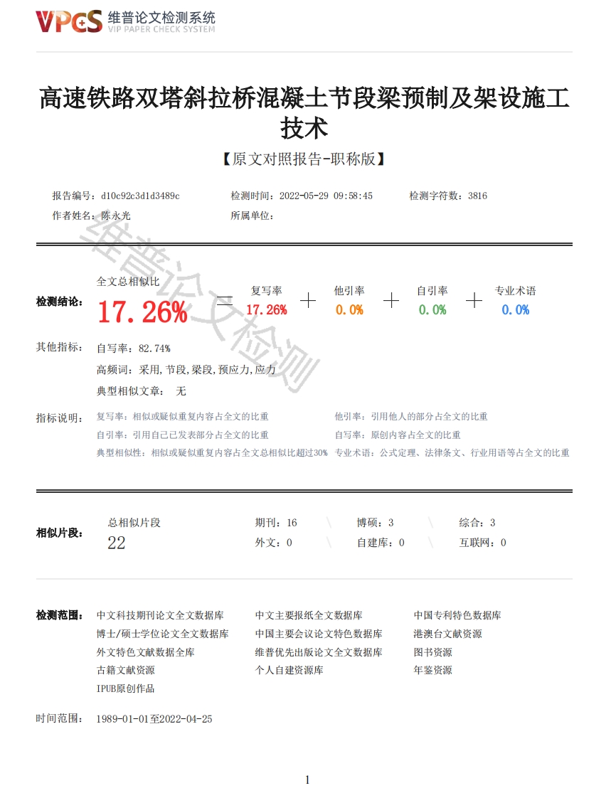 维普论文检测系统VIP PAPER CHECK SYSTEM高速铁路双塔斜拉桥混凝土节段梁预制及架设施工技术【原文对照报告-职称版】报告编号:d10c92c3d1d3489c检测时间:2022-05-2909:58:45检测字符数:3816作者姓名:陈永光所属单位:全文总相似比复写率他引率自引率专业术语检测结论:17.26%17.26%十0.0%0.0%0.0%其他指标:自写率:82.74%高频词:采用,节段,梁段,预应力,应力典型相似文章:无指标说明:复写率:相似或疑似重复内容占全文的比重他引率:引用他人的部分占全文的比重自引率:引用自己已发表部分占全文的比重自写率:原创内容占全文的比重典型相似性:相似或疑似重复内容占全文总相似比超过0%专业术语:公式定理、法律条文、行业用语等占全文的比重总相似片段期刊:16博硕:3综合:3相似片段:22外文:0自建库:0互联网:0检测范围:中文科技期刊论文全文数据库中文主要报纸全文数据库中国专利特色数据库博士/硕士学位论文全文数据库中国主要会议论文特色数据库港澳台文献资源外文特色文献数据全库维普优先出版论文全文数据库图书资源古籍文献资源个人自建资源库年鉴资源IPUB原创作品时间范围:1989-01-01至2022-04-25维普论文检测系统VIP PAPER CHECK SYSTEM原文对照颜色标注说明:■自写片段■复写片段(相似或疑似重复)引用片段(引用)■专业术语(公式定理、法律条文、行业用语等)高速铁路双塔斜拉桥混凝土节段梁预制及架设施工技术陈永光中铁广州工程局集团第二工程有限公司摘要:以广汕铁路斜拉桥增江特大桥混凝土节段梁预制及架设为背景,介绍了短线法节段梁预制、运输、架设等技术。关键词:高速铁路:双塔斜拉桥:混凝土节段梁:短线法预制:节段梁运输、架设1.工程概况增江特大桥采用(48+84+260+84+48)m双塔双索面混凝土斜拉桥,全长526.3m。节段梁采用单箱三室等高混凝土箱梁,节段梁标准长4m、宽14.4m、高4.0m。全桥共132块节段梁和1个现浇合龙段。全桥共设60对斜拉索,索间距8m。标准节段重210t。采用C60预应力混凝土,现浇合龙段采用UHP℃高性能混凝土。图1-1桥梁整体结构图图1-2标准节段截面图2.节段梁预制节段梁采用短线法施工,每节段梁长度按士2m控制,对梁体预制线形及制造精确要求高。短线法制梁采用4套模板,即4个制梁台座,共两条生产线,设置测量塔及观测塔,存梁区与制梁区平行设置。整个场地布置图如下:VPCS维普论文检测系统VIP PAPER CHECK SYSTEM图2-1主桥施工场地布置图梁段预制采用液压模板,由外侧模、固定端模、内模台车、底模、底模台车及台车轨道6部分组成。外侧模基础固定,利用液压千斤顶调节,可以上下左右移动调节功能:固定端模用螺栓与固定桁架连接:内模台车及底模台车均具备上下左右前后移动调节功能,调节精度满足要求。制梁区设2台20t龙门吊和4套钢筋绑扎胎架,钢筋骨架由1台龙门吊整体吊装至制梁台座:存梁区设1台300t龙门吊,梁段预制完后通过轨道运至存梁区后,由龙门吊吊装存梁。2.1模板系统模板采用钢模板,制梁区配置4套模板。侧模、内模、调节台车均配置液压控制系统,液压千斤顶设推拉双作用顶,并且具有双向自锁功能:千斤顶均能独自作用及同组千斤顶联动作业。底模由钢面板及纵、横型钢骨架及台座支架焊接成整体,底模和侧模之间安装密封橡胶,通过底模台车使得底模具备三向调节功能,底模线型在调整到位后支撑点转换到底模台座上并通过底模螺旋顶锁定。内、外侧模采用整体式钢模板。外侧模顶部采用槽钢对拉固定,底部采用对拉螺栓将两扇外侧模定位。内模支承在行走支架上,通过液压顶调节配合支架千斤顶承重,可采用内模台车进行纵向的水平移动。图2.1-1节段梁预制模板结构图图2.1-2节段梁运梁台车2.2钢筋及预埋件安装梁体存在横隔墙、齿块等复杂结构,现场钢筋施工将底板,顶板分开绑扎。内膜底板、横隔墙钢筋骨架先在胎膜上绑,后再吊装入模。内膜顶推到位后,再进行顶板钢筋施工及预埋件的安装。波纹管与固定端模板之间采用锥形硬塑料塞封堵,并用封口胶带密封,硬塑料塞通过螺栓锚固在固定端模上。张拉锚盒外大内小,便于拆除。剪力键制作时利用端头模上安装锚盒,制作剪力槽,利用已完段上的剪力槽来制作剪力键。匹配段匹配前先在剪力槽四壁贴3mm厚的硬塑板,待匹配浇筑结束后再拆除,确保剪力键与剪力槽间的空隙满足设计要求。2.3混凝土浇筑及养护先浇筑底板、齿块、横隔墙混凝土,倒角处混凝土必须要浇筑满,再浇筑腹板及顶板混凝土,完成后采用智能喷淋系统养护,养护达到设计强度的75%后,开始拆除模板。模板拆除利用内模系统的液压设备收缩内模,靠匹配段一侧内模用倒链拖出,再用龙门吊移出制梁区,与端头模侧内模利用内模小车整体移出。松开侧模顶口及底口的对拉螺杆以及侧模与预制台座间的精轧螺纹锚固钢筋,调节侧模桁架支撑上的螺旋调节装置使侧模同时产生水平和竖向位移将侧模与混凝土分离。2.4提梁存放制梁台座采用对称布置,两侧运梁轨道共线,轨道互通后只需一台运梁车即可解决整体生产线的运梁问题。梁段出生产区时,在纵横向轨道交叉点设一节1m长的活动轨道,运梁车走到横移轨道位置,转换运梁车支撑千斤顶,调整活动轨道方向,调整运梁坦克轮方向,再转换运梁车支撑千斤项,运梁车即可继续走行。梁段运至存梁区后由300t门吊进行搬运存放。2.5测量监控梁段预制采用平