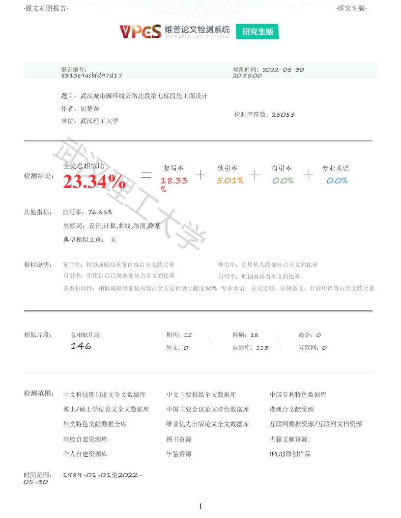 原文对照报告·研究生版·VPCS维普论文检测系统研究生版报告编号:检测时间:2022-05-30题目:武汉城市圈环线公路北段第七标段施工图设计作者:屈楚秦检测字符数:25053单位:武汉理工大学全文总相似比复写率他引率自引率专业术语检测结论:23.34%18.335.01%0.0%0.0%其他指标:自写率:76.66%高频词:设计,计算,曲线,路面,路基典型相似文章:无指标说明:复写率:相似或疑似重复内容占全文的比重他引率:引用他人的部分占全文的比重自引率:引用自己已发表部分占全文的比重自写率:原创内容占全文的比重典型相似性:相似或疑似重复内容占全文总相似比超过30%专业术语:公式定理、法律条文、行业用语等占全文的比重相似片段:总相似片段期刊:15博硕:18146自建库:113检测范围:中文科技期刊论文全文数据库中文主要报纸全文数据库中因专利特色数据库博士/硕士学位论文全文数据库中因主要会议论文特色数据库港澳台文献资源外文特色文献数据全库维普优先出版论文全文数据库互联网数据资源/互联网文档资源高校自建资源库图书资源古籍文献资源个人自建资源库年鉴资源IPUB原创作品时间范围:1989-01-01至2022-1原文对照报告·研究生版原文对照颜色标注说明:■自写片段■复写片段(相似或疑似重复)■引用片段(引用)■专业术语(公式定理、法律条文、行业用语等)武汉理工大学毕业设计武汉城市圈环线公路北段第七标段施工图设计学院(系):交通学院专业班级:道桥18O3班学生姓名:屈楚秦指导教师:欧湘萍学位论文原创性声明。。本人郑重声明:所呈交的论文是本人在导师的指导下独立进行研究所取得的研究成果。除了文中特别加以标注引用的内容外,本论文不包括任何其他个人或集体己经发表或撰写的成果作品。本人完全意识到本声明的法律后果由本人承担。作者签名:年月日学位论文版权使用授权书。。本学位论文作者完全了解学校有关保障、使用学位论文的规定,同意学校保留并向有关学位论文管理部门或机构送交论文的复印件和电子版,允许论文被查阅和借阅。本人授权省级优秀学士论文评选机构将本学位论文的全部或部分内容编入有关数据进行检索,可以采用影印、缩印或扫描等复制手段保存和汇编本学位论文。本学位论文属于1、保密口,在年解密后适用本授权书2、不保密口。(请在以上相应方框内打“√)作者签名:年月日导师签名:年月日摘要。·本次武汉城市圈环线公路北段第七标段施工图的设计旨在让学生理论联合实际,将大学本科所学道路勘测设计和道路工程材料的知识应用于实际工程当中,进行一项较为完整的公路路线设计。。。本设计基本内容包括路线设计,路基,路面与排水,路基支挡构造物,桥涵等。依据设计资料给出的远景交通量和其他有关参数,本设计道路采用6车道高速公路设计,设计时速1OOkM。参考地形图并按照选线原则的要求进行设计本次武汉城市圈环线公路北段第七标施工图的设计全长5672.539m,共设置7个交点(包含起、终点)。本标全程地形平坦、无较大起伏,竖曲线共设计三个变坡点,平纵组合合理。路基宽度为33.5…,在高填方路段采用俯斜式重力式挡土墙作为支挡构造物,路堤最高处墙高8米。路面采用沥青路面,排水设施采用边沟和排水沟,均为梯形截面形式。路线全程设有1座预应力混凝土T型梁桥梁,1座钢筋混凝土盖板涵。关键词:高速公路:路线设计:路基设计:挡土墙设计:路面设计Abstract2原文对照报告·研究生版The design of the construction drawing of the seventh bid section of the north section of thering road in Wuhan city circle aims to enable students to combine theory with practice,apply theknowledge of road survey and design and road engineering materials learned by undergraduatestsubgrade retaining structures,bridges and culverts,etc.According to the prospective trafficvolume and other relevant parameters given in the design data,the design road is designed as a 6-lane Expressway with a design speed of 100km /h.With reference to the topographic map and inaccordance with the requirements of the route selection principle,the design total length of theconstruction drawing of Lot 7 of the north section of Wuhan urban circle ring road is 5672.539m,anda total of 7 intersections (including the start and end points)are set.The whole terrain of thissection is flat without large fluctuation.Three slope change points are designed for the verticalcurve,and the horizontal and vertical combination is reasonable.The subgrade is 33.5m wide.Theinclined gravity retaining wall is used as the retaining structure in the high fill section,and theheight of the wall at the highest part of the embankment is 8m.Asphalt pavement is adopted forpavement,and side ditch and drainage ditch are adopted for drainage facilities,both of which arein trapezoidal section form.The whole route is provided with 1 prestressed concrete T-beam bridgedesign1.1设计目的与意义12设计的基本内容·········第2章道路等级论证及技术指标确定····21路线经过地区的自然条件····22道路等级及技术指标确定··2.3.1道路等级论证·······2.3,2技术指标确定·····第3章路线设计········3.1路线线形设计步骤···31路线选线原则·····32路线方案比选······第4章路线平面设计····4.1平面设计一般规定···42平曲线要素计算·····43主点里程桩号计算····944逐桩坐标计算···