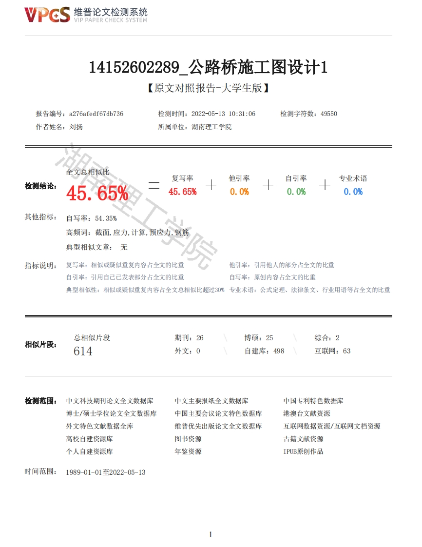 维普论文检测系统VIP PAPER CHECK SYSTEM14152602289公路桥施工图设计1【原文对照报告-大学生版】报告编号:a276 afedf67db736检测时间:202205-1310:31:06检测字符数:49550作者姓名:刘扬所属单位:湖南理工学院全文总相似比复写率他引率自引率专业术语检测结论:45.65%45.65%0.0%0.0%0.0%其他指标:自写率:54.35%高频词:截面,应力,计算,预应力,钢筋典型相似文章:无指标说明:复写率:相似或疑似重复内容占全文的比重他引率:引用他人的部分占全文的比重自引率:引用自己已发表部分占全文的比重自写率:原创内容占全文的比重典型相似性:相似或疑似重复内容占全文总相似比超过30%专业术语:公式定理、法律条文、行业用语等占全文的比重总相似片段期刊:26博硕:25综合:2相似片段:614外文:0自建库:498互联网:63检测范围:中文科技期刊论文全文数据库中文主要报纸全文数据库中国专利特色数据库博士/硕士学位论文全文数据库中国主要会议论文特色数据库港澳台文献资源外文特色文献数据全库维普优先出版论文全文数据库互联网数据资源/互联网文档资源高校自建资源库图书资源古籍文献资源个人自建资源库年鉴资源IPUB原创作品时间范围:1989-01-01至2022-05-13维普论文检测系统VIP PAPER CHECK SYSTEM原文对照颜色标注说明:■自写片段■复写片段(相似或疑似重复)引用片段(引用)■专业术语(公式定理、法律条文、行业用语等)湖荷理二与院毕业综合训练南理题目:南山大桥施工图设作者一刘扬届别2°18届学院一土木建筑工程学院专业土木工程指导教师一罗淮安职称完成时间摘要T型截面的预应力混凝土简支梁桥具有成本较低,施工简便,可预制,施工较快,结构体系简单可靠等诸多优点,是中小跨径桥梁中应用最广泛的桥梁。T梁桥主要特点是挖走受拉区的混凝土,减少主梁自重,增加跨越能力。T型截面适用于预制安装,主梁质量容易控制,施工速度比较快,桥梁部分构件损坏易于修复和更换。本项目为南山大桥施工图设计,拟定在桥址设计一座设计荷载为公路-II级,双向横坡为2%,标准跨径为30m的桥梁。综合考虑桥位的地质、地形条件。提出了三种方案的比选,通过综合考虑和反复比较选定桥型的最优方案:拟定截面类型与详细的截面尺寸:根据材料性质和优缺点,完成了桥梁的荷载内力计算:使用承载能力设计值对构件进行配筋:使用正常使用设计值进行校核:分别进行桥梁钢筋面积的估算及钢束的布置、桥梁预应力损失的计算及主梁应力、抗裂性、挠度、锚固区局部承压等的验算。最后,通过计算分析表明该设计验算通过,该桥梁受力合理,符合设计规范要求。关键词:T型截面预应力混凝土简支梁桥:荷载横向分布系数:效应组合:预应力损失:应力验算:挠度变形AbstractPrestressed concrete simply supported beam bridge with T-section has many advantages,such aslow cost,simple construction,prefabrication,fast construction,simple and reliable structuralsystem and so on.It is the most widely used bridge in medium and small span bridges.The mainfeature of T-beam bridge is that the concrete in the tensile area is excavated,the dead weight ofthe main beam is reduced and the crossing capacity is increased.The T-section is suitable forprefabrication and installation.The quality of the main beam is easy to control,the constructionspeed is relatively fast,and some components of the bridge are damaged and easy to repair andreplace.This project is the construction drawing design of Nanshan bridge.It is proposed to design a bridgewith design load of highway class II,two-way cross slope of 2%and standard span of 30m at thebridge site.2维普论文检测系统VIP PAPER CHECK SYSTEMComprehensively consider the geological and topographic conditions of the bridge site.Thecomparison and selection of three schemes are put forward,and the optimal scheme of bridge type isselected through comprehensive consideration and repeated comparison;Proposed section type anddetailed section size;According to the material properties,advantages and disadvantages,the loadinternal force of the bridge is calculated;Use the design value of bearing capacity to reinforcethe members;Check with the normal design value;The area of bridge reinforcement and thearrangement of steel tendons,the calculation of bridge prestress loss and the checking calculationof main beam stress,crack resistance,deflection and local pressure in anchorage zone are carriedout respectively.Finally,the calculation and analysis show that the design check calculation ispassed,the stress of the bridge is reasonable and meets the requirements of the design code.Key words:T-section prestressed concrete simply supported beam bridge;Transverse distribution coefficient of load;Effect combination;Prestress loss;Stress checking calculation;Deflection deformation第一章:设计资料及构造布置11.1设计资料11.1.1桥梁跨径及桥宽11.1.2基本材料拟定和计算数据11.1.3基本计算数据11.2方案比选21.2.1方案比选原则21.2.2方案编制21.2.3方案比较3学院1.2.4确定方案41.3主梁跨中截面尺寸拟定41.3.1主梁间距与主梁片数41.3.2主梁截面尺寸拟定4第二章:主梁作用效应计算82.1永久作用效应计算82.1.1永久作用集度82.1.2永久作用效应计算102.2可变作用效应计算112.2.1主梁荷载横向分布系数计算112.2.2冲击系数162.2.3车道荷载取值162.2.4计算可变作用效应172.3主梁作用效应计算28第三章:钢筋面积的估算及钢束布置323.1跨中截面钢束的估算和确定323.2预应力钢束的布置333.2.1跨中截面及端锚固截面预应力钢筋的布置333.2.2锚固区钢束群重心验算333.2.3其他截面钢束位置及倾角