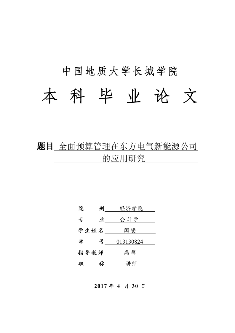 中国地质大学长城学院本科毕业论文题目全面预算管理在东方电气新能源公司的应用研究院别经济学院专业会计学学生姓名闫燮学号013130824指导教师高祥职称讲师2017年4月30日本科毕业生毕业论文(设计)诚信承诺书毕业论文全面预算管理在东方电气新能源公司(设计)题目的应用研究学生姓名闫燮专业会计学学号013130824指导老师高祥职称讲师所在院别经济学院诚信承诺本人慎重承诺和声明:我承诺在毕业论文(设计)活动中遵守学校有关规定,恪守学术规范,在本人的毕业论文中不剽窃、抄袭他人的学术观点、思想和成果,不篡改研究数据,如有违规行为发生,我愿承担一切责任,接受学校的处理。学生(签名):年月日中国地质大学长城学院毕业论文任务书学生姓名学013130824专业班级会计学八班指导教师高祥职称讲师单位中国地质大学长城学院毕业论文题目全面预算管理在东方电气新能源公司的应用研究毕业论文主要内容和要求:主要内容:在现代化企业管理中,全面预算管理已成为不可或缺的管理模式,本文主要从构建预算组织,制定预算目标,强制预算执行、强化预算监督、预算的编制、执行、调整、分析、考评、预算的保障因素来研究东方电气新能源公司预算管理中的主要缺陷,包括预算编制不科学、预算管理与公司战略脱节、预算考评缺失等问题。同时避免预算过繁过细、如预算目标取代企业目标、等错误倾向。从而使企业在规范业务流程、便于管理层在流程中控制和监督业务执行情况,及时发现执行中存在的偏差并确定偏差的大小,为绩效管理提供依据、合理配置资源提供等方面得到改善。要求:论文撰写要求思路清晰、内容充实、论点明确,论据充分,论证严密,语言通顺。撰写论文前应首先阅读相关的研究资料,掌握学术前沿动态,对相关理论著作要很好的把握,提高理论水平及思想深度。根据开题报告和老师提出的意见对论文提纲进行修改,确定大纲后认真撰写毕业论文。撰写论文结束后要根据老师的修改意见,认真反复的修改论文,并按照要求参加毕业论文的答辩,严格按照论文进度安排进行论文的写作。论文的格式、字数等撰写方面的要求参照《中国地质大学长城学院毕业论文(设计)撰写规范》。毕业论文主要参考资料:[1]李腾.陈亚中.第三届中国西部信用风险分析与管理论坛(SCRAM2015)[g.中国会议,2015.[2]郭佳.决策论坛一管理决策模式应用与分析学术研讨会[C].中国会议,2016[3)]王锐企业预算管理执行和调整相关问题探讨).财经界(学术版),2013,(2010-15.[4黄锦亮.企业预算管理的困境与对策研究D].财政部财政科学研究,2014:2348.[⑤)胡俊南.徐晓阳.国内外企业全面预算管理实施中存在的难点).财会月刊,2013,(05):4145.[6欧阳晓清.我国现代企业集团全面预算控制体系的探讨D)江西财经大学,2013:31-36.[7)江红基于经济增加值的企业全面预算管理研究).技术经济与管理研究,2014,(1012-23.[8]赵仲杰着力强化“十二五”期间企业全面预算管理N.中国改革报,2013.[9]王竹泉如何构筑有效的预算控制与风险预警体系).财会学习,2015,(07)54-60[10]王晓燕.任兰柱.论全面预算管理在我国企业中的运用[).中国集体经济,2016,(33):36-63.[11]李荣.张崇德.中国宏观经济展望.西南财经大学学报,2015,(13)26-27.[12】龚巧莉.全面预算管理一案例与实务指引M.北京机械工业出版社,2013:457-458.[13]Travis Bradderry.The cost of seagful management.Industrial and Commercial Training [J].2014.