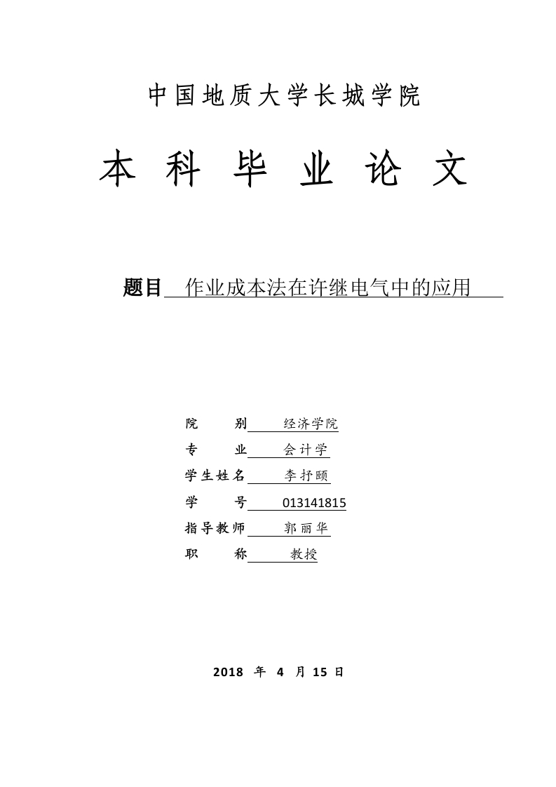中国地质大学长城学院本科毕业论文题目作业成本法在许继电气中的应用院别经济学院专业会计学学生姓名李抒颐学号013141815指导教师郭丽华职称教授2018年4月15日本科毕业生毕业论文(设计)诚信承诺书毕业论文作业成本系统在许继电气中的应用(设计)题目学生姓名李抒颐专业会计学学号013141815指导老师郭丽华职称教授所在系别经济学院诚信承诺本人慎重承诺和声明:我承诺在毕业论文(设计)活动中遵守学校有关规定,恪守学术规范,在本人的毕业论文中不剽窃、抄袭他人的学术观点、思想和成果,不篡改研究数据,如有违规行为发生,我愿承担一切责任,接受学校的处理。学生(签名):年月日中国地质大学长城学院毕业论文任务书学生姓名李抒颐学号013141815专业班级会计学十八班指导教师郭丽华职称教授单位河北农业大学毕业论文作业成本法在许继电气中的应用毕业论文主要内容和要求:主要内容:本文运用管理会计学、财务管理、成本会计学等会计理论,采用理论与案例相结合的方法,通过对作业成本法在许继电气的运用情况进行分析,来说明作业成本系统在电气行业中的应用,作业成本管理的核心是作业成本分析,通过进行作业分析,消除或减少非增值作业,优化作业链、价值链,从而最终减少成本和增加企业价值。要求:论文撰写要求思路清晰、内容充实、论点明确,论据充分,论证严密,语言通顺。撰写论文前应首先阅读相关的研究资料,掌握学术前沿动态,对相关理论著作要很好的把握,提高理论水平及思想深度。根据开题报告和老师提出的意见对论文提纲进行修改,确定大纲后认真撰写毕业论文。撰写论文结束后要根据老师的修改意见,认真反复的修改论文,并按照要求参加毕业论文的答辩,严格按照论文进度安排进行论文的写作。论文的格式、字数等撰写方面的要求参照《中国地质大学长城学院毕业论文(设计)撰写规范》。毕业论文主要参考资料:[1]杨洛新.成本会计[M.北京大学出版社,2016.[2]陈文.作业成本法在企业应用中存在的问题及对策).金融经济,2014(10小:241-242.[3】牛淑华,鞠媛.论企业采用作业成本法的必要性.财会学习,2015,No.126(18):156.[4李林娜.作业成本法的发展与应用问题研究才智,2017(02小:10.[5]潘飞,童卫华,马保州.许继电气ABC系统的初步尝试[G.管理会计国际研讨会2013.[6)武建红.作业成本法在企业的应用[D.山西财经大学,2014[7)刘熠峰.作业成本法的运用研究D.安微财经大学,2014.[8]王洪蕊基于作业成本系统的油气勘探管理绩效评价体系研究D].中国石油大学,2015.[9]裴仁海.作业成本法在铝合金铸造企业的应用研究D.山东大学,2012.刘雅荣.作业成本法在我国企业应用的探讨[D].山西财经大学,2016.[11韩迎超.浅议作业成本法在A上市企业中的应用研究.企业导报,2014:93-114.[12]陈晓峰.税务筹划法律风险管理策略[].法律出版社,2011.200-210.[13]Activity-Based Costing (ABC)-An Effective Tool for Better Management,Ishter Mahal,Md.Akram Hossain,[J].Research Journal of Finance and Accounting,2015