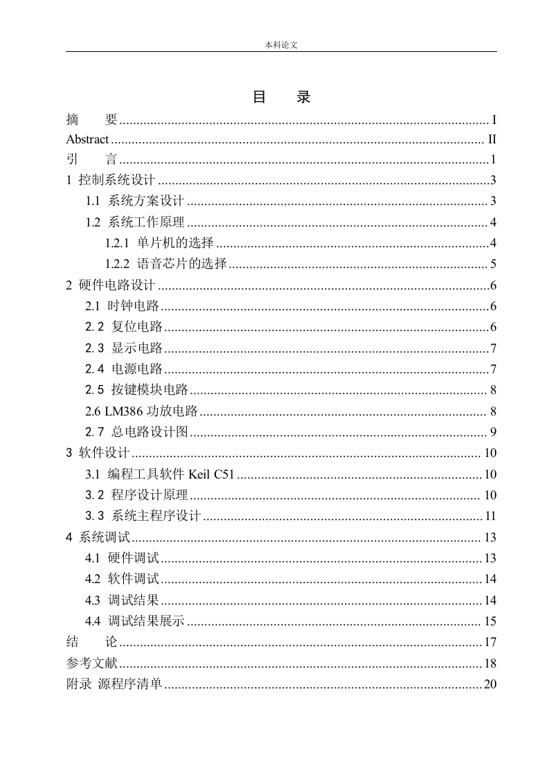 本科论文目录摘Abstract.…引言1控制系统设计31.1系统方案设计31.2系统工作原理1.2.1单片机的选择1.2.2语音芯片的选择2硬件电路设计.…62.1时钟电路62.2复位电路.2.3显示电路2.4电源电路2.5按键模块电路.82.6LM386功放电路.…82.7总电路设计图3软件设计…103.1编程工具软件Keil C51103.2程序设计原理103.3系统主程序设计4系统调试.…134.1硬件调试134.2软件调试….144.3调试结果4.4调试结果展示15结17参考文献…18附录源程序清单本科论文致谢33本科论文摘要在人类的历史长河中,语言的作用尤为重要,人们一直在思考一个问题,那就是如何把语言完全不差的记录下来。当今智能化的仪表仪器的自动控制装置中,如果能够添加语言功能,就可以非常好的提升操作便捷度,在日常生活中,人们在很多场合都需要语言的存储与回放技术,所以将这种技术与生活更好的结合在一起,是现在需要解决的一大难题。传统的语言记录装置体积庞大,使用不方便,在信息处理的过程中受到许多限制,为了解决这些问题,本项目将使用AT89C51单片机和ISD4004语音芯片来设计一款语音的录放系统。ISD4004语音芯片不需要数模转换和压缩就能够直接进行存储,不仅存储时间长,而且没有转换误差,还可以用于多次重复录放。外围核心电路也相对来说十分简单。使用ISD4004语音芯片与单片机相结合,通过软件与硬件的控制,完全可以实现数字化语言的存储和回放。关键词:AT89C51单片机:语音存储:语音回放;ISD4004语音芯片
