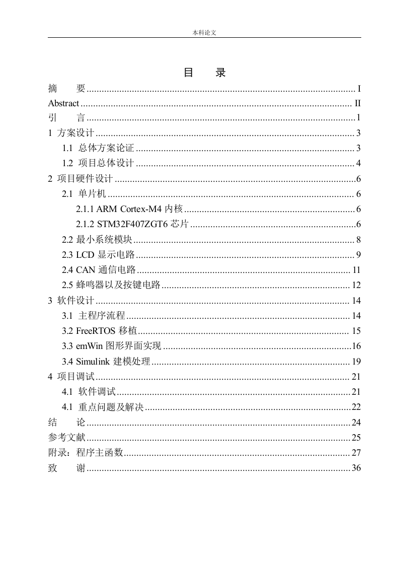 本科论文目录摘要…Abstract.…引言1方案设计1.1总体方案论证342项目硬件设计2.1单片机2.1.1 ARM Cortex-M4内核2.1.2STM32F407ZGT6芯片2.2最小系统模块2.3LCD显示电路92.4CAN通信电路112.5蜂鸣器以及按键电路12143.1主程序流程3.2 FreeRTOS移植.153.3 emWin图形界面实现3.4 Simulink建模处理194项目调试…214.1软件调试214.1重点问题及解决2225附录:程序主函数27致谢36本科论文摘要当前,随着科技的发展,汽车功能的日益增多,汽车仪表系统也变得愈发多元化。传统的机械式指针仪表因为其繁琐的布线方式和点对点的通信方式,已不能满足当前行业的需求。因此,研究一款功能多样,结构简单,安全可靠的仪表系统成为汽车产业技术开发和研究的热点之一山。本次课题基于STM32F407微型控制器以及CAN总线通信技术,设计一款新型全液晶汽车仪表。相比于传统的机械式指针仪表,本设计的汽车仪表具有简单的接线方式,快速的模块之间通讯以及全液晶显示等特点。同时,该课题中采用emWin技术进行LCD液晶显示屏的设计,具有更直观美化的人机交互界面,而且由于采用了CAN总线通信方式,元器件与控制元件(ECU)之间信息传递性将会更好。本次课题,采用CAN分析仪开发测试工具,通过定义好相关模拟变量,模拟实际汽车中的情况输入CAN信号报文并利用Simulink建模进行汽车仪表灯的逻辑处理。同时将FreeRTOS实时操作系统移植到STM32F407上,利用STM32芯片输入输出信号,进而达到点亮汽车仪表的目的。通过软件与硬件方面的调试,该课题达到了预期研究要求,证明了课题技术上的可行性以及延展性。关键词:汽车仪表;CAN总线:STM32F407;Simulink建模;FreeRTOS本科论文AbstractWith the development of science and technology,the function ofautomobile is increasing rapidly.The traditional mechanical pointer instrumentcan not meet the needs of current industry because of its cumbersome wiringmode and point-to-point communication.Therefore,the research of a newinstrument system with characters like function diversification,simple structure,safe and reliable has become one of the important issues in the development andresearch of automobile industry technology.Based on stm32f407 micro controller and CAN BUS communicationtechnology,this project designs a new type of full LCD automobile instrument.Compared with the traditional mechanical pointer instrument,the newinstrument has the characteristics of simple wiring,fast communication betweenmodules and full LCD display.In addition,the design of LCD with emWintechnology in this project provides a more visibly human-computer interface.Byusing CAN bus communication,the information transmission betweencomponents and control elements (ECU)is better.In this project,CAN analysistool is used to simulate actual situation by giving relevant simulation variables,inputting CAN signal message and carrying out the logic processing of vehicleinstrument lamp with Simulink modeling.Moreover,the FreeRTOS real-timeoperating system is also transplanted to stm32f407,the input and output signalsof STM32 chip are used to lighten the automobile instrument.Through the debugging of software and hardware,the project has achievedthe expected research requirements,and has proved the technical feasibility andscalability of this project.Keywords:Automobile instruments;CAN bus;STM32F407;Simulinkmodeling;FreeRTOS