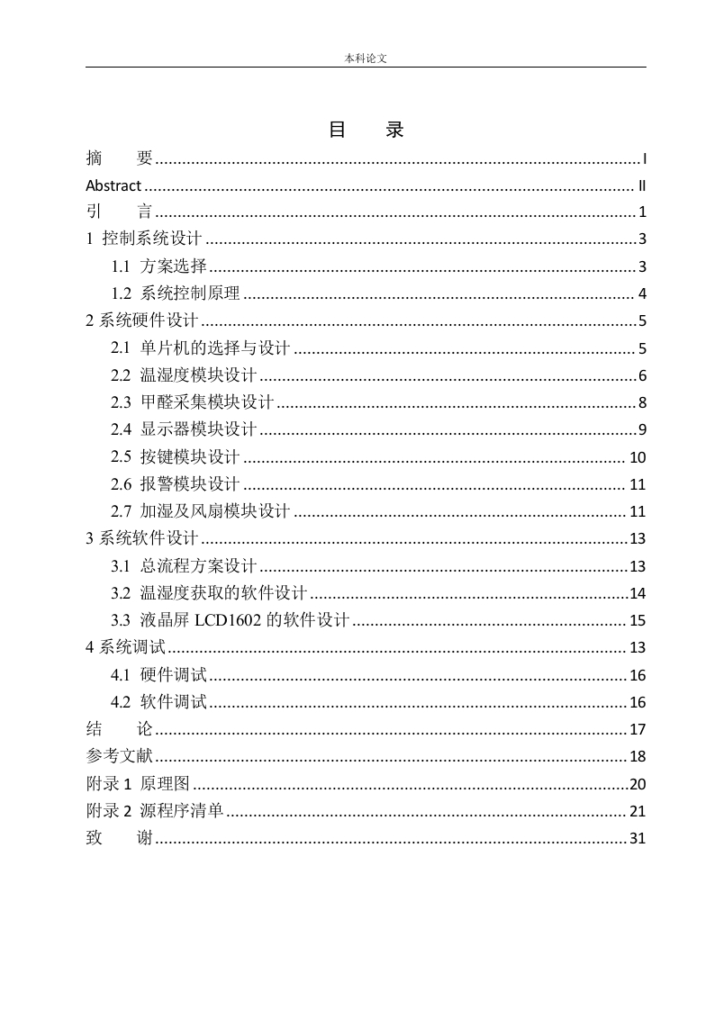 本科论文目录摘要Abstract.引言1控制系统设计31.1方案选择1.2系统控制原理2系统硬件设计…52.1单片机的选择与设计.52.2温湿度模块设计2.3甲醛采集模块设计2.4显示器模块设计…92.5按键模块设计102.6报警模块设计.…112.7加湿及风扇模块设计113系统软件设计…133.1总流程方案设计.133.2温湿度获取的软件设计3.3液晶屏LCD1602的软件设计4系统调试,134.1硬件调试164.2软件调试16结.17参考文献18附录1原理图附录2源程序清单21致谢…31本科论文摘要室内的温度和湿度是两种最基本的环境参数,与人们的生活环境息息相关,监控温湿度可以更好地控制我们的生活环境山。而甲醛是一种原生质毒物,对人体健康的危害具有长期性、潜伏性、隐蔽性等特点,它无处不在,不仅在新装修的家里也在各种的生产车间,因此为了人们的身体健康设计了一款基于单片机的温湿度及甲醛浓度监控系统2]。本设计利用单片机控制功能结合传感器检测功能,提出一种以单片机为主控单元的空气质量监控系统。它的主要功能实现是通过温湿度传感器进行检测,并使数据显示在LCD屏上)。此设计通过按键设置温湿度和甲醛浓度的限值。低于湿度设定值时启动雾化片实现加湿功能,高于温度设定值蜂鸣器报警。当甲醛浓度超出标准值时控制风扇转动保持车间内空气流通,减少甲醛浓度。最后结合软件模块设计,利用代码对硬件进行驱动,经软硬件实物调试后,从而实现本设计功能的执行和控制。本设计不仅能够监控车间温湿度的情况,还可以改善人们在车间长期工作导致的健康问题。本系统设计遵守体积小,质量轻,性价比高的原则,大大提高了轮胎的生产质量和工人的生活质量,这对于生产车间空气质量的研究有着很大的意义将进一步推动目前轮胎工业的进步和发展。关键词:温湿度传感器:单片机:甲醛浓度本科论文AbstractIndoor temperature and humidity are two basic environmental parameters,temperature and humidity can better control our living environment.Andformaldehyde is a kind of protoplasm poison,which has the characteristics oflong-term,latent and concealed.It is everywhere,not only in the newlydecorated home but also in a variety of production workshops.So design atemperature and humidity based on the MCU and formaldehyde concentrationmonitoring system for peoples'health21.This design uses a single-chip microcomputer control function combinedwith the sensor detection function to propose an air quality monitoring systemwith a single-chip microcomputer as the main control unit.The functionrealization is to detect through the temperature and humidity sensor,and makethe data displayed on the LCD screent31.This design sets the limits oftemperature,humidity and formaldehyde concentration through the buttons.When the humidity is lower than the set value,the atomizer is activated torealize the humidification function and the buzzer alarms above the temperature.The fan will rotate automatically to keep the air circulating in the workshop andreduce the formaldehyde concentration when the formaldehyde exceeds thestandard value.Finally,combined with the software module design and usedcode to drive the hardware,after the hardware and software debugging,so as toachieve the implementation and control of functions.This design can not only monitor the temperature and humidity of theworkshop,but also improve the health problems caused by people working inthe workshop for a long time.The design greatly improve the quality of tireproduction and the quality of life of workers by following the principle of smallvolume,light weight and high cost performance,which is of great significanceto the research on the air quality of production workshops and will furtherpromote the progress and development of the current tire industry.Keywords:temperature and humidity sensor;singlechip microcomputer;formaldehyde concentration