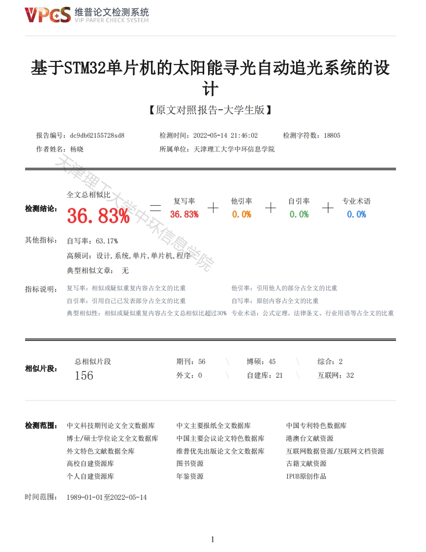 维普论文检测系统/IP PAPER CHECK SYSTEM基于STM32单片机的太阳能寻光自动追光系统的设计【原文对照报告-大学生版】报告编号:dc9db62155728sd8检测时间:2022-05-1421:46:02检测字符数:18805作者姓名:杨晓所属单位:天津理工大学中环信息学院全文总相似比复写率他引率自引率专业术语检测结论:36.83%36.83%0.0%0.0%0.0%其他指标:自写率:63.17%高频词:设计,系统,单片,单片机,程序典型相似文章:无院指标说明:复写率:相似或疑似重复内容占全文的比重他引率:引用他人的部分占全文的比重自引率:引用自己已发表部分占全文的比重自写率:原创内容占全文的比重典型相似性:相似或疑似重复内容占全文总相似比超过0%专业术语:公式定理、法律条文、行业用语等占全文的比重总相似片段期刊:56博硕:45综合:2相似片段:156外文:0自建库:21互联网:32检测范围:中文科技期刊论文全文数据库中文主要报纸全文数据库中国专利特色数据库博士/硕士学位论文全文数据库中国主要会议论文特色数据库港澳台文献资源外文特色文献数据全库维普优先出版论文全文数据库互联网数据资源/互联网文档资源高校自建资源库图书资源古籍文献资源个人自建资源库年鉴资源IPUB原创作品时间范围:1989-01-01至2022-05-14维普论文检测系统VIP PAPER CHECK SYSTEM原文对照颜色标注说明:■自写片段■复写片段(相似或疑似重复)口引用片段(引用)■专业术语(公式定理、法律条文、行业用语等)天津理工大学中环信息学院本科毕业设计题目:基于STM32单片机的太阳能寻光自动追光系统的设计院系:自动化工程系专业:电气工程及其自动化学号:18020075信息学院年级:2018级学生姓名:杨晓指导老师:邵磊基于STM32单片机的太阳能寻光自动追光系统的设计摘要自从世界进入工业革命时期以来,伴随着瓦特改良的蒸汽机被大规模的使用,人类对自然利用和改造的能力得到了大幅度的提高。机器的大规模生产与运用让人类对资源的需求急剧增加。在第二次工业革命后,电力作为一种新兴能源开始进入到人们的生活和生产之中。而进入到生产力快速发展的今天,随着经济发展的全面提速,全世界各个国家对能源的需求与日俱增,虽然当今世界能源的消耗量依然在成倍的增加,但是自然资源的不变性导致了大部分能源的不可再生性。石油能源储量有限,终有一天就会全部消耗殆尽。届时人类将陷入巨大的生存危机之中。并且石油能源分布极度不均,我国的石油能源大多分布于中西部经济相对落后地区,东部经济发达地区资源较少,这样的现状就为我国的能源调配造成了极大的困难。故在环境日趋恶化,能源日趋紧缺的今天,对可再生的新型能源成为了科研人员的研究方向。而太阳能作为一种随处可获得的可再生新型能源,不仅来源广泛,且不会产生任何污染。本文基于太阳能这一新兴产业与技术,研究内容主要如下:(1)软件和硬件的设计。系统的硬件设计分为三个方面:光敏电阻、步进电机及电源的设计。我对此单片机设计的最小系统进行了全方位的设计,并在Altium Designer绘制原理图,并对PCB进行了绘图和焊接。接着,对STM32单片机应用在实物功能上的程序用Kei15进行设计和编辑。(2)系统测试与分析。经过测试,光照强弱,光敏电阻灵敏性,步进电机性能均能通过此次设计反映出来。关键词:STM32单片机:太阳能:跟踪:光敏电阻:步进电机Design of greenhouse temperature and humidity intelligent regulation system based on STM32 MCUABSTRACTSince the world entered the period of industrial Revolution,with the large-scale use of watt'simproved steam engine,human's ability to utilize and transform nature has been greatly improved.The mass production and application of machines increase the demand for human resourcesdramatically.After the second industrial Revolution,electricity as a new energy began to enter2维普论文检测系统VIP PAPER CHECK SYSTEMpeople's life and production.Today,with the rapid development of productivity and the overallacceleration of economic development,the demand for energy in all countries around the world isincreasing day by day.Although the consumption of energy in the world is still increasingexponentially,the invariability of natural resources leads to the non-renewability of most of theenergy.Oil reserves are limited and will be used up one day.Humanity will then be in a greatexistential crisis.Moreover,the distribution of petroleum energy is extremely uneven.Most of thepetroleum energy in China is distributed in the economically backward areas in the central andwestern regions,while the resources in the economically developed areas in the eastern regions areless.This situation causes great difficulties for China's energy allocation.Therefore,in today'sincreasingly deteriorating environment and energy shortage,renewable new energy has become theresearch direction of researchers.Solar energy,as a kind of renewable energy available everywhere,not only comes from a wide range of sources,but also does not produce any pollution.Based on theemerging industry and technology of solar energy,the research contents are as follows:(1)Software and hardware design.The hardware design of the system is divided into threeaspects:the design of photosensitive resistance,stepping motor and power supply.I made acomprehensive design of the minimum system designed by this single chip microcomputer,and drew theschematic diagram in Altium Designer,and did the drawing and welding of PCB.Then,the STM32 MCUapplication in the physical function of the program with Keil 5 design and edit.(2)System test and analysis.After testing,light intensity,photose