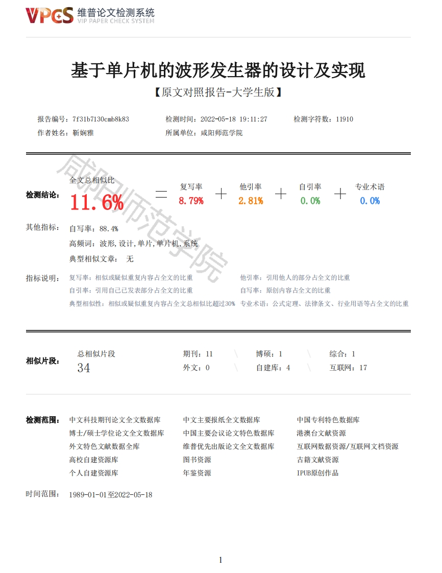 维普论文检测系统VIP PAPER CHECK SYSTEM基于单片机的波形发生器的设计及实现【原文对照报告-大学生版】报告编号:7f31b7130cmb8k83检测时间:2022-05-1819:11:27检测字符数:11910所属单位:咸阳师范学院全文总相似比复写率他引率自引率专业术语检测结论:11.6%8.79%2.81%0.0%0.0%其他指标:自写率:88.4%高频词:波形,设计,单片,单片机,系统典型相似文章:无指标说明:复写率:相似或疑似重复内容占全文的比重他引率:引用他人的部分占全文的比重自引率:引用自己已发表部分占全文的比重自写率:原创内容占全文的比重典型相似性:相似或疑似重复内容占全文总相似比超过30%专业术语:公式定理、法律条文、行业用语等占全文的比重总相似片段期刊:11博硕:1综合:1相似片段:34外文:0自建库:4互联网:17检测范围:中文科技期刊论文全文数据库中文主要报纸全文数据库中国专利特色数据库博士/硕士学位论文全文数据库中国主要会议论文特色数据库港澳台文献资源外文特色文献数据全库维普优先出版论文全文数据库互联网数据资源/互联网文档资源高校自建资源库图书资源古籍文献资源个人自建资源库年鉴资源IPUB原创作品时间范围:1989-01-01至2022-05-18维普论文检测系统VIP PAPER CHECK SYSTEM原文对照颜色标注说明:■自写片段■复写片段(相似或疑似重复)口引用片段(引用)■专业术语(公式定理、法律条文、行业用语等)学校代码107221807054113学号分类号公开TP273密级本科毕业论文(设计)基于单片机的波形发生器的设计及实现Design and Realization of a WaveformGenerator based on SingleChip Microcomputer_Phtotelectric sensor and its application Phtotelectric sensor and its application Phtotelectric题目(中、英文)sensor and its application靳娴雅作者姓名电磁场与无线技术专业名称工学学科门类张玉叶成绩评定提交论文日期指导教师二O二二年五月摘要随着时间的推移,科学技术逐渐发展,人们对各种仪器、仪表的性能指标要求越来越高。波形发生器是科学实验、教学实践等场合经常使用的一款电子仪器,其波形种类、频率精度、频率稳定度、使用便捷性等都成为使用者的考量标准。本文通过对国内外有关波形发生器产生、校准等技术的研究,并结合实际的要求,采用AT89C51单片机作为主控模块,结合数模转换模块、按键模块、显示模块等构成的波形发生器系统。在按键模块的选择下,由单片机的控制电路和D/A数模转换电路输出波形,所产生的波形种类及数据信息可以通过LCD液晶显示出来。输出的波形类型包括正弦波、三角波、方波等,波形相关参数可以通过程序控制,按键调节波形的种类及波形的频率。通过硬件电路和软件编程的综合设计,系统实现了四种波形质量较高、操作方便、低成本的波形发生功能,经过测试,实验效果良好,具有一定的实际意义。关键词:单片机:波形发生器:数模转换器:LCDAbstract2维普论文检测系统VIP PAPER CHECK SYSTEMWith the passage of time and the gradual development of science and technology,people havehigher and higher requirements for the performance indicators of various instruments and meters.Thewaveform generator is an electronic instrument that is often used in scientific experiments,teaching practice and other occasions.Its waveform type,frequency accuracy,frequency stability,and ease of use have become the criteria for users to consider.In this paper,through the researchon the generation and calibration of the waveform generator at home and abroad,and combined withthe actual requirements,the AT89C51 single-chip microcomputer is used as the main control module,combined with the digital-to-analog conversion module,button module,display module and otherwaveform generator system.Under the selection of the button module,the control circuit of thesingle-chip microcomputer and the D/A digital-to-analog conversion circuit output the waveform,andthe generated waveform type and data information can be displayed by the LCD liquid crystal.Theoutput waveform types include sine wave,triangle wave,square wave,etc.The relevant parameters ofthe waveform can be controlled by the program,and the type of the waveform and the frequency of thewaveform can be adjusted by pressing the button.Through the comprehensive design of hardwarecircuit and software programming,the system realizes four kinds of waveform generation functionswith high waveform quality,convenient operation and low cost.After testing,the experimentalresults are good and have certain practical significance.Key words:Single chip microcomputer:Waveform generator:Digital to analog converter;LCD目录II1引言······11.1研究背景及意义・·1.2国内外研究现状····1.3本次设计任务······2系统总体设计和工作原理··2.1系统方案选择·······2.2系统总体设计·······2.3系统工作原理·······3系统硬件设计······3.1主控芯片模块·····3.1.1AT89C51引脚说明3.1.2时钟电路······3.1.3复位电路······3.2D/A转换模块······3