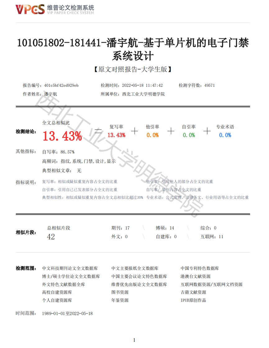 维普论文检测系统/IP PAPER CHECK SYSTEM101051802-181441-潘宇航-基于单片机的电子门禁系统设计【原文对照报告-大学生版】报告编号:401c5bf42ed929eb检测时间:2022-05-1811:47:42检测字符数:49571作者姓名:潘宇航所属单位:西北工业大学明德学院全文总相似比复写率他引率自引率专业术语检测结论:13.43%13.43%0.0%0.0%0.0%其他指标:自写率:86.57%高频词:指纹,系统,门禁,设计,显示典型相似文章:无学明指标说明:复写率:相似或疑似重复内容占全文的比重引率:引用他人的部分占全文的比重自引率:引用自己已发表部分占全文的比重自写率:原创内容占全文的比重典型相似性:相似或疑似重复内容占全文总相似比超过30%专业术语:公式定理、法律条文、行业用语等占全文的比重总相似片段期刊:17博硕:14综合:0相似片段:42外文:0自建库:0互联网:11检测范围:中文科技期刊论文全文数据库中文主要报纸全文数据库中国专利特色数据库博士/硕士学位论文全文数据库中国主要会议论文特色数据库港澳台文献资源外文特色文献数据全库维普优先出版论文全文数据库互联网数据资源/互联网文档资源高校自建资源库图书资源古籍文献资源个人自建资源库年鉴资源IPUB原创作品时间范围:1989-01-01至2022-05-18维普论文检测系统VIP PAPER CHECK SYSTEM原文对照颜色标注说明:■自写片段■复写片段(相似或疑似重复)口引用片段(引用)■专业术语(公式定理、法律条文、行业用语等)本科毕业设计(论文)题目基于单片机的电子门禁系统设计学院名称信息工程学院专业名称通信工程班级101051802姓名潘宇航学号181441学明德学院指导教师张秦菲毕业时间2022年7月5日设计论文毕业任务书一、题目基于单片机的电子门禁系统设计二、指导思想和目的要求指导思想:随着科技的不断发展,人们越来越重视对具有隐私、重要物质的场所的安全性,所以电子门禁在生活中用的越来越多,因此研究与设计单片机为主要控制的电子门禁具有很大的实用价值,并且电子锁具有安全性高、成本低、功耗低、易操作等优点。目的要求:本设计采用单片机作为核心控制单元,并辅以外围电路,设计电子门禁的控制电路。设计采用半导体指纹传感器采集指纹,当人们使用指纹时,程序会将识别的指纹信息传送到单片机内进行比较,确定该指纹是否拥有此权限、指纹是否匹配,从而实现该系统的功能。三、主要技术指标1、以单片机为电子门禁的核心控制:2、采用半导体指纹传感器采集指纹:3、用LED显示门禁系统的各种状态:4、基于单片机实现整个电路并焊接完成实物调试。四、进度和要求第1-2周:明确论文撰写要求以及相关事宜,查阅资料,对该题目有较深刻认识,初步确定设计方案,完成开题报2维普论文检测系统VIP PAPER CHECK SYSTEM第3-4周:继续查找资料,细化系统电路设计方案,并学习方案中所涉及的仿真软件:第5-6周:整理、补充资料,完成论文第一章绪论初稿,对相关指标参数完成计算:第7-9周:修改完善参数指标,完成电路仿真:第10-11周:修改完善电路,完成论文主体内容初稿:第12-13周:修改完善电路,对撰写论文终稿:第14周:论文定稿并进行查重:第15周:准备答辩。五、主要参考书及参考资料[1]潘学文.基于单片机的RFID门禁系统设计[J].现代工业经济和信息化,2021,11(07):77-79.[2]李沙沙,汪东霞,连俊豪.基于单片机的指纹门禁系统设计[J].现代信息科技,2021,5(11):82-85[3]冯美艳,殷鹏.基于单片机的IC卡门禁系统设计[J].科学技术创新,2021,(13):94-95.[4]徐明昊,宋广军.基于单片机的宿舍指纹门禁解锁系统设计[J].自动化与仪表,2020,35(04):94-97+108.[5]王亚星.基于STC89C52单片机的超声波门禁系统设计[J].花炮科技与市场,2019,(04):226[6]杜永峰.基于单片机的智能门禁系统设计[J刀.电子制作,2019,(21):77-79+43.[7]郑祥明,谢晓亮.基于单片机的指纹自动识别门禁系统设计[J].赤峰学院学报(自然科学版),2018,34(04):73-75.学生指导教师二级学院院长摘要生活节奏的加快,人员流动性加强,来往密切且频繁,传统的机械式钥匙为住户衍生了一系列不必要的麻烦,随着计算机技术的发展和在控制系统中的广泛应用,因此利用高科技手段,设计一种电子指纹门禁系统很有必要。门禁系统能够科学有效的规范特定区域的出入权限,辅助工作人员监控是否有异常情况发生,防止事故发生。在信息化社会的今天,逐渐形成了以网络集成的自动化信息管理系统。作为控制技术极强的单片机,以其体积小,低功耗,低电压,低成本,拥有很强的控制力等诸多优势,在国内外受到广泛应用。本设计通过分析门禁系统的发展和现状,采用STM32F103C8T6为主控芯片,0LED实时显示操作过程,AS608指纹模块通过指纹采集进行开锁的操作,同时该模块可进行指纹录入,指纹别除等功能。STM32F103C8T6初始化ESP8266WiFi模块,同时接受来自ESP8266的数据,手机通过WIFI连接到服务器,达到对门禁的控制。确保了门禁系统的有效性和可靠性,提高对出入的管理效率,不再过度损耗人力物力,符合社会发展的趋势,能大幅度满足人们生活、工作的需要。关键词:单片机,指纹识别,STM32F103C8T6,ESP8266,0LEDABSTRACTThe pace of life is accelerated,personnel mobility is strengthened,come and go closely andfrequently,the traditional mechanical key derived a series of unnecessary trouble for the resident,In the wake of the wide application in the control system,and computer technology developmenttherefore,it is necessary to use high-tech means to design a
