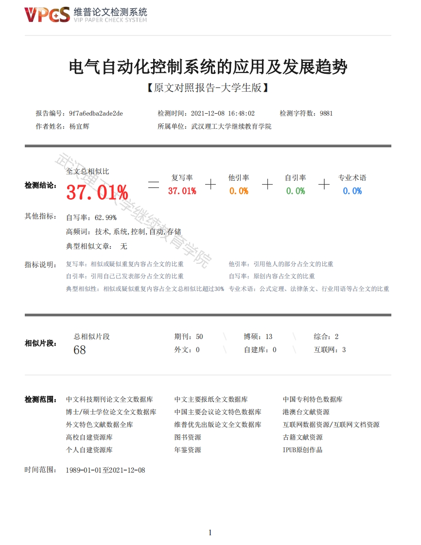 维普论文检测系统/IP PAPER CHECK SYSTEM电气自动化控制系统的应用及发展趋势【原文对照报告-大学生版】报告编号:9f7a6edba2ade2de检测时间:2021-12-0816:48:02检测字符数:9881作者姓名:杨宜辉所属单位:武汉理工大学继续教育学院全文总相似比复写率他引率自引率专业术语检测结论:37.01%37.01%0.0%0.0%0.0%其他指标:自写率:62.99%高频词:技术,系统,控制,自动,存储典型相似文章:无指标说明:复写率:相似或疑似重复内容占全文的比重院他引率:引用他人的部分占全文的比重自引率:引用自己已发表部分占全文的比重自写率:原创内容占全文的比重典型相似性:相似或疑似重复内容占全文总相似比超过30%专业术语:公式定理、法律条文、行业用语等占全文的比重总相似片段期刊:50博硕:13综合:2相似片段:68外文:0自建库:0互联网:3检测范围:中文科技期刊论文全文数据库中文主要报纸全文数据库中国专利特色数据库博士/硕士学位论文全文数据库中国主要会议论文特色数据库港澳台文献资源外文特色文献数据全库维普优先出版论文全文数据库互联网数据资源/互联网文档资源高校自建资源库图书资源古籍文献资源个人自建资源库年鉴资源IPUB原创作品时间范围:1989-01-01至2021-12-08维普论文检测系统VIP PAPER CHECK SYSTEM原文对照颜色标注说明:■自写片段■复写片段(相似或疑似重复)口引用片段(引用)■专业术语(公式定理、法律条文、行业用语等)理武汉理工大学毕业设计(论文)电气自动化控制系统的应用及发展趋势函授站(学习中心):网络教育学院(湖北现代)专业:电气工程及其自动化年级层次:2019年秋季学生姓名:杨宜辉指导教师:易耀武教育学院学位论文原创性声明本人郑重声明:所呈交的论文是本人在导师的指导下独立进行研究所取得的研究成果。除了文中特别加以标注引用的内容外,本论文不包括任何其他个人或集体已经发表或撰写的成果作品。本人完全意识到本声明的法律后果由本人承担。作者签名:杨宜辉2021年10月28日学位论文版权使用授权书本学位论文作者完全了解学校有关保障、使用学位论文的规定,同意学校保留并向有关学位论文管理部门或机构送交论文的复印件和电子版,允许论文被查阅和借阅。本人授权省级优秀学士论文评选机构将本学位论文的全部或部分内容编入有关数据进行检索,可以采用影印、缩印或扫描等复制手段保存和汇编本学位论文。本学位论文属于1、保密口,在年解密后适用本授权书2、不保密口。(请在以上相应方框内打“√”)作者签名:杨宜辉2021年10月28日导师签名:易耀武2021年10月28日摘要在当前社会的发展条件下,电子信息技术有着更大的发展潜力,当前的电源管理系统已经更加成熟,特别是在数字技术与智能技术融合之后,更加完善。由于电子自动化技术的灵活性和传统性,它被广泛应用于各个行业。目前正在研究和开发一种有效的自动化和控制系统,以有效确保使用武力的安全。本文从两个不同的应用和发展趋势分析了自动电源管理系统的应用。关键词:电气自动化:控制系统:发展趋势:应用目录第一章电气自动化控制系统概述11.1电气自动化控制系统概述1第二章应用情况分析152维普论文检测系统VIP PAPER CHECK SYSTEM2.1自动控制功能152.2火电站中运用电气自动化系统的情况172.3电气自动化控制系统的功能202.4人工智能技术在电气自动化控制中应用的优势222.5人工智能技术在电气自动化控制中应用的具体分析262.6云存储技术概述322.7云储存技术在电气自动化控制中的应用34第三章设计方式分析363.1远程监控363.2现场总线监控383.3集中监控403.4未来发展趋势分析42参考文献50致谢51第1章电气自动化控制系统概述根据机组的功能和电气控制特点,DC的控制应包括发电机变流器、发电厂和其他电气系统的控制。其基本功能是:e1220kv/500kV开关及开关、控制和操作。发电机变压器保护、高压变压器后备保护和加速器保护的验证:发电机加速系统:包括启动和启动阶段、控制模式耦合、加速和电压消除、PSS输入和输出(电力系统稳定器);22OkV/500kV齿轮箱中的自动和手动网络接口:6kV高压厂用电监测、运行、厂用高压切断模式监测、开关/断开、手动启动等。380低压备用自动开关监视、操作和控制:高压启动控制和运行/备用模式(两台机组之间);柴油发电机系统控制和运行以及安全输入;直流和低压监测,对于主要保护和自动装置,如发电机变流器保护,很难实现所有DCS功能,因为可以保留的设备已经成熟。这可能导致成本大幅增加,但必须与CS相关。管理层将引入固定布线。自动装置上的信息通过通信传输,DC可以恢复事故记忆。与热工设备相比,电子自动化控制系统具有信息采集项目少、体积小、指示低的特点,但必须快速准确。第2章应用情况分析2.1.1自动控制功能电子控制系统是一种先进的程序,包括通过可变电阻器对相应系统进行输出、保护和控制。在使用本管理计划后,为了节省人力,可以排除手动使用监测设备。一旦安装了加速系统,监控区域内的设备将自动打开并支持手动操作。该系统还可作为低压自动耦合的控制功能。应对直流电源系统进行监控,以确保设备得到有效保护。设备使用时,也可使用控制系统的自动控制功能。当控制距离内的装置不工作时,控制系统接收到故障信号并切断电路,以尽可能确保整个电路的安全。其控制行为可通过控制