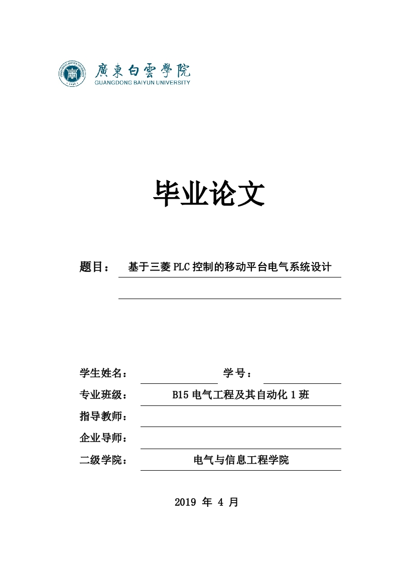 GUANGDONG BAIYUN UNIVERSITY毕业论文题目:基于三菱PLC控制的移动平台电气系统设计学生姓名:学号:专业班级:B15电气工程及其自动化1班指导教师:企业导师:二级学院:电气与信息工程学院2019年4月基于三菱PLC控制的移动平台电气系统设计基于三菱PLC控制的移动平台电气系统设计摘要本论文研究的是基于三菱PLC控制的移动平台电气系统,首先介绍移动平台的发展历程,然后根据其系统的结构和工作原理来分析其性能。针对移动平台的控制设计要求,本文通过各种控制方案对比,最终选择了PLC控制系统。对PLC控制系统进行器件选型,同时对系统的驱动信号、控制方式、通信及监控进行了较为全面的硬软件设计,并通过人机交互界面显示。最后从系统的调试与方案评估着手,结合具体情况全面分析系统在调试过程中可能会出现的问题,并提出具体的解决方案,从而提高移动平台的精度。关键词:移动平台:PLC:人机交互界面基于三菱PLC控制的移动平台电气系统设计DESIGN OF ELECTRIC SYSTEM FOR MOBILE PLATFORMBASED ON MITSUBISHI PLC CONTROLABSTRACTIn this paper,the electrical system of mobile platform based on Mitsubishi PLC controlis studied,first,The development of mobile platform is introduced,Then the performance isanalyzed according to the system structure and working principle.Control design requirementsfor mobile platform,This paper compares the various control schemes,finally,plc controlsystem was chosen.Device selection for plc control system,at the same time,the system'sdriving signal,control mode,communication and monitoring of the more comprehensivehardware and software design,and through the Human-Computer interface display.Finally,starting from the system debugging and scheme evaluation,the problems was analyzed thatmay arise during debugging according to the specific situation,and propose concrete solutions,To improve the accuracy of the mobile platform.Key words:Mobile platform;PLC;Human-computer interactive interface