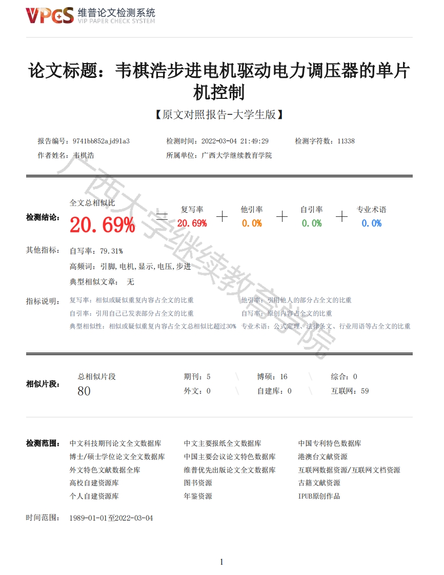 维普论文检测系统VIP PAPER CHECK SYSTEM论文标题:韦棋浩步进电机驱动电力调压器的单片机控制【原文对照报告-大学生版】报告编号:9741bb852ajd91a3检测时间:2022-03-0421:49:29检测字符数:11338作者姓名:韦棋浩所属单位:广西大学继续教育学院全文总相似比复写率他引率自引率专业术语检测结论:20.69%20.69%0.0%0.0%0.0%其他指标:自写率:79.31%高频词:引脚,电机,显示,电压,步进典型相似文章:无指标说明:复写率:相似或疑似重复内容占全文的比重他引率:引用他人的部分占全文的比重自引率:引用自己已发表部分占全文的比重自写率:原创内容占全文的比重典型相似性:相似或疑似重复内容占全文总相似比超过30%专业术语:公式定理、法律条文、行业用语等占全文的比重总相似片段期刊:5博硕:16综合:0相似片段:80外文:0自建库:0互联网:59检测范围:中文科技期刊论文全文数据库中文主要报纸全文数据库中国专利特色数据库博士/硕士学位论文全文数据库中国主要会议论文特色数据库港澳台文献资源外文特色文献数据全库维普优先出版论文全文数据库互联网数据资源/互联网文档资源高校自建资源库图书资源古籍文献资源个人自建资源库年鉴资源IPUB原创作品时间范围:1989-01-01至2022-03-04维普论文检测系统VIP PAPER CHECK SYSTEM原文对照颜色标注说明:■自写片段■复写片段(相似或疑似重复)口引用片段(引用)■专业术语(公式定理、法律条文、行业用语等)成人高等教育毕业设计(论文)题目步进电机驱动电力调压器的单片机控制学院:广西大学继续教育学院专业:电气工程及其自动化层次:专升本准考证号:202071105410116姓名:韦棋浩指导老师:任龙静二O二二年二月二十日摘要电压波动幅度是衡量电能质量好坏的一项重要指标,电压波动幅度越大说明电压质量越差。电压质量的好坏,对于整个电网系统十分重要。当前稳压操作中,传统手动调节的电力调压设备仍在大量使用,在实际操作中存在很多安全隐患,一旦操作错误,引起的后果也是十分严重。针对此类现状,设计了一款单片机控制步进电机驱动电力调压器装置。本论文阐述了自动调压装置的方案设计及主要硬件电路设计,该装置主要有步进电机、单片机、调压器等结构组成,可以自动检测当前电压,并根据程序设定或者手动设置自动调节到要求电压,改善了人工操作的危险性和操作难度,有利于减少事故的发生,而且对于电力发展也有重要意义。关键词:步进电机自动调压单片机控制目录.....(一)研究背景及意义·····(二)国内外研究现状·····2维普论文检测系统VIP PAPER CHECK SYSTEM二、系统方案设计及元器件选择····(一)整体设计方案·········(二)元器件选择········三、硬件电路设计···(一)单片机系统·····(二)液晶显示屏电路(三)A/D转换模块电路(四)步进电机驱动电路····1011四、系统软件设计········12(一)软件总体设计12(二)子程序设计·····12五、系统调试········16(一)硬件部分的调试・·16(二)软件部分的调试・・(三)整体系统的调试20参考文献········22一、绪论(一)研究背景及意义在生活中,用到最多的能源就是电能。电能可以给人们提供光明的生活环境,如果在人们的生活中,没有电能进行照明,那么人就会生活在漆黑一片的环境中,那将是多么的可怕。同样的,在人们的生活中,有很多电器是生活不可缺少的组成部分,常见的电器大到电冰箱、电视机、电热水器等,小到电饭锅、电水壶等,在生活中,这些电器都是不能缺少的生活必须品,而这些方便生活的电器,最离不开的能源就是电能,也正是因为电能的出现。提高了自动化水平和生产效率同时也提高了产品质量。但是即便是电能有诸多的好处,它也会带来一些安全隐患,人体的安全电压是36V,而市电是220V,如果发生漏电的现象,则会给人们带来很大的安全隐患。同样的,每个用电器的工作电压都是有严格要求的,如果供电电压高于用电器的额定工作电压的时候,则会使用电器被击穿而造成安全隐患。同样的在工厂里的大型设备,也是需要控制电压的,如果不控制电压,则会使出现各种安全隐患。而电压的大小是多少,是需要进行检测的,但是人为检测又不能实时的进行,因此如果想要对电压实时的进行检测,并进行控制的话,则需要一个自动检测控制设备对电压值进行检测,并不动态的输出需要的稳定的电压值是十分重要的。因此研究一款基于单片机的电力调压器就十分的具有意义。3