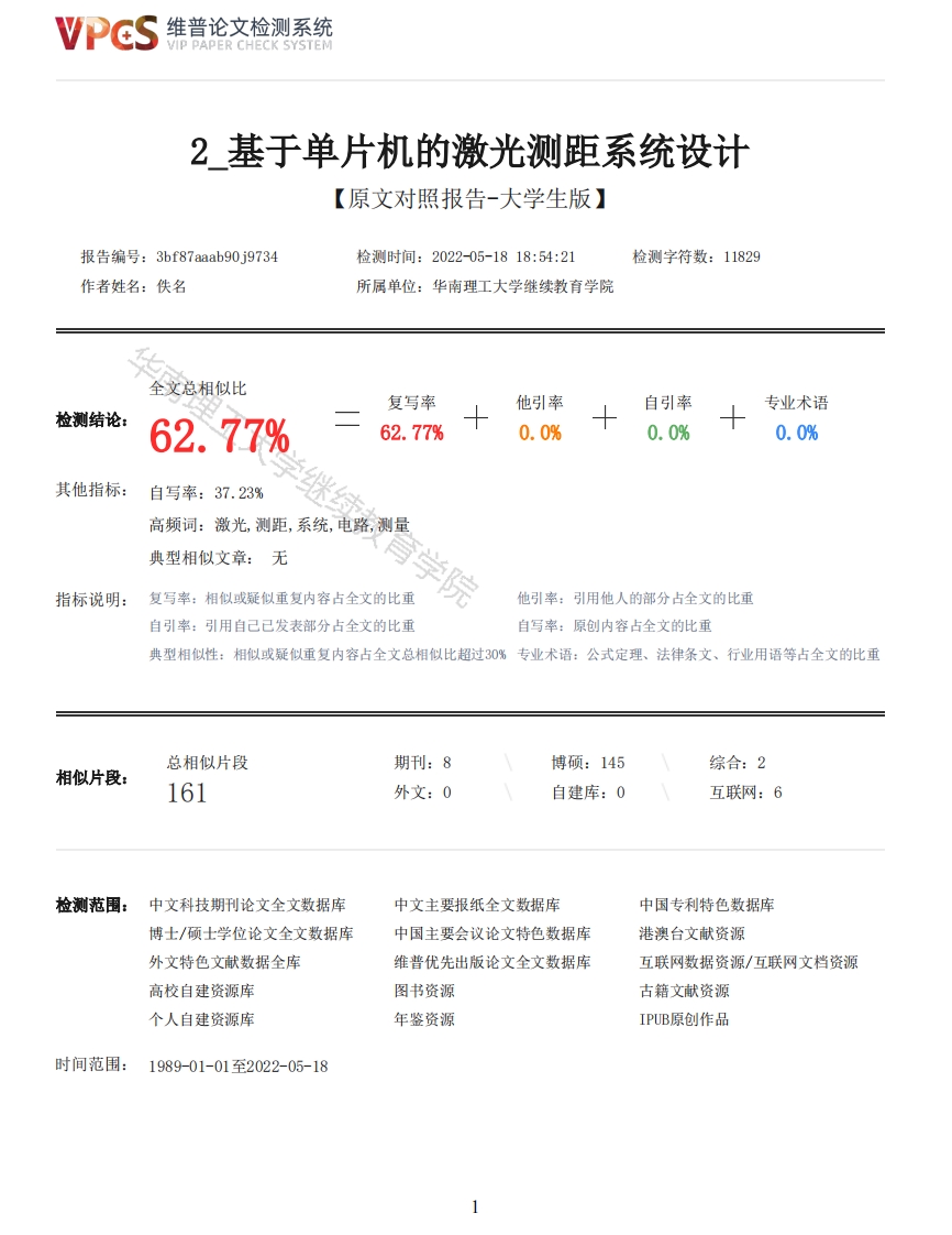 维普论文检测系统VIP PAPER CHECK SYSTEM2基于单片机的激光测距系统设计【原文对照报告-大学生版】报告编号:3bf87aaab90j9734检测时间:202205-1818:54:21检测字符数:11829作者姓名:佚名所属单位:华南理工大学继续教育学院全文总相似比复写率他引率自引率专业术语检测结论:62.77%62.77%0.0%0.0%0.0%其他指标:自写率:37.23%高频词:激光,测距,系统,电路,测量典型相似文章:无指标说明:复写率:相似或疑似重复内容占全文的比重院他引率:引用他人的部分占全文的比重自引率:引用自己已发表部分占全文的比重自写率:原创内容占全文的比重典型相似性:相似或疑似重复内容占全文总相似比超过30%专业术语:公式定理、法律条文、行业用语等占全文的比重总相似片段期刊:8博硕:145综合:2相似片段:161外文:0自建库:0互联网:6检测范围:中文科技期刊论文全文数据库中文主要报纸全文数据库中国专利特色数据库博士/硕士学位论文全文数据库中国主要会议论文特色数据库港澳台文献资源外文特色文献数据全库维普优先出版论文全文数据库互联网数据资源/互联网文档资源高校自建资源库图书资源古籍文献资源个人自建资源库年鉴资源IPUB原创作品时间范围:1989-01-01至2022-05-18维普论文检测系统VIP PAPER CHECK SYSTEM原文对照颜色标注说明:■自写片段■复写片段(相似或疑似重复)口引用片段(引用)■专业术语(公式定理、法律条文、行业用语等)基于单片机的激光测距系统设计摘要随着科技的发展,对测距手段的需求从接触式转向非接触式。随着激光技术的快速发展,用半导体激光器获得非接触式测距仪的可能性成为可能。与传统测距技术相比,激光测距仪具有测量精度高、准直性好、抗干扰性高等一系列优点。它在遥感、精确测量、工程建设、安全监测和智能控制等领域发挥着重要作用。为了解决国家激光测距仪下测量精度低、测距短的问题,并考虑到系统的成本和功率,本文提出了一种性能较差的高精度激光测距系统。在脉冲激光测量基础上设计了激光测距系统的总体方案。关键词:激光测距:脉冲法:高精度AbstractWith the development of science and technology,the demand for ranging means has changed fromcontact to non-contact With the rapid development of laser technol ogy,it is possible to obtain non-contact rangefinder with semiconductor laser.Compare d with traditional ranging technology,laserrangefinder has a series of advantages such as high measurement accuracy,good collimation and highanti-interference.It plays an important role in remote sensing,precise measurement,engineeringconstruction,safet y monitoring and intelligent control.In order to solve the problems of low measurement accuracy and short ranging un der the nationallaser rangefinder,and considering the cost and power of the system,a high-precision laserrangefinder system with poor performance is proposed in this pap er.On the basis of pulsed lasermeasurement,the overall scheme of laser ranging syste m is designed.Key words:laser ranging;Pulse method;high-precision1绪论1.1研究背景·····32激光测距的基础···42.2脉冲式激光测距原理····3激光测距系统设计·····3.1激光测距系统结构·····2维普论文检测系统VIP PAPER CHECK SYSTEM3.2微控制器及其电路设计······4计时及显示部分设计····4.1计时部分·······104.2电源管理电路设计・・・・104.3LED显示部分121345A/D采样模块软件设计5系统测试与分析6结语1绪论1.1研究背景在日常生产生活中,以及在科学研究中,距离测量是相关的。目前,远程测量的概念是从传统的非高精度操作精度低的比较关系发展起来的,这不仅是测量方法的改进,也是社会科学技术的重大进步。激光测量是一种无接触距离测量方法.其工作原理是向目标发射极弱的激光脉冲,光电探测器接收反射目标的激光束,定时器测量发射与接收激光束之间的时间,从而什算观察者与目标的距离。与传统的测距方法(红外测量、超声波测量等)相比,在电力、通信、工程建设、航海测量、户外运动等行业中发挥着重要作用。1.2研究意义测距仪和脉冲测距仪分为相位测距仪和脉冲测距仪.脉冲激光测距仪在工作时向目标方向发射光束或一系列短脉冲激光束,反射目标的激光束被光电元件接收。定时器测量激光束发射和接收之间的时间,计算观察者到目标的距离。相位激光测距仪通过在太空中传播透射光和反射光时检测相位差来测量距离。激光测距仪在重量轻、体积小、操作简便、速度快、精度高等方面有很大的优点,其误差为其他光学测距仪误差的五分之一到几百个。右电路是典型的相位和脉冲测距电路随着科技的进步,激光测距系统朝着测量精度高、测量距离远、安全、功率小、小型化的方向发展[3]。目前,激光测距系统的研究方向呈现出三大趋势:一是融合了简单测距与三维扫描相结合的应用领域,建立了激光雷达或三维地形系统:二是精度高,在保证测量范围、测量精度的前提下:第三,它是安全的。激光亮度高,能量集中对人的眼睛有害。根据测量原理,激光测距仪可分为脉冲激光测距仪、干涉激光测距仪、反馈激光测距仪、激光测距仪三角形、相位激光测距仪等。其中最常见的是脉冲激光测距和相位激光测距。根据载波数的不同,激光测量分为单载波和多载波.激光测距仪可根据测量距离分为三类:短距离激光测距仪,测量距离不超过5公里,广泛应用于各种工程测量:二是中距激光测距仪广泛应用于5至几十公