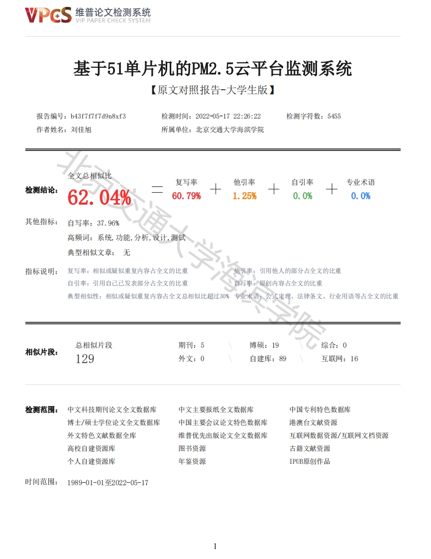 维普论文检测系统VIP PAPER CHECK SYSTEM基于51单片机的PM2.5云平台监测系统【原文对照报告-大学生版】报告编号:b43f7f7f7d9n8xf3检测时间:2022-05-1722:26:22检测字符数:5455作者姓名:刘佳旭所属单位:北京交通大学海滨学院全文总相似比复写率他引率自引率专业术语检测结论:62.04%60.79%1.25%0.0%0.0%其他指标:自写率:37.96%高频词:系统,功能,分析,设计,测试典型相似文章:无指标说明:复写率:相似或疑似重复内容占全文的比重他引率:用他人的部分占全文的比重自引率:引用自己已发表部分占全文的比重自写率:原创内容占全文的比重典型相似性:相似或疑似重复内容占全文总相似比超过30%专业术语,公式定理、法律条文、行业用语等占全文的比重总相似片段期刊:5博硕:19综合:0相似片段:129外文:0自建库:89互联网:16检测范围:中文科技期刊论文全文数据库中文主要报纸全文数据库中国专利特色数据库博士/硕士学位论文全文数据库中国主要会议论文特色数据库港澳台文献资源外文特色文献数据全库维普优先出版论文全文数据库互联网数据资源/互联网文档资源高校自建资源库图书资源古籍文献资源个人自建资源库年鉴资源IPUB原创作品时间范围:1989-01-01至2022-05-17维普论文检测系统VIP PAPER CHECK SYSTEM原文对照颜色标注说明:■自写片段■复写片段(相似或疑似重复)口引用片段(引用)■专业术语(公式定理、法律条文、行业用语等)1.4组织结构本次设计以PM2.5的测量为重要研究对象,首先对设计背景进行分析和研究,然后对国内外领域的发展现状进行分析,然后确定了系统研究内容,在完成这些任务后进行系统硬件和软件的设计工作,通过最后的功能验证和测试完善了本次设计,本次设计结构如下。◆本文共包括了7个章节,具体组织安排如下所示。第一章绪论。该部分主要阐述了P2.5监测的背景和研究意义,从国内外现状进行系统分析,对本次的设计做了准备,同时从侧面简要说明了本次设计的意义。第二章相关技术介绍。本部分内容立足于实际设计,在对设计进行分析的基础上对本次设计应用到的有关技术进行分析和介绍,为技术应用打下基础。第三章系统分析。本章以PW2.5的设计与研究为主要研究对象,对系统产品设计的有关内容进行分析与介绍,进一步明确了本次设计系统路线。第四章系统设计。本章以系统设计为框架,主要进行了系统的设计,系统设计以功能模块为研究对象进行分析与设计。第五章系统实现。本章主要介绍了程序代码的运行过程实现了系统模块化功能,并且通过观察实物工作的方式印证了系统代码的正确性。第六章系统测试。本章主要论述了系统的测试过程,在测试中对测试情况进行详细数据参数记录,对粉尘浓度测量系统的发展做了充足的准备。第七章总结与展望。本章主要对本次设计进行系统总结,对可能存在的完善之处进行了简要说明和分析。本章主要介绍了系统开发过程中所用到的相关技术,包括硬件开发工具Kei1 uVision4、原理图绘制软件A1 tium Designer、开发语言C语言、STC89C52单片机、传感器技术和WIFI模块。STC89C52是STC公司生产的一种低功耗高性能QM0S8位微控制器,采用了8K可编程F1ash内存[20]。STC89C52采用了经典的MCS-51内核,但是经过了大量改进,使其性能超过了51单片机。在单芯片上,STC89C52有灵活的8比特cpu和可编程FIsh,为众多的嵌入式控制应用系统提供了有效、灵活度高的解决方案。STC89C52具有以下标准功能:8k字节F1ash,32位I/0口线,看门狗定时器,512字节RAM,内置4 KB EEPROM,MAX810复位电路,全双工串行口,一个7向量4级中断结构(兼容传统51的5向量2级中断结构),4个外部中断,3个16位定时器/计数器。此外,STC89C52还可降至OHz进行静态逻辑操作,并支持2种可选择软件节电模式。闲置模式下,CPU将停止工作,允许RAM、串口、定时器/计数器、中断继续工作。在掉电保护模式下,AM的内容被存储,振荡器冻结,单片机所有工作停止,直到下一个中断或硬件复位为止。其最高运作频率为35MHz,有6T/12T两种可选。本设计以单片机为核心,负责接收来自传感器的信号,并向执行系统发出指令。从上个世纪七十年代,单片机就是各项系统的核心,其功能在这些年期间一直都在升级改善。如今的单片机,在性能上有了飞跃式的提高。而现在单片机在航空航天、军事、仪器以及各种智能设备一直都是作为中枢大脑一样的存在,有着极其关键的作用。STC89C52内置8K线上编程闪存、在线可编程闪存和8位中央控制器,为小型电子应用系统提供核心数据处理。STC89C52单片机主要特性如图2-1所示:2维普论文检测系统VIP PAPER CHECK SYSTEM(1)增强型1T流水线/精简指令集结构8051CPU。(2)(5V单片机)/2.0V-3.8V(3)时钟频率035MHz,实际工作频率可达48Mz。(4)用户应用程序空间2K/4K/6K/8K/10K/12K字节。(5)片上集成了512字节RAM。(6)ISP/IAP(在应用可编程),无需专用编程器。可通过串▣(P3.0/P3.1)直接下载用户程序。(7)2个16位计数器/定时器。2.2传感器技术传感器技术与计算机和通信技术是信息技术里的三大支柱,因为硬件系统自身无法直接获得各种需要的信息,因此需要传感器来获得所需要的数据。在硬件系统中,传感器将测量得到的生物、物理、化学等信息量。利用生物,物理和化学效应将其转换为所需的电量。本设计采用的三种传感器如下所示[15]。(1)GP2Y1010U0F是一种用于测量灰尘微粒的光学空气质量传感器,其内部对角安装有红