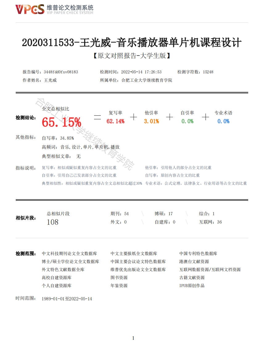 维普论文检测系统VIP PAPER CHECK SYSTEM2020311533-王光威-音乐播放器单片机课程设计【原文对照报告-大学生版】报告编号:3448fdd0fxv08183检测时间:2022-05-1417:26:53检测字符数:15248作者姓名:王光威所属单位:合肥工业大学继续教育学院全文总相似比复写率他引率自引率专业术语检测结论:65.15%62.14%3.01%0.0%0.0%其他指标:自写率:34.85%高频词:音乐,设计,单片,单片机,播放典型相似文章:无指标说明:复写率:相似或疑似重复内容占全文的比重院他引率:引用他人的部分占全文的比重自引率:引用自己已发表部分占全文的比重自写率:原创内容占全文的比重典型相似性:相似或疑似重复内容占全文总相似比超过30%专业术语:公式定理、法律条文、行业用语等占全文的比重总相似片段期刊:54博硕:17综合:1相似片段:108外文:0自建库:0互联网:36检测范围:中文科技期刊论文全文数据库中文主要报纸全文数据库中国专利特色数据库博士/硕士学位论文全文数据库中国主要会议论文特色数据库港澳台文献资源外文特色文献数据全库维普优先出版论文全文数据库互联网数据资源/互联网文档资源高校自建资源库图书资源古籍文献资源个人自建资源库年鉴资源IPUB原创作品时间范围:1989-01-01至2022-05-14VPCS维普论文检测系统VIP PAPER CHECK SYSTEM原文对照颜色标注说明:■自写片段■复写片段(相似或疑似重复)口引用片段(引用)■专业术语(公式定理、法律条文、行业用语等)课程名称C51单片机课程设计题目名称基于51单片机的音乐播放器专业班级20级计算机科学与技术2班学生姓名王光威学号2020311533指导教师李宏芒2022.4.16目录一引言······二课程设计报告..1总体设计方案····2设计思路·········3设计方框图·······三设计原理分析·····1时钟振荡电路······3音调和节拍的设计············(1)音调和节拍的设计以及音乐基础知识·(2)节拍的定义·············(3)音调和节拍的编码···········(4)简谱对应的简普码T值节拍数···2维普论文检测系统VIP PAPER CHECK SYSTEM4C源程序设计,7(1)音乐程序(2)LED花样程序・・・・・(3)数码管程序·····11四参考文献····12五心得体会13附录1:源代码·············14附录2:protues电路原理图及仿真结果····一引言肥电子音乐已广泛地应用于社会生活的各个领域。其类型从音乐卡片到CDMP3等多种多样,制作原理也各不相同。声音是通过振动产生的。单片机对某一I/0引脚以一定的频率循环置1和清0,这一引脚便产生一定频率的方波,该方波通过放大后作用于扬声器便产生一定频率的声音。若改变输出方波的频率,产生的声音也就改变了。通过控制输出方波的时间长短,声音的长短也就得到控制。因此,根据乐谱,单片机就可产生电子音乐。音乐中最关键的两个要素是音符和节拍。单片机控制的音乐发生器系统由硬件电路和软件两部分构成。利用单片机控制的电子音乐发生器软硬件上具有独特的优点,系统的开发周期短,成本低,电路制作容易。更换歌曲时,硬件电路无需作任何修改,只需修改软件即可实现。软件编程时,可用51系列单片机的汇编语言或C51语言实现。同时还可根据个人的习好通过软件改变节拍的延时时间,增加电子音乐的趣味性。随着人类社会的发展,人们对视觉听觉方面的享受提出了越来越高的要求。小小的音乐盒可以给人们带来美好的回忆,提高人们的精神文化享受。传统的音乐盒多是机械型的,体积笨重,发音单调,不能实现批量生产。本文设计的音乐盒是以单片机为核心元件的电子式音乐盒,体积小,重量轻,能演奏和旋音乐,功能多,使用方便,可以批量生产,具有一定的商业价值。伴随着科技的发展和时代的进步,人们对生活质量的要求也越来越高,由以前简单的追求温饱和物质财富转向更高层面的精神追求。而这一切催生了智能仪器的发展,在人们长期处于工作、学习压力过大的状态下,对于调节心理压力而言,音乐对于每一一个人都十分重要。目前市场上出现了许许多多的音乐播放器,而人们对播放器的功能需求也越来越广泛,本文将介绍一种以AT89C51型单片机为基础元件设计的音乐播放器。通过对其全面的介绍与分析,让大家了解音乐播放器的原理。音乐播放器,可以通过单片机仿真软件上的数字按键对音乐播放的曲目进行控制,并且通过LED灯将播放的音乐加以区分,在播放音乐的同时点亮LD灯,让人知道现在正在播放的音乐曲目,从而实现简单的音乐播放功能。本文主要是应用MCS-51单片机原理和控制理论设计音乐演奏控制器的硬件电路,并利用C语言进行程序设计,利用单片机编成技术对芯片进行功能设定和定时器中断,在单片机内部产生所需要的音乐频率,并通过音频功率放大器将音频信号放大,通过蜂鸣器连续播放一段音乐。通过控制单片机内部的定时器来产生不同频率的方波,驱动蜂鸣器发出不同音调的音乐,再利用延迟来控制发音时间的长短。把乐谱转化成相应的定时常数就可以从发音设备中演奏出悦耳动听的音乐。本次设计通过多次测试,音乐声音宏亮清晰,节拍正常,达到预期效果。本文将围绕音乐播放器,介绍一些关于单片机的基础知识、音乐播放器的制作原理及方法(其中包括了音乐编程原理)、定时器的设定,以及仿真软件(Keil、Proteus)的使用方法。二课程设计报告1总体设计方案根据音乐播放器系统的功