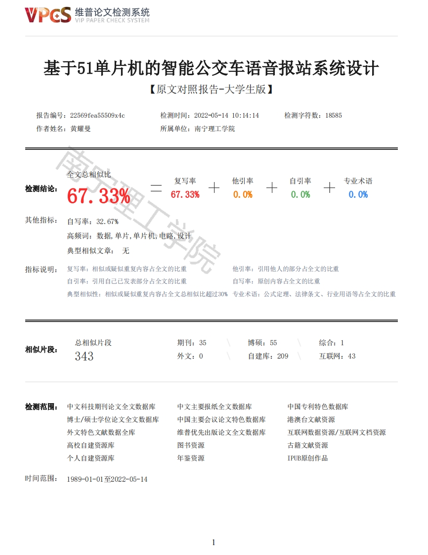 维普论文检测系统/IP PAPER CHECK SYSTEM基于51单片机的智能公交车语音报站系统设计【原文对照报告-大学生版】报告编号:22569fea55509x4c检测时间:202205-1410:14:14检测字符数:18585作者姓名:黄耀曼所属单位:南宁理工学院全文总相似比复写率他引率自引率专业术语检测结论:67.33%67.33%0.0%0.0%0.0%其他指标:自写率:32.67%高频词:数据,单片,单片机,电路,设计典型相似文章:无指标说明:复写率:相似或疑似重复内容占全文的比重他引率:引用他人的部分占全文的比重自引率:引用自己已发表部分占全文的比重自写率:原创内容占全文的比重典型相似性:相似或疑似重复内容占全文总相似比超过30%专业术语:公式定理、法律条文、行业用语等占全文的比重总相似片段期刊:35博硕:55综合:1相似片段:343外文:0自建库:209互联网:43检测范围:中文科技期刊论文全文数据库中文主要报纸全文数据库中国专利特色数据库博士/硕士学位论文全文数据库中国主要会议论文特色数据库港澳台文献资源外文特色文献数据全库维普优先出版论文全文数据库互联网数据资源/互联网文档资源高校自建资源库图书资源古籍文献资源个人自建资源库年鉴资源IPUB原创作品时间范围:1989-01-01至2022-05-14维普论文检测系统VIP PAPER CHECK SYSTEM原文对照颜色标注说明:■自写片段■复写片段(相似或疑似重复)引用片段(引用)■专业术语(公式定理、法律条文、行业用语等)学号:18090207题目类型:设计(设计、论文、报告)毕业设计(论文)题目:基于51单片机的智能公交车语音报站系统设计二级学院:信息工程学院专业(方向):通信工程班级:1802学生:黄耀曼指导教师:莫竹林年月日摘要本设计是基于STC89C52单片机进行的公交车语音报站系统设计。系统主要是由以下DS1302时钟电路、语音播报电路、单片机控制电路、GPS电路、LCDI2864显示电路这五个模块组成。系统程序采用C语音编写,通过Kei1uvision4C52软件调试完成后下载到STC89C52单片机进行下一步调试。本系统可以实现模拟公交车手动语音播报和自动语音播报,还能播放音乐和广告的功能。本设计基于51单片机公交车语音报站具有电路简洁、实用性大,成本低等优点。关键词:STC89C52单片机:公交车语音报站:C语言:GPSDesign of Intelligent Bus Voice Announcement System Based on 51 Single Chip MicrocomputerStudent:HUANG Yao-man Teacher:MO Zhu-linAbstract:This design is based on STC89C52 single-chip microcomputer,and the bus voiceannouncement system is designed.The system is mainly composed of the following five modules:DS1302clock circuit,voice broadcast circuit,MCU control circuit,GPS circuit and LCD12864 displaycircuit.The program is written in C voice,and after debugging by Keil uvision4 C52 software,it isdownloaded to STC89C52 microcontroller for further debugging.This system can simulate the manualvoice broadcast and automatic voice broadcast of buses,and can also play music and advertisements.The design of bus voice announcement station based on 51 single chip microcomputer has theadvantages of simple circuit,high practicability and low cost.2维普论文检测系统VIP PAPER CHECK SYSTEMKey words:STC89C52 single chip microcomputer:Bus voice announcement:C programming language:GPS目录摘要···II1.1课题研究的意义和背景·····1.2系统总体设计的思路·········1.2.1硬件系统总体设计的思路····11.2.2软件系统总体设计的思路····1.3课题研究的主要内容和准备工作···1.3.1主要内容···⊙2硬件设计··········2.1整体硬件设计·····2.2硬件模块选取原则···2.2.1 STC89C52芯片介绍・・1.主要特征········2.引脚功能·········3.定时/计数器···4.外部中断······1. HT1818Z3G5L的优点・・・・2. HT1818Z3G5L的技术特性・・2.3.各个模块电路设计····10102.3.3语音播报电路·····122.3.4按键电路·······..122.3.6LCD12864电路・·・・3