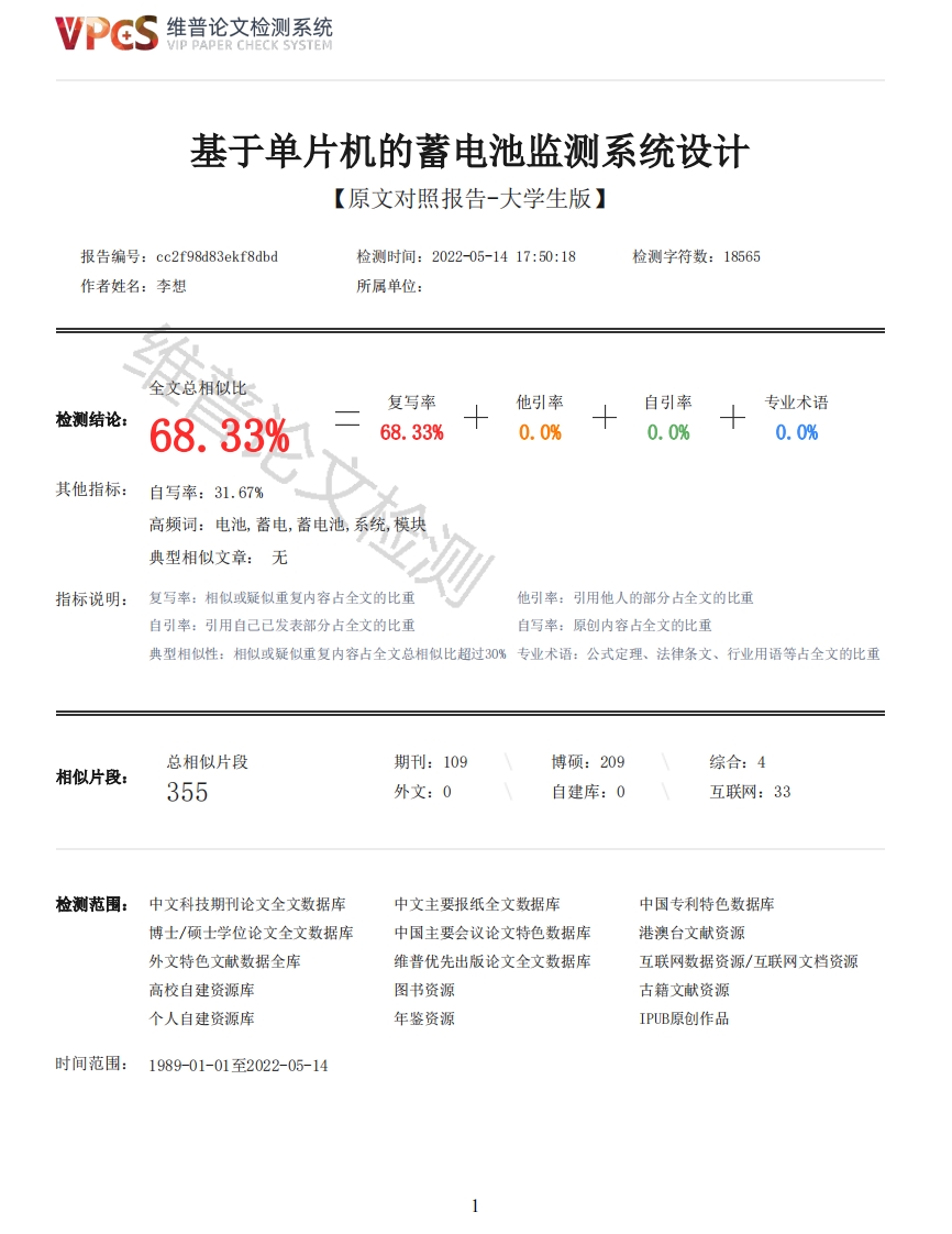 维普论文检测系统VIP PAPER CHECK SYSTEM基于单片机的蓄电池监测系统设计【原文对照报告-大学生版】报告编号:cc2f98d83ekf8dbd检测时间:2022-05-1417:50:18检测字符数:18565作者姓名:李想所属单位:全文总相似比复写率他引率自引率专业术语检测结论:68.33%68.33%0.0%0.0%0.0%其他指标:自写率:31.67%高频词:电池,蓄电,蓄电池,系统,模块典型相似文章:无指标说明:复写率:相似或疑似重复内容占全文的比重他引率:引用他人的部分占全文的比重自引率:引用自己已发表部分占全文的比重自写率:原创内容占全文的比重典型相似性:相似或疑似重复内容占全文总相似比超过30%专业术语:公式定理、法律条文、行业用语等占全文的比重总相似片段期刊:109博硕:209综合:4相似片段:355外文:0自建库:0互联网:33检测范围:中文科技期刊论文全文数据库中文主要报纸全文数据库中国专利特色数据库博士/硕士学位论文全文数据库中国主要会议论文特色数据库港澳台文献资源外文特色文献数据全库维普优先出版论文全文数据库互联网数据资源/互联网文档资源高校自建资源库图书资源古籍文献资源个人自建资源库年鉴资源IPUB原创作品时间范围:1989-01-01至2022-05-14维普论文检测系统VIP PAPER CHECK SYSTEM原文对照颜色标注说明:■自写片段■复写片段(相似或疑似重复)口引用片段(引用)■专业术语(公式定理、法律条文、行业用语等)毕业设计题目:院、系:姓名:指导教师:系主任:年月日基于单片机的蓄电池监测系统的设计摘要蓄电池作是日常生活中常见的储能设备,作为一种安全可靠的直流电源广泛应用于电力、石化、通讯等领域。为了保证蓄电池可以正常运行,重视和加强对蓄电池的维护工作,特别是对蓄电池实施实时监测意义重大。本文设计了一种基于单片机的蓄电池监测系统,该系统可以对蓄电池的电压、电流以及蓄电池所处环境的温度和时间进行采集,将采集的数据在LD屏幕上进行显示,让工作人员更直观地观察到蓄电池运行的情况。同时将这些数据通过蓝牙发送到手机上,可以实现远程监测的功能,即使不在蓄电池的附近,当蓄电池发生故障时也可以通知附近的维护人员对蓄电池进行处理。该系统还可以通过按键来设计报警的上限值,可以根据实际情况灵活地运用该系统,一旦蓄电池参数超过上限值,系统搭载的蜂鸣器和指示灯会进行报警,一边维护人员及时发现并进行处理。本文对系统的主控单元,数据采集,故障报警以及蓝牙通信等软硬件设计与实现进行重点阐述。系统采用STC89C52作为主控制器,采用电流传感器ACS712和数模转换芯片ADC0832对蓄电池的电流、电压进行监测,采用DS18B20对蓄电池所处环境的温度进行监测,采用蓝牙模块HC-06与手机进行通信,采用DS1302时钟芯片进行时间的显示,通过按键设置蓄电池的温度上限、电流上限和电压上限,报警功能通过蜂鸣器和小灯实现,选用LCD1602进行时间和蓄电池相关信息的显示。关键词蓄电池,电流,电压,蓝牙Design of battery monitoring system based on microcontrollerAbstractBattery is a common energy storage equipment in daily life,as a safe and reliable DC powersupply is widely used in electric power,petrochemical,communications and other fields.In order toensure that the battery can operate normally,it is of great significance to attach importance toand strengthen the maintenance of the battery,especially the implementation of real-time onlinemonitoring of the battery.In this paper,a single-chip microcomputer-based battery monitoring system is designed,whichcan collect the voltage,current and temperature and time of the battery environment,and display2维普论文检测系统VIP PAPER CHECK SYSTEMthe collected data on the LCD screen,so that the staff can more intuitively observe the operationof the battery.At the same time,the data is sent to the mobile phone through Bluetooth,which canrealize the function of remote monitoring,even if it is not near the battery,when the batteryfails,it can also notify the nearby maintenance personnel to process the battery.The system canalso design the upper limit of the alarm through the keys,can be flexibly used according to theactual situation of the system,once the battery parameters exceed the upper limit,the systemequipped with buzzers and indicators will be alarmed,while the maintenance personnel in time tofind and deal with.This paper focuses on the design and implementation of software and hardware such as the maincontrol unit,data acquisition,fault alarm and Bluetooth communication of the system.The systemadopts STC89C52 as the main controller,adopts the current sensor ACS712 and the digital-to-analogconversion chip ADC0832 to monitor the current and voltage of the battery,uses DS18B20 to monitorthe temperature of the environment in which the battery is located,uses the Bluetooth module HC-06to communicate with the mobile phone,uses the DS1302 clock chip for time display,sets the uppertemperature limit,current upper limit and voltage upper limit of the battery through the button,and the alarm function is realized by buzzer and small lamp.The LCD1602 is selected for display oftime and battery information.Keywords Battery,current,voltage,Bluetooth目录Design of battery monitoring system based on microcontroller··········'III第1章绪论······11.1课题背景及其意义····1.2国内外的研究状况·······1.1.1国内研究现状·····11.1.2国外研究现状····1.3本文主要研究内容····第2章系统方案设计·····2.1系统功能设计······2.2系统总体方案设计·····2.1.1单片机最小系统设计2.1.2电流监测模块的选择··2