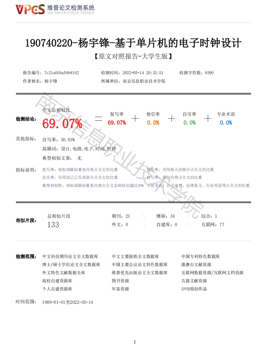 维普论文检测系统VIP PAPER CHECK SYSTEM190740220-杨宇锋-基于单片机的电子时钟设计【原文对照报告-大学生版】报告编号:7c21a018a59b8162检测时间:2022-05-1420:32:51检测字符数:8390作者姓名:杨宇锋所属单位:南京信息职业技术学院全文总相似比复写率他引率自引率专业术语检测结论:69.07%69.07%0.0%0.0%0.0%其他指标:自写率:30.93%高频词:设计,电路,电子,时间,时钟典型相似文章:无指标说明:复写率:相似或疑似重复内容占全文的比重他引率:引用他人的部分占全文的比重自引率:引用自己已发表部分占全文的比重自写率:原创内容占全文的比重典型相似性:相似或疑似重复内容占全文总相似比超过30%专亚术语:公式定理、法律条文、行业用语等占全文的比重总相似片段期刊:21博硕:34综合:1相似片段:133外文:0自建库:0互联网:77检测范围:中文科技期刊论文全文数据库中文主要报纸全文数据库中国专利特色数据库博士/硕士学位论文全文数据库中国主要会议论文特色数据库港澳台文献资源外文特色文献数据全库维普优先出版论文全文数据库互联网数据资源/互联网文档资源高校自建资源库图书资源古籍文献资源个人自建资源库年鉴资源IPUB原创作品时间范围:1989-01-01至2022-05-14维普论文检测系统VIP PAPER CHECK SYSTEM原文对照颜色标注说明:■自写片段■复写片段(相似或疑似重复)引用片段(引用)■专业术语(公式定理、法律条文、行业用语等)南京信息职业技术学院毕业设计论文作者杨宇锋学号系部电子信息学院专业光伏发电技术与应用指导教师评阅教师完成时间:2022年月日毕业设计(论文)中文摘要信息职业技术题目基于单片机的电子时钟设计(题目):基于单片机的电子时钟的设计摘要:随着电子器件的技术不断快速发展,电子元件几乎在我们的生活中随处可见,它们是必不可少的。在现实生活中,很多人或事都需要准确地捕捉时间,否则会造成不必要的麻烦。因此,我们迫切需要设计一种携带方便、计时准确的电子钟。本设计是一种基于单片机的简单电子钟设计。该系统主要以单片机AT89C51为核心,结合按键模块显示合适的时间,并能分别对时间、分、秒进行校正,达到标准时间。本系统设计主要是由软件控制硬件和软硬件结合为指导思想,全面的发挥了单片机的功能。而且,本控制系统的许多优点使其非常实用,因为系统功能简单,具有良好的可扩展性。关键词:AT89C51:电子时钟:按键控制毕业设计(论文)外文摘要Title Design of electronic clock based on SCMAbstract:With the rapid development of electronic device technology,electronic components canbe seen almost everywhere in our life,they are essential.In real life,many people and things needto be accurately timed,otherwise it will cause unnecessary trouble.Therefore,we urgently need todesign a portable and accurate electronic clock.This design is a simple electronic clock design based on SCM.The system mainly AT89C51microcontroller as the core,combined with the key module to display the appropriate time,and canbe calibrated to the time,minutes,seconds,to reach the standard time.This system design ismainly by the software control hardware and the combination of hardware and software as the guidingideology,the full play of the single-chip function.Moreover,many advantages of this controlsystem make it very practical,because the system has simple functions and good scalability.2维普论文检测系统VIP PAPER CHECK SYSTEMKey words:single chip microcomputer;temperature and humidity monitoring;LCD display:目录1引言1.1研究背景······1.3研究内容12电子时钟的设计原理·····2.1电子时钟的特点2.2电子时钟的应用··2.3电子时钟的工作原理3硬件系统设计····3.1硬件电路的设计方案3.4报警电路·······4软件系统设计····104.1主程序设计······104.2数码管显示流程····105仿真结果及分析115.1仿真结果····115.2仿真分析·····111213参考文献······1引言1.1研究背景基本上,电子钟是一个典型的数学系统,包括组合逻辑系统和顺序逻辑系统。传统的电子钟设计方法有两种:使用一些中小型集成电路,如组合逻辑电路和时序电路:采用单片机编程技术进行设计。这两种结构都存在设备复杂、使用时间长、成本高等缺点。由于数字集成电路、石英振荡器等相关技术的不断发展,电子钟的性能比旧钟有了很大的提高,更准确、稳定、携带方便。还增加了一个时间函数。在很多方面,如自动定时报警、自动定时控制、定时呼叫等功能,因此电子钟测试有着进一步的应用与研究意义。3
