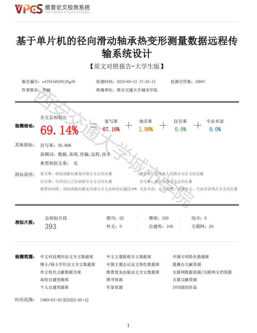 维普论文检测系统VIP PAPER CHECK SYSTEM基于单片机的径向滑动轴承热变形测量数据远程传输系统设计【原文对照报告-大学生版】报告编号:e479f3d528129g39检测时间:2022-05-1217:53:12检测字符数:20997作者姓名:李楠所属单位:西安交通大学城市学院全文总相似比一复写率他引率自引率专业术语检测结论:69.14%67.16%1.98%0.0%0.0%其他指标:自写率:30.86%高频词:数据,系统,传输,远程,技术典型相似文章:无指标说明:复写率:相似或疑似重复内容占全文的比重他引率:引用他人的部分占全文的比重自引率:引用自己已发表部分占全文的比重自写率原创内容占全文的比重典型相似性:相似或疑似重复内容占全文总相似比超过30%专业术语:公式定理、法律条文、行业用语等占全文的比重总相似片段期刊:62博硕:199综合:6相似片段:393外文:0自建库:106互联网:20检测范围:中文科技期刊论文全文数据库中文主要报纸全文数据库中国专利特色数据库博士/硕士学位论文全文数据库中国主要会议论文特色数据库港澳台文献资源外文特色文献数据全库维普优先出版论文全文数据库互联网数据资源/互联网文档资源高校自建资源库图书资源古籍文献资源个人自建资源库年鉴资源IPUB原创作品时间范围:1989-01-01至2022-05-12VPCS维普论文检测系统VIP PAPER CHECK SYSTEM原文对照颜色标注说明:■自写片段■复写片段(相似或疑似重复)口引用片段(引用)■专业术语(公式定理、法律条文、行业用语等)本科毕业设计(论文)任务书题目基于单片机的径向滑动轴承热变形测量数据远程传输系统设计姓名李楠专业机械设计制造及其自动化学号180410071.毕业设计(论文)课题的主要任务(说明:课题背景、意义和培养目标,工程设计类课题应有技术经济分析要求):常见的一线机械设备工作的环境往往比较恶劣,所以造成的工件变形会较多出现。为了能及时发现其故障变形并将其监测数据传回总控室进行分析和处理,需要将变形测量装置检测的数据进行远程传输,远程数据采集系统通过数据采集终端采集远程现场的环境数据,然后通过主控器将获得的最新数据传给数据中心,并且在出现意外情况的时候及时告警,数据中心的工作人员可以通过电脑终端发送查询控制命令,获得相关的历史和实时数据,及时做出决策。本课题主要对象为径向滑动轴承热变形测量数据的远程传输,欲将现场测的的数据通过远程传输传至中央数据区存储以便进一步的分析和研究。主控器通过将用户配置的参数存储在存储介质中保证参数在断电时不丢失,从而增强系统的适应性,使得系统可以适应不同环境的需求。本课题涉及到大学本科单片机系统设计、电工技术、计算机语言等知识,可以培养学生较好的综合运用所学知识的能力。2.课题的具体工作内容(原始数据、技术要求、案例分析资料、工作要求等。说明:工科类“技术要求”要有指标参数的具体要求。):1)远程数据传输方案设计,以单片机控制系统为基础:2)远程数据传输装置设计,包括选型和控制方式:3)远程数据传输详细设计,包括硬件和软件设计:4)根据设计绘制相应流程图并编写程序3.课题完成后提交的书面材料要求(论文字数,图纸规格、数量,实物样品,外文翻译字数等):1)撰写毕业设计论文不少于15000字:2)专业英文资料翻译,不少于12000印刷符:3)附加流程图及程序清单,4.主要参考文献(指导教师应向学生列出明确的参考文献(含外文文献)一般不少于5篇,不包括词典、手册。学生论文最终引用参考文献不限于任务书所列文献,须达到要求篇数):[1]范舒颜,微机和单片机串行通讯接口的电路设计【J】计算机产品与流通,2020,(08)2维普论文检测系统VIP PAPER CHECK SYSTEM[2]吴乐明,基于单片机技术的多机通信系统设计【J】,中国新通信2018,20,(09)[3]殷秀壮、德湘轶,浅析单片机技术的发展与应用【J】,南方农机,2018,49,(11)[4]徐美娟,电子技术中单片机的应用研究【J】,电子测试,2021,(21)[5]黄广林,我国单片机技术的应用及发展趋势【J】,电子技术与软件工程,2017,(19)[6]郇恒强、等,基于STC15单片机的牧区远程围栏门禁系统设计【J】,黑龙江畜牧兽医,2020,(09)[7]高岩,简述单片机的发展趋势及其在设备自动化系统改造中的应用[J],科技风,2020,(13)[8]杜志民、白培瑞、韩旭,油田注水硬件控制和远程监控系统的平台设计[J刀,计算机测量与控制,2020,28,(04)[9]张宸宇,基于GPRS的纯电动矿山车远程监控车载终端设计[J],,计算机时代,2020,(04)[10]Bassam Shaer;Lesley Ray;Jacob McBee;Anthony Graham;Connor Watkins;Danita Lee Marcum,Interactive capacitive touch music table with embedded microcontrollers [J],The Journal ofSupercomputing,2020,pp要求完成日期:◆2022年05月25日接受任务日期:2021年12月06日指导教师(签名):王小丽学生(签名):李楠基于单片机的径向滑动轴承热变形测量数据远程传输系统设计摘要常见的一线机械设备工作的环境往往比较恶劣,所以造成的工件变形会较多出现。为了能及时发现其故障变形并将其监测数据传回总控室进行分析和处理,需要将变形测量装置检测的数据进行远程传输,远程数据采集系统通过数据采集终端采集远程现场的环境数据,然后通过主控器将获得的最新数据传给数据中心,并且在出现意外情况的时候及时告警,数据中心的工作人员可以通过电脑终端发送查询控制命令,获得相关的历史和实时数据,及时做出决策。传统的基于单片机的数据采集系统由