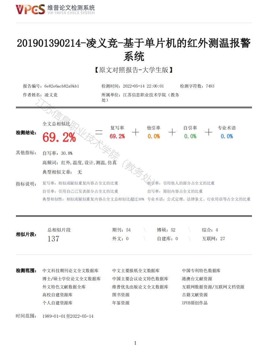 维普论文检测系统/IP PAPER CHECK SYSTEM201901390214-凌义竞-基于单片机的红外测温报警系统【原文对照报告-大学生版】报告编号:6e82e6acb82a9kb1检测时间:2022-05-1422:00:01检测字符数:7493作者姓名:凌义竞所属单位:江苏信息职业技术学院(教务处)全文总相似比复写率他引率自引率专业术语检测结论:69.2%69.2%0.0%0.0%0.0%其他指标:自写率:30.8%高频词:红外,温度,设计,测温,仿真典型相似文章:无教务指标说明:复写率:相似或疑似重复内容占全文的比重他引率:引用他人的部分占全文的比重自引率:引用自己已发表部分占全文的比重自写率:原创内容占全文的比重典型相似性:相似或疑似重复内容占全文总相似比超过0%专业术语:公式定理、法律条文、行业用语等占全文的比重总相似片段期刊:54博硕:52综合:4相似片段:137外文:0自建库:0互联网:27检测范围:中文科技期刊论文全文数据库中文主要报纸全文数据库中国专利特色数据库博士/硕士学位论文全文数据库中国主要会议论文特色数据库港澳台文献资源外文特色文献数据全库维普优先出版论文全文数据库互联网数据资源/互联网文档资源高校自建资源库图书资源古籍文献资源个人自建资源库年鉴资源IPUB原创作品时间范围:1989-01-01至2022-05-14维普论文检测系统VIP PAPER CHECK SYSTEM原文对照颜色标注说明:■自写片段■复写片段(相似或疑似重复)引用片段(引用)■专业术语(公式定理、法律条文、行业用语等)第一章概述1.1选题意义现如今随着科学发展,单片机在检测系统中得到了广泛的应用,而温度与我们生产生活密切相关。温度湿度传感器的应用范围不仅应用于日常生活中而且也大量应用于自动化和过程检测系统控制。由于医疗发展的要求,在许多情况下,一般体温计已经不能满足快速准确的温度测量的要求,例如在火车站和机场等人口密度高的地方测量人体温度。为了在特殊环境中有效地进行温度测量,有效控制和防止特殊疾病的传播,迫切需要开发一种测温速度快、精度高的温度计。对于一般的工业红外测温仪来说,精度不够高,我们遵循红外测温的原理,通过关键器件的选择、目标系统的设计以及温度补偿的自动调节,提高红外测温仪的精度,红外测温电路设计用于在拥挤和高通量人群中快速测量人体温度。1.2红外测温技术的发展历程红外测温技术在生产过程中,在产品质量控制和监测,设备在线故障诊断和安全保护以及节约能源等方面发挥了着重要作用。近20年来,非接触红外测温仪在技术上得到迅速发展,性能不断完善,功能不断增强,品种不断增多,适用范围也不断扩大,市场占有率逐年增长。比起接触式测温方法,红外测温有着响应时间快、非接触、使用安全及使用寿命长等优点。非接触红外测温仪包括便携式、在线式和扫描式三大系列,并备有各种选件和计算机软件,每一系列中又有各种型号及规格。在不同规格的各种型号测温仪中,正确选择红外测温仪型号对用户来说是十分重要的。红外检测是一种在线监测(不停电)式高科技检测技术,它集光电成像技术、计算机技术、图像处理技术于一身,通过接收物体发出的红外线(红外辐射),将其热像显示在荧光屏上,从而准确判断物体表面的温度分布情况,具有准确、实时、快速等优点。任何物体由于其自身分子的运动,不停地向外辐射红外热能,从而在物体表面形成一定的温度场,俗称“热像”。红外诊断技术正是通过吸收这种红外辐射能量,测出设备表面的温度及温度场的分布,从而判断设备发热情况。目前应用红外诊技术的测试设备比较多,如红外测温仪、红外热电视、红外热像仪等等。像红外热电视、红外热像仪等设备利用热成像技术将这种看不见的“热像”转变成可见光图像,使测试效果直观,灵敏度高,能检测出设备细微的热状态变化,准确反映设备内部、外部的发热情况,可靠性高,对发现设备隐患非常有效。STM32单片机是常用于控制的芯片,在智能仪器仪表、工业检测控制、机电一体化等方面取得了令人瞩目的成果,用其作为温湿度控制系统的也很多。使用单片机能够实现温度全程的自动控制,而且STM32F103C8T6单片机易于学习掌握,性价比高。目前应用红外诊断技术的测试设备比较多,如红外测温仪、红外热电视、红外热像仪等等。像红外热电视、红外热像仪等设备利用热成像技术将这种看不见的“热像”转变成可见光图像,使测试效果直观,灵敏度高,能检测出设备细微的热状态变化,准确反映设备内部、外部的发热情况,可靠性高,对发现设备隐患非常有效。目前,我国也在研发一种体积小,成本较低,又不受外界环境温度干扰的人体红外测温仪,对医学的发展有很重大的意义。1.3国内外研究现状自从1800年英国天文学家F·W·赫歇尔发现红外辐射至今,红外技术的发展经历了将近两个世纪。从那时开2维普论文检测系统VIP PAPER CHECK SYSTEM始,红外辐射和红外元件、部件的科学研究逐步发展,但发展比较缓慢,直到1940年前后才真正出现现代的红外技术。当时,德国研制成硫化铅和几种红外透射材料,利用这些元、部件制成一些军用红外系统,如高射炮用导向仪、海岸用船舶侦察仪、船舶探测和跟踪系统,机载轰炸机探测仪和火控系统等等。其中有些达到实验室试验阶段,有些已小批量生产,但都未来得及实际使用。此后,美国、英国、前苏联等国竞相发展。特别是美国,大力研究
