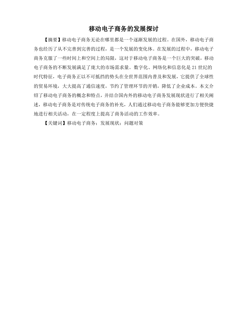 移动电子商务的发展探讨【摘要】移动电子商务无论在哪里都是一个逐渐发展的过程。在国外,移动电子商务也经历了从不完善到完善的过程,是一个发展的变化体。在发展的过程中,移动电子商务克服了一些时间上和空间上的局限,这对于移动电子商务是一个巨大的突破,移动电子商务的不断发展满足了庞大的市场需求量。数字化、网络化和信息化是21世纪的时代特征,电子商务正以不可抵挡的势头在全世界范围内普及和发展,它提供了全球性的贸易环境,大大提高了通信速度,节约了管理环节的开销,降低了企业成本。本文介绍了移动电子商务的概念和特点,并结合国内外的移动电子商务发展现状进行了相关阐述,移动电子商务是对传统电子商务的补充,人们通过移动电子商务能够更加方便快捷地进行相关活动,在一定程度上提高了商务活动的工作效率。【关键词】移动电子商务:发展现状:问题对策目录一、引言…二、移动电子商务的概述1(一)电子商务的定义…(二)电子商务发展优势(三)电子商务发展特征…三、国内外移动电子商务的发展现状…3(一)国外移动电子商务发展现状…(二)中国移动电子商务发展现状4四、我国移动电子商务发展存在的问题分析(一)互联网发展问题…(二)专业型人才短缺问题.…6(三)物流配送问题.6(四)企业管理问题…五、完善我国移动电子商务模式发展的建议(一)深化移动电子商务企业对网络销售的认识…7(二)加大对网络销售人才的培养和管理,加强网络安全与网络支付7(三)完善物流运输安全性..8(四)充分利用网络广告,利用网络收集市场信息和情报8六、移动电子商务案例分析一一以钻石小鸟为例案例.(一)我国传统珠宝行业的市场环境8(二)我国珠宝行业的发展趋势..8(三)珠宝互联网销售模式的现状.(四)钻石小鸟企业的电子商务模式设立…9(五)钻石小鸟企业的电子商务销售模式的问题.9六、总结….11参考文献…一、引言在当前中国电子商务行业快速发展的影响下,传统行业受到了不同程度的冲击。现阶段我国许多传统企业一直面临发展缓慢的局面。众多公司一直想通过渠道和营销创新来达到升级产业和提升品牌的目的,以改变现在。我国移动电子商务行业发展时间很短,移动电子商务营销的过程中出现了很多的问题亟待解决,如产品信用度问题、品牌打造问题、专业人才问题等。以及提出了将国际货源渠道和国内产品鉴定流程进行规范化整合,降低物流风险,扩大合作范围等建议。市场营销是企业或者个人通过契合市场发展、市场态势、市场变化的手段来引导顾客进行自身品牌的认知、品牌的消费,以此来带动整个品牌的树立和发展。市场营销的本质是打开潜在的用户市场,帮助企业占据一定的市场份额。而随着移动电子商务模式的兴起,企业可以通过运用现代传播和推广较快的模式和方式,来达到自身品牌在大众消费群体中的树立和认知,提高企业品牌的认知度和信用度,并且通过运用良好的营销手段提升企业在市场中的核心竞争力,以及品牌在大众消费群体中的认知度,最终提升企业的市场附加值和收益。2二、移动电子商务的概述(一)电子商务的定义现如今,在国内外对于电子商务的概念和定义仍没有做过统一的要求。如果把电子商务的背景来进行定义,那么就可以把电子商务说成互联网商务了,知识经济是电子商务的本质。3在1997年下半年电子商务作为一个专用名字第一次出现在世界上。在因特网普及之前,电子数据交换已经用于商务,这是大家都知道的事情,但是没有人把电子数据交换叫做电子商务。可如今,人们已经认识到电子数据交换与电子商务的出现、经营、架构之间的密切关系,这是对电子数据交换的一次重新认识。电子商务并不是通过面对面的方式来完成交易的,是通过电子方式来完成的。电子商务作为信息时代的高级应用技术,目的是加强与贸易合作伙伴之间的商业关系。其实,1赵晓津,计算机安全技术在电子商务中的应用探讨[J]。硅谷,2014(4):140-141.2雷殷睿,网络安全技术在电子商务中的融合[J刀。计算机光盘软件与应用,2014(4):162-1633余佩颖,微信电子商务模式探讨[J]。软件,2013(10):124-125.1