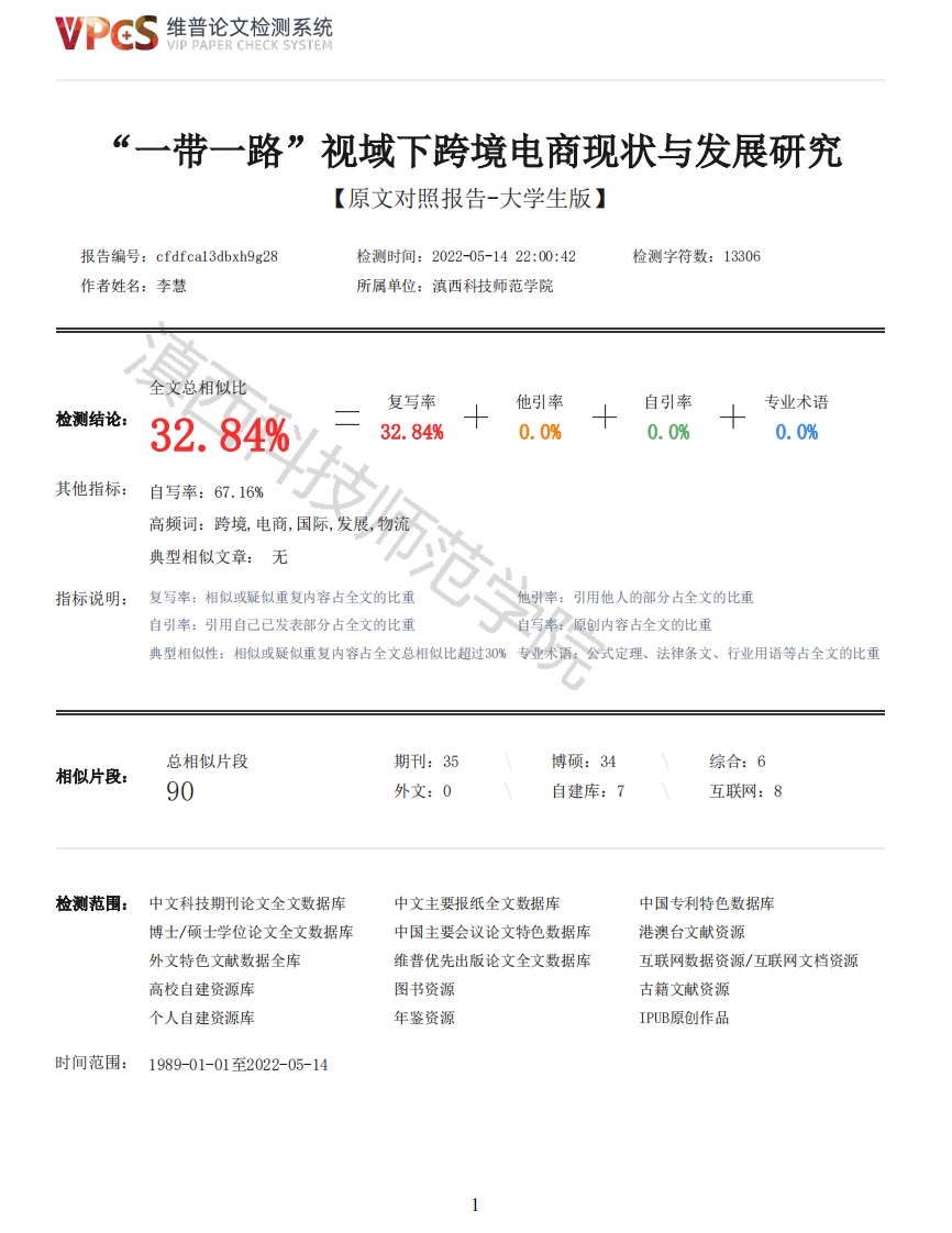 维普论文检测系统/IP PAPER CHECK SYSTEM“一带一路”视域下跨境电商现状与发展研究【原文对照报告-大学生版】报告编号:cfdfcal3dbxh9g28检测时间:2022-05-1422:00:42检测字符数:13306作者姓名:李慧所属单位:滇西科技师范学院全文总相似比复写率他引率自引率专业术语检测结论:32.84%32.84%0.0%0.0%0.0%其他指标:自写率:67.16%高频词:跨境,电商,国际,发展,物流典型相似文章:无指标说明:复写率:相似或疑似重复内容占全文的比重引用他人的部分占全文的比重自引率:引用自己已发表部分占全文的比重自写率:原创内容占全文的比重典型相似性:相似或疑似重复内容占全文总相似比超过30%专业术语:公式定理、法律条文、行业用语等占全文的比重总相似片段期刊:35博硕:34综合:6相似片段:90外文:0自建库:7互联网:8检测范围:中文科技期刊论文全文数据库中文主要报纸全文数据库中国专利特色数据库博士/硕士学位论文全文数据库中国主要会议论文特色数据库港澳台文献资源外文特色文献数据全库维普优先出版论文全文数据库互联网数据资源/互联网文档资源高校自建资源库图书资源古籍文献资源个人自建资源库年鉴资源IPUB原创作品时间范围:1989-01-01至2022-05-14维普论文检测系统VIP PAPER CHECK SYSTEM原文对照颜色标注说明:■自写片段■复写片段(相似或疑似重复)口引用片段(引用)■专业术语(公式定理、法律条文、行业用语等)真西科技师范学院滇西科技师范学院“一带一路”视域下跨境电商现状与发展研究学院:管理与经济学院专业:国际商务年级:2020级学生姓名:李慧学号:2008490210指导教师:张玉超职称:副教授论文完成时间:滇西科技师范学院教务处制滇西科技师范学院毕业论文(设计)原创性声明本人郑重声明:所呈交的论文是本人在导师的指导下独立进行研究所取得的研究成果。除了文中特别加以标注引用的内容外,本论文不包括任何其他个人或集体已经发表或撰写的成果作品。本人完全意识到本声明的法律后果由本人承担。毕业论文(设计)作者签名:日期:年月日本人完全了解滇西科技师范学院有关保留、使用毕业论文(设计)的规定,即:学校有权保留毕业论文并向国家主管部门或其指定机构送交论文的电子版和纸质版。允许论文进入学校图书馆被查阅,学校可以公布论文(设计)的全部或部分内容,有权将毕业论文的内容编入有关数据库进行检索。有权将毕业论文的标题和摘要汇编出版。(保密论文在解密后遵守)指导教师签名:毕业论文(设计)作者签名:日期:年月日摘要2维普论文检测系统VIP PAPER CHECK SYSTEM“一带一路”丝绸之路经济带是其中的一带,而“21世纪海上丝绸之路”是其中的一路。“一带一路”是2013年习总书记提出的,中国开始在全世界构建蓝图。至今,我国与100多个国家签订了合作协议,将这份想象的蓝图构建成现实。我国对“一带一路”的建设主要体现在文化、基础设施、融资、贸易等方面,我们也为全世界将近30%的人口提供关于“中国治理”的方案和格局。我国在提供各种建设方案的同时也向全世界人民展示了我国的大国风范。“一带一路”建设为构建人类命运共同体作出了功不可没的贡献,与合作国家建立了资源和经济的共享,实现人类资源的可持续发展。本文以日伟国际服装有限公司为研究对象,通过分析该公司在”一带一路“跨境电商背景下发展现状,发现其发展存在的问题,从而提出相应的对策建议。旨在改善该公司在”一带一路”背景下的发展现状。从而促进其长远稳健发展,同时也希望其他同类型的公司在相同问题的处理上提供借鉴和参考。关键词:“一带一路”;跨境电商:日伟服装公司:发展AbstractThe Belt and Road Silk Road Economic Belt is one of them,and the 21st Century Maritime Silk Roadis one of them.The "Belt and Road"was proposed by General Secretary Xi Jinping in 2013,and Chinabegan to build a blueprint around the world.So far,China has signed cooperation agreements withmore than 100 countries to make this imaginary blueprint into reality.China's construction of "Beltand Road"is mainly reflected in culture,infrastructure,financing and trade.We also provide plansand patterns on "Chinese governance"for nearly 30%of the world's population.While providing avariety of construction programs,China also shows the people of the world our style of a bigcountry.The construction of "Belt and Road"has made an indispensable contribution to the buildingof a community with a shared future for mankind,established the sharing of resources and economywith cooperative countries,and realized the sustainable development of human resources.This article takes Riwei International Clothing Co.,Ltd.,analyzes the development status ofthe company under the background of "Belt and Road"cross-border e-commerce,finds the problemsexisting in its development,and thus puts forward corresponding countermeasures and suggestions.Itaims to improve the company's development status in the context of "Belt and Road".So as to promoteits long-term steady development,but also hope that other companies of the same type of companiesin the same problem to provide reference and reference.Keywords:"the belt and road initiative";Cross-border e-commerce;Riwei Clothing Company;development.目录一、“一带一路”视域下的跨境电商·······(一)“一带一路”倡议简介···········(二)跨境电商概念···············二、“一带一路”视域下给跨境电商带来的机遇与挑战10三、“一带一路”视域下日伟国际服装有限公司跨境