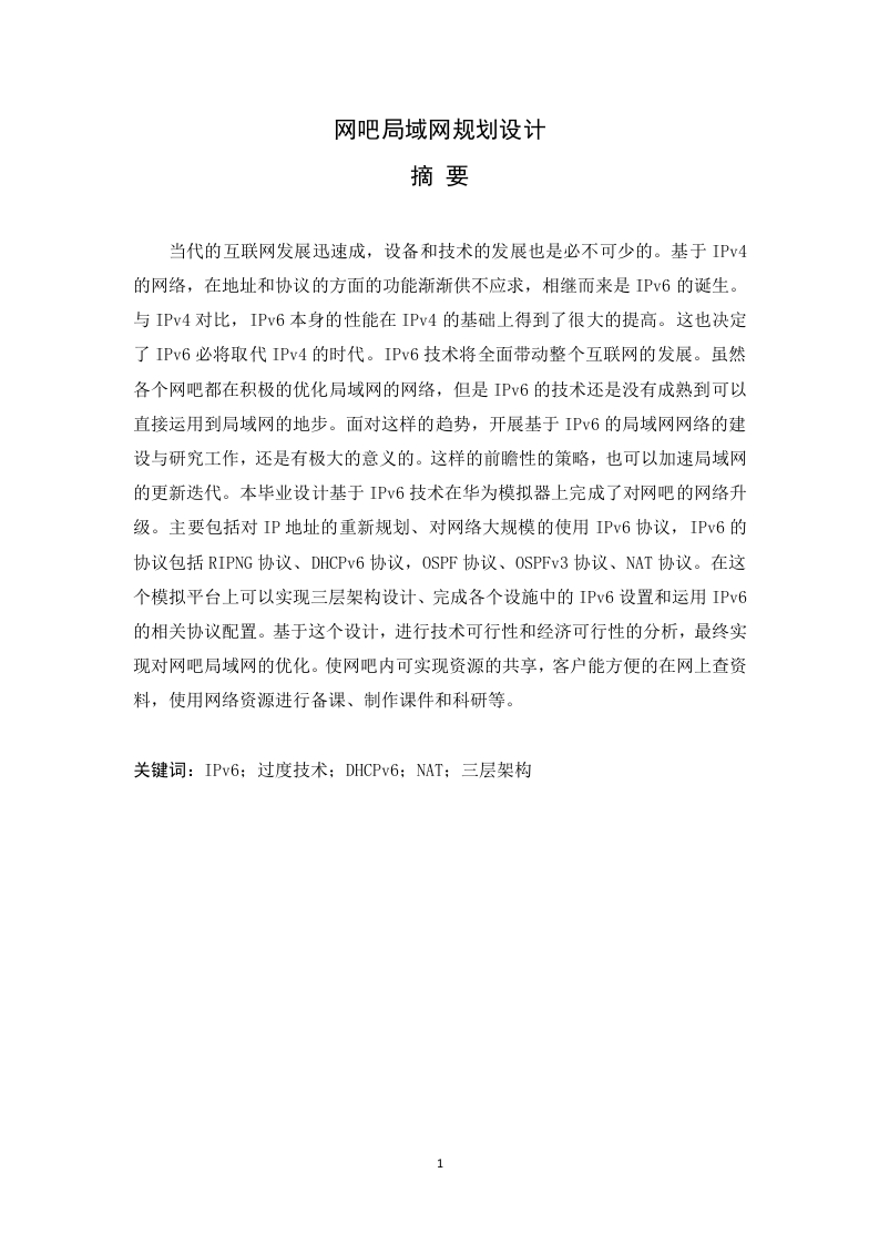 网吧局域网规划设计摘要当代的互联网发展迅速成,设备和技术的发展也是必不可少的。基于IPv4的网络,在地址和协议的方面的功能渐渐供不应求,相继而来是Pv6的诞生。与IPv4对比,IPv6本身的性能在IPv4的基础上得到了很大的提高。这也决定了IPv6必将取代IPv4的时代。IPv6技术将全面带动整个互联网的发展。虽然各个网吧都在积极的优化局域网的网络,但是IP6的技术还是没有成熟到可以直接运用到局域网的地步。面对这样的趋势,开展基于IPv6的局域网网络的建设与研究工作,还是有极大的意义的。这样的前瞻性的策略,也可以加速局域网的更新迭代。本毕业设计基于Pv6技术在华为模拟器上完成了对网吧的网络升级。主要包括对IP地址的重新规划、对网络大规模的使用IPv6协议,IPv6的协议包括RIPNG协议、DHCPv6协议,OSPF协议、OSPFv:3协议、NAT协议。在这个模拟平台上可以实现三层架构设计、完成各个设施中的IPv6设置和运用IPv6的相关协议配置。基于这个设计,进行技术可行性和经济可行性的分析,最终实现对网吧局域网的优化。使网吧内可实现资源的共享,客户能方便的在网上查资料,使用网络资源进行备课、制作课件和科研等。关键词:IPv6:过度技术;DHCPv6;NAT;三层架构目录11.1研究背景1.2研究的目的与意义..2网吧组网需求分析及相关网络技术简介22.1需求分析..2.2IPv6技术简介...333.1局域网拓扑图...33.2局域网三层架构设计...3.3局域网地址规划及原则..4网吧网络实现.…64.1.1公共区-网络的IPv6地址配置64.1.2服务器区域-网络的Pv6地址配置..74.1.3外部网络区域-网络的IPv6和IPv4地址配置.........74.2.2公共区-对访问层的路由器进行配置.…84.3服务器区域的网络配置94.5网网吧中心区域网络配置..105.1测试网吧的连通性10结论1213141绪论1.1研究背景Ipv4的地址缺陷越来越明显,IPv6的出现可以从技术上相应地解决这个问题,也就是一个客户或客户和一个P地址的一一对应。当每一个网上的客户和客户的P地址固定好之后,他在网上所做的所有事情都与他所匹配的固化地址相映射。IPv6在真正的现实生活中有一个非常普遍的应用,那就是在全球的网络之中实现对每一个人的实名。在IPv6的网络中,每一个互联网公民都有一个身份证地址。而当前的全球性网络,因为地址资源的普遍匮乏的原因,没有数量充足的P地址与客户或客户真正的建立出一对一的互联关系,因此很难真正的实现有实名性质的高效互联网网络。IP6技术的推出,预示着网络地址方面的问题可能得到实际意义上的解决,随之而来的是全球性的网络得到极大的发展。就目前而言,IPv4的理论和技术已经相当成熟。而IPv6的技术与理论还需要更广泛更深层的研究和实施。在确保当前基于IPv4的网络正常运行的同时,还要对IPv6新技术的研究和实验加快前进的步伐。从目前的IPv4网络过渡到未来的IPv6网络,还是需要进行不断地探索。当然在前进的道路上会有不少阻碍。就说现在的网络设备的条件不但制约着IP6协议的迅速发展,而且用于制造芯片的单晶硅资源也供应不上。针对上面的问题,目前已经有科学家在讨论,是否可以用纳米级的工程陶瓷完全替代单晶硅制造芯片等一系列的设备硬件。如果在将来能研发出合适的新型材料用以替代单晶硅制造芯片等一系列的设备硬件,降低设备成本,那么将会推进IPv6协议的进一步推广和应用。1.2研究的目的与意义通过组网方案与设计使局域的网络更加合理与安全。针对IPv6的地址优势解决用户IP地址数量问题。在Ipv6的环境下实现运营路由器和地址规划的升级,更好服务于局域网络的运行。基于Pv6的局域网研究,实现局域高级网络化,并通过统一的出口接入因特网,使师生可通过互联网获取资源和信息。在网吧内可实现资源的共享,可以在文件服务器上装入大量的电子书籍、课件、教案以及各种多媒体素材等资源,使客户能方便的在网上查资料,使用网络资源进行备课、制作课件和科研等。学生也可以通过网络,方便地查阅书籍、下载课程资料等,进行个性化自主学习。