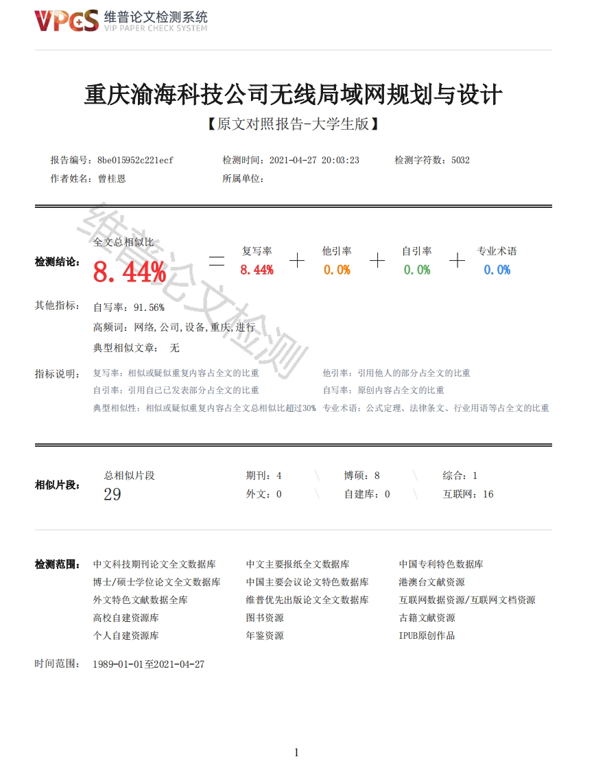 维普论文检测系统/IP PAPER CHECK SYSTEM重庆渝海科技公司无线局域网规划与设计【原文对照报告-大学生版】报告编号:8be015952c221ecf检测时间:2021-04-2720:03:23检测字符数:5032作者姓名:曾桂恩所属单位:全文总相似比复写率他引率自引率专业术语检测结论:8.44%8.44%0.0%0.0%0.0%其他指标:自写率:91.56%高频词:网络,公司,设备,重庆,进行典型相似文章:无指标说明:复写率:相似或疑似重复内容占全文的比重他引率:引用他人的部分占全文的比重自引率:引用自己已发表部分占全文的比重自写率:原创内容占全文的比重典型相似性:相似或疑似重复内容占全文总相似比超过30%专业术语:公式定理、法律条文、行业用语等占全文的比重总相似片段期刊:4博硕:8综合:1相似片段:29外文:0自建库:0互联网:16检测范围:中文科技期刊论文全文数据库中文主要报纸全文数据库中国专利特色数据库博士/硕士学位论文全文数据库中国主要会议论文特色数据库港澳台文献资源外文特色文献数据全库维普优先出版论文全文数据库互联网数据资源/互联网文档资源高校自建资源库图书资源古籍文献资源个人自建资源库年鉴资源IPUB原创作品时间范围:1989-01-01至2021-04-27维普论文检测系统VIP PAPER CHECK SYSTEM原文对照颜色标注说明:■自写片段■复写片段(相似或疑似重复)口引用片段(引用)■专业术语(公式定理、法律条文、行业用语等)人工智能学院毕业设计替代类(项目策划方案)方案名称:重庆渝海科技公司无线局域网规划与设计姓名:曾桂恩指导教师:周科中国重庆2021年05月重庆渝海科技公司无线局域网规划与设计一、项目背景1.1项目概况重庆渝海科技公司是位于重庆市渝中区的一个中型企业,该公司主要业务是将国内的电子设备产品销售到国外。重庆渝海科技公司现有1278人,公司主要分为6大部门,分别是经理部、财务部、技术部、安保部、人事部、宣传部。公司还有员工食堂和员工宿舍,能够供员工休息和娱乐,随着公司员工人数的不断增加和公司规模的不断扩大,该公司迫切的需要稳定可靠的网络。一方面为了满足员工上网的需求,另一方面为了能够提高员工们的办公效率,促进信息交流,即需要组建一个高性能的、安全可靠的网络体系。1.2项目目标现根据企业具体项目需求,通过现有计算机网络技术为重庆渝海科技公司进行网络规划,根据公司需求设计一个高效且稳定的内部网络,并设计出相应的网络拓扑图以及具体的设备选型,从而实现公司内部信息的传输和数据的共享。1.3项目定位重庆渝海科技公司的经理部作为公司最高管理部门要求在任何时候都能够通过网络去访问控制其他部门,并且作为公司最重要的部门之一,不仅要求数据信息的可靠与稳定,还要求设备产品不会出现故障,财务部作为公司管理财务金融活动的部门,是要求任何时候都不能出现故障问题,需要从技术和设备选型上都要做出冗余备份的计划安排,技术部与安保部通过网线接入到公司整体网络规划中,技术部作为公司的技术保障与维修部门,需要独立的作为一个整体部门去管理运行,一旦公司出现故障或者问题,能够及时的处理应对问题,安保部也作为一个整体去运行规划,每天24小时不间断的保证公司的安全,接入到安保部门的网络能够通过视频监控的方式呈现出来,人事部负责公司新员工的招聘管理培训等一系列活动,需要为公司将来的发展提供新鲜的血液和能量,在经理部的审核过后可以通过网络与外部网络连接,和宣传部一起宣传公司的良好发展前景,进行相关的专业人员的招聘与发掘,食堂和宿舍作为公司为员工提供的休闲娱乐产所,是整体独立的,但也需要接入到整体网络架构之中,能够随时为员工们提供可靠且稳定的网络。二、项目需求分析2.1网络安全需求2.1.1经理部2维普论文检测系统VIP PAPER CHECK SYSTEM经理部是重庆渝海科技公司的大脑与核心,掌控着整体公司运行与规划,作为最重要的大脑,需要从经理部出发和考虑整体公司的网络规划与发展,能够方便经理去更加方便快捷高效的管理整体公司,使得公司朝着更加良好稳定的方向发展。2.1.2财务部财务部负责管理公司所有员工的工资收入与公司账目,要求数据与网络的可靠性是最高的,任何时候都要能够保证财务部的网络稳定运行,并且不会产生虚假错误的信息数据。2.1.3技术部技术部为公司的稳定运行提供了保障,单独的拥有一个部门,是为了即使出现网络问题,技术部也能够维护与整理,在进行网络规划时应当独立的去进行划分。2.1.4安保部安保部需要24小时不间断的保障公司所有员工的人生安全和财务安全,作为一个整体部门去划分,使得公司园区所有地方都处于视频可监控的范围内,并且视频录像能够保存两年,安保部后台需要多考虑安装一些数据保存的设备。2.1.5人事部与宣传部人事部和宣传部可以作为一个整体去规划设计,但是两者又是相互独立的部门,分别划分到不同的LAN下,人事部需要为公司招聘专业相关的新员工,新鲜血液的注入是公司良好稳定运行的基础,宣传部接入到网络中进行公司形象的宣传,提高公司的知名度。2.1.6食堂与宿舍员工食堂与宿舍拥有独立的大楼,两者属于同一片区,各自有一栋楼,网络连接规划时可通过一个点接入到整体网络中,两者也是利用不同VLA进行划分,从而保证了两个部门独立安全,通过加入AP设备满足员工休闲娱乐时方便